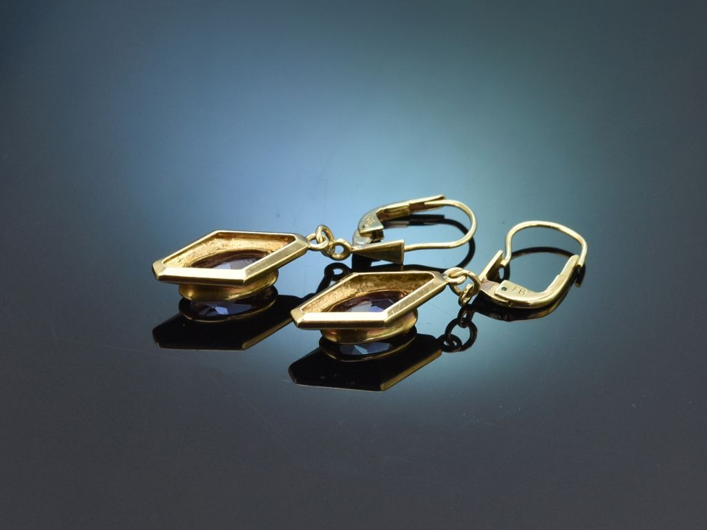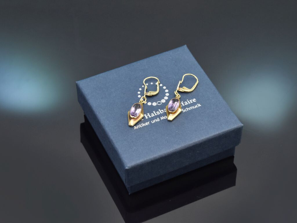 Die stilvollen Ohrringe bestehen aus klassischen Klappbügelbrisuren, an denen eine rautenförmige Abhängung schwingt, die mit betonten Kanten und einer feinen Oberflächen-Struktur akzentuiert ist. Im Zentrum sitzt je ein wunderbar violett leuchtender, oval facettierter Amethyst von zusammen ca. 1,8 Carat. Die Amethyste kommen durch den warmen Goldton der Fassung besonders schön zur Geltung.