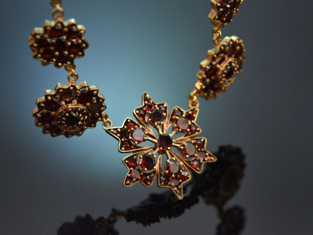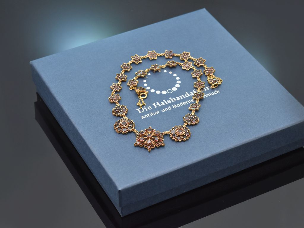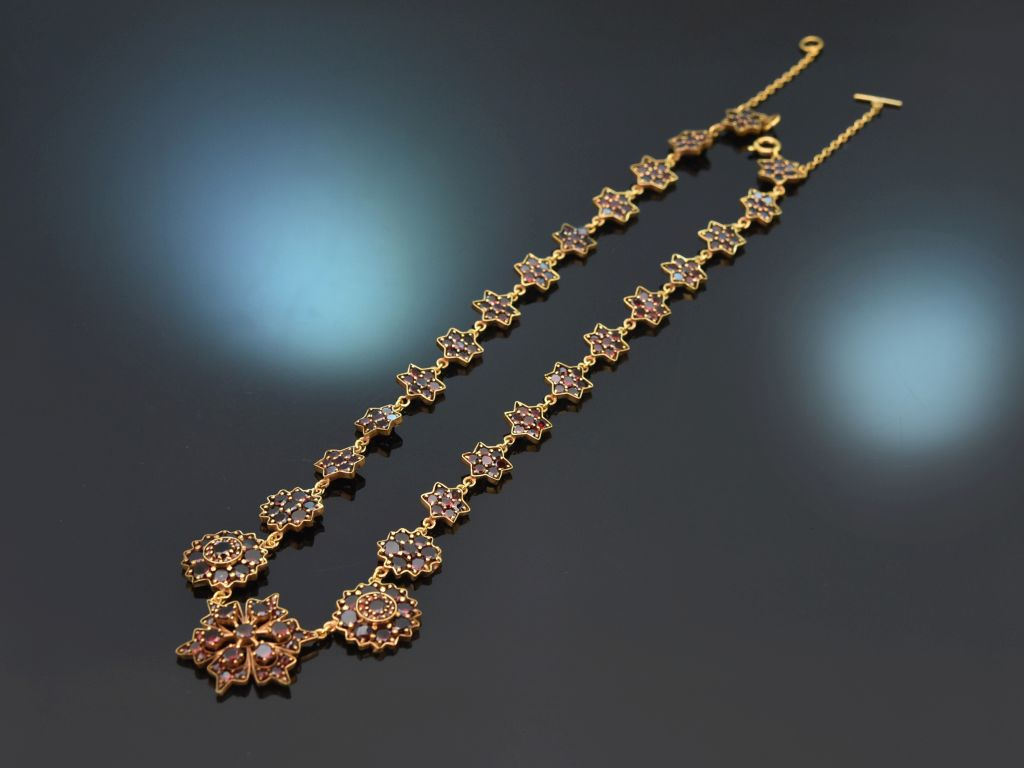 Das bezaubernde Collier ist vollständig mit weinrot funkelnden Granaten in Rosen- und Tafelschliff besetzt. Es setzt sich aus blüten- und sternförmigen Gliedern zusammen, die über feine Ösen miteinander verbunden sind und zur Mitte hin größer werden. So ergibt sich ein charmanter und detailreicher Entwurf, der durch das Spiel aus tiefem Rot und warm glänzender Vergoldung besticht.