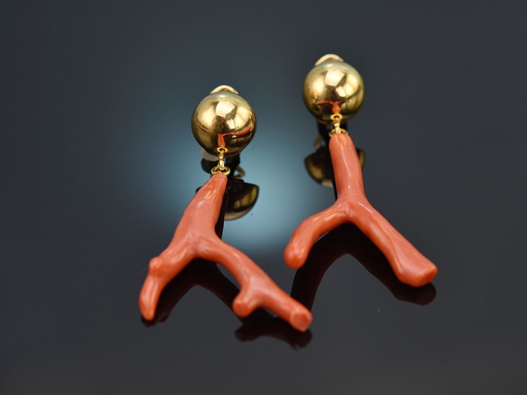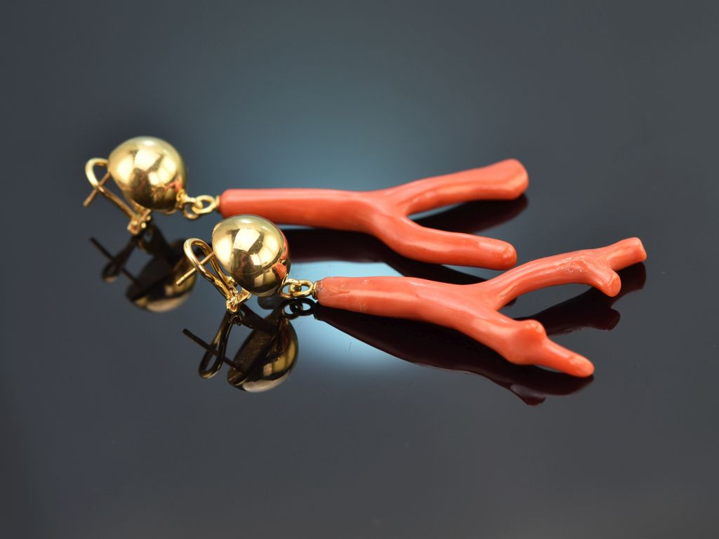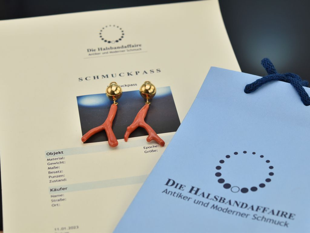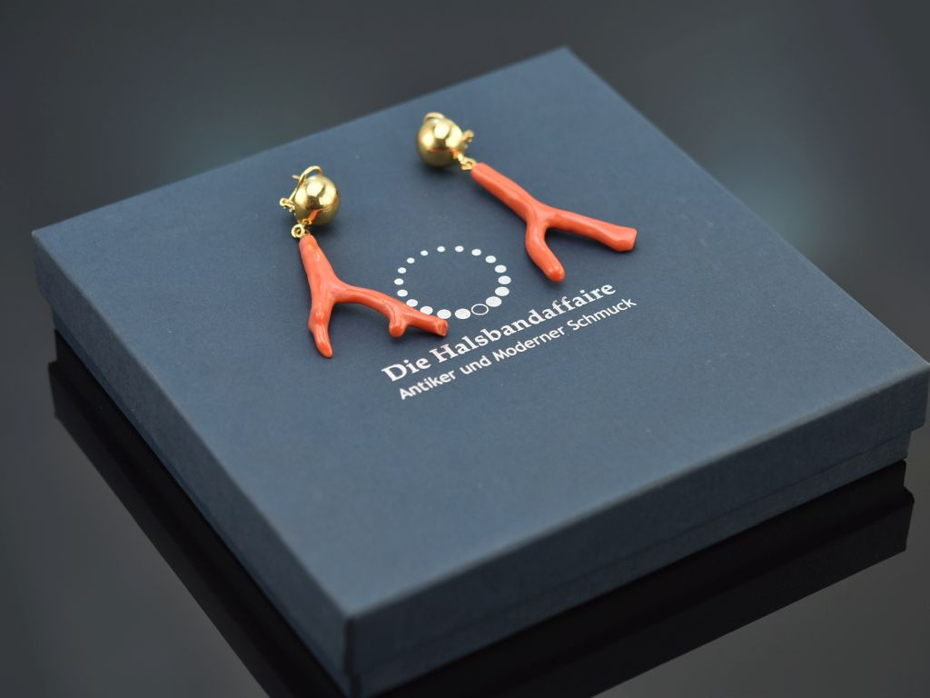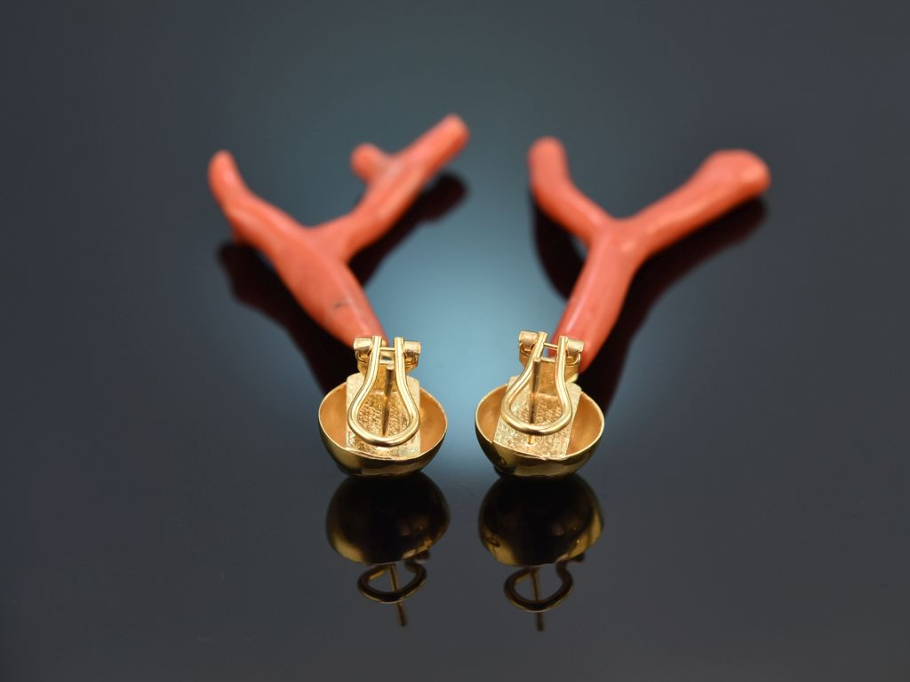 An halbkugelförmigen Brisuren sitzt je ein großer, kräftiger Korallenast. Die natürlich gewachsenen Korallen aus Torre del Greco besitzen eine wundervolle, gleichmäßig rote Farbe und eine schöne Oberflächenqualität.