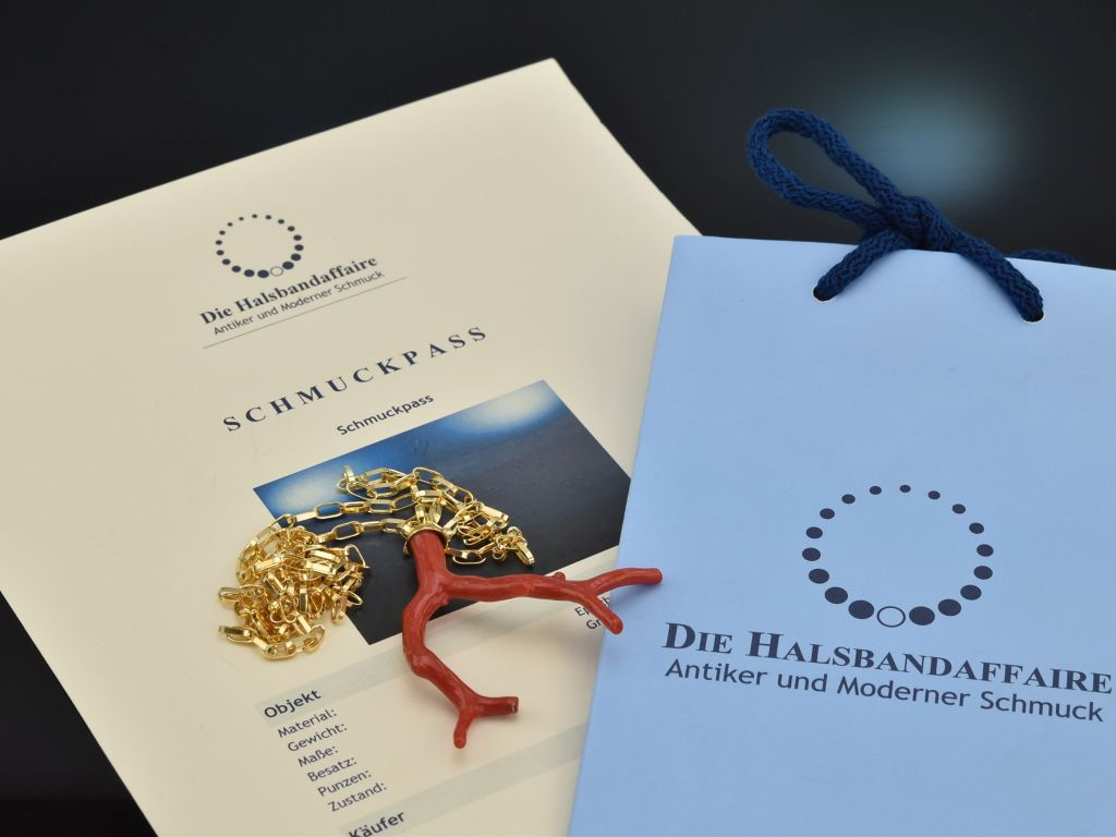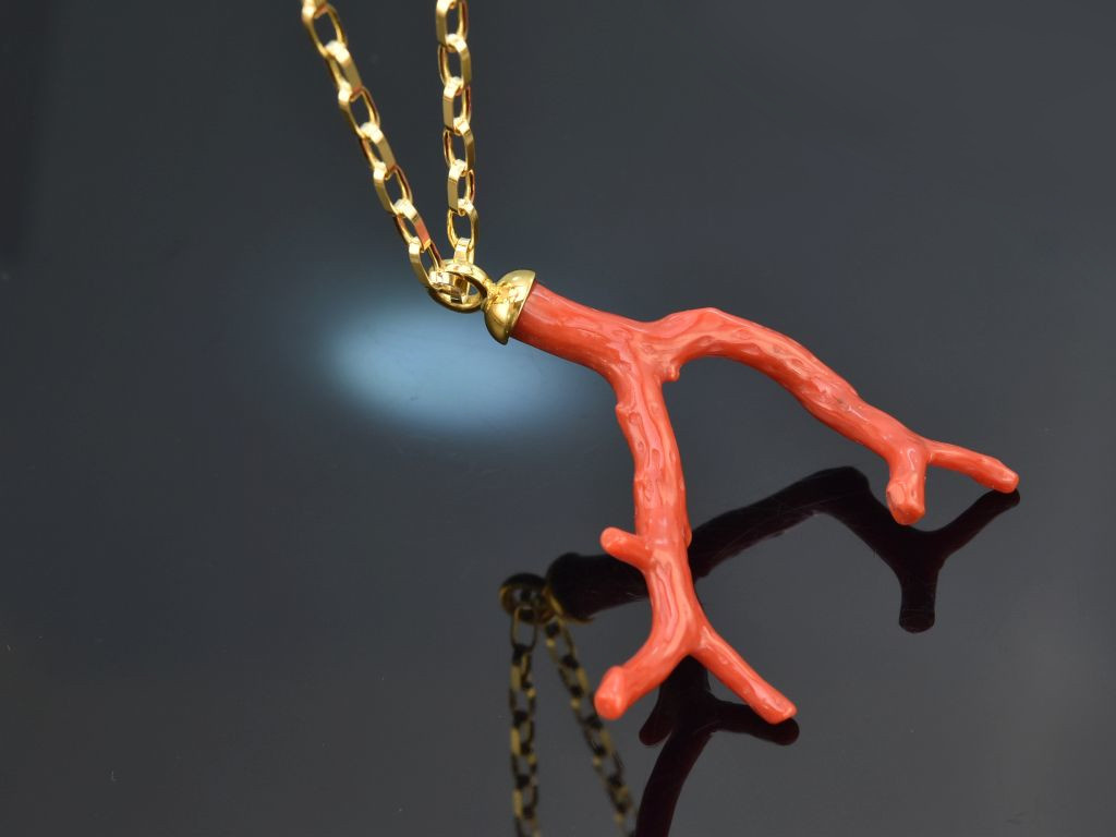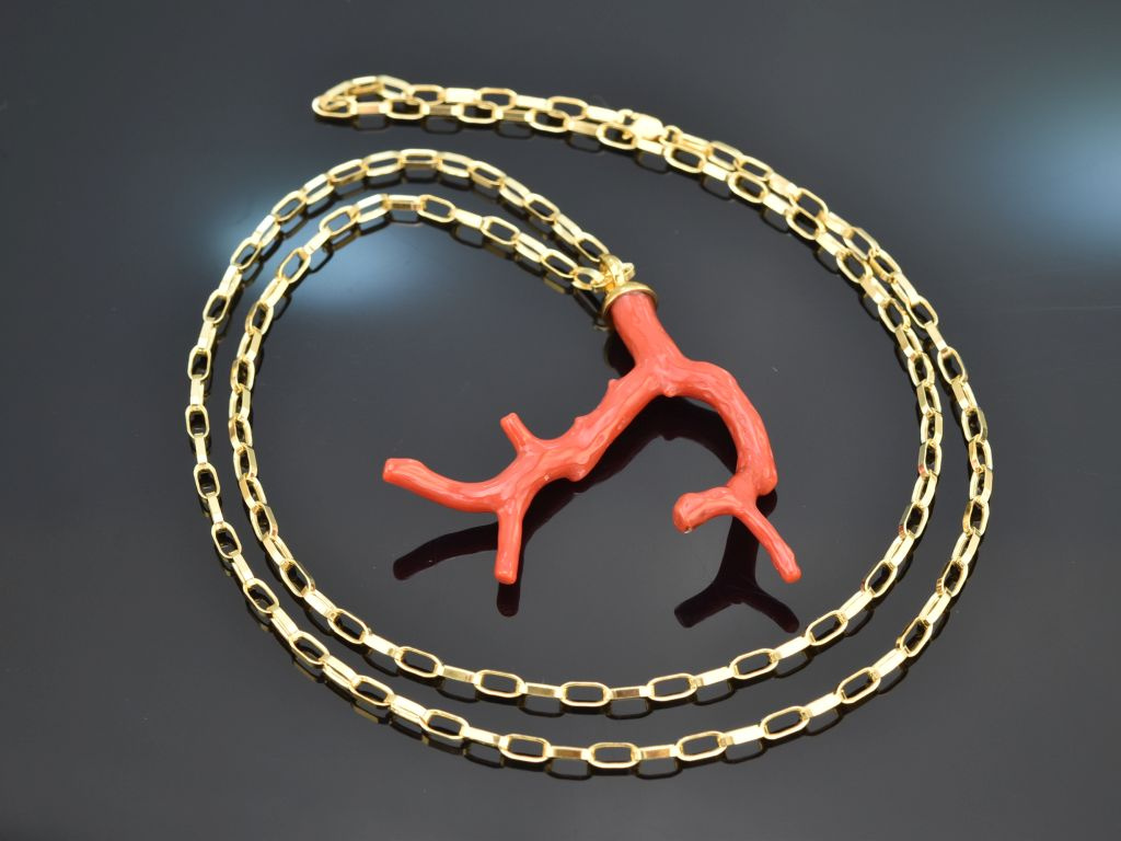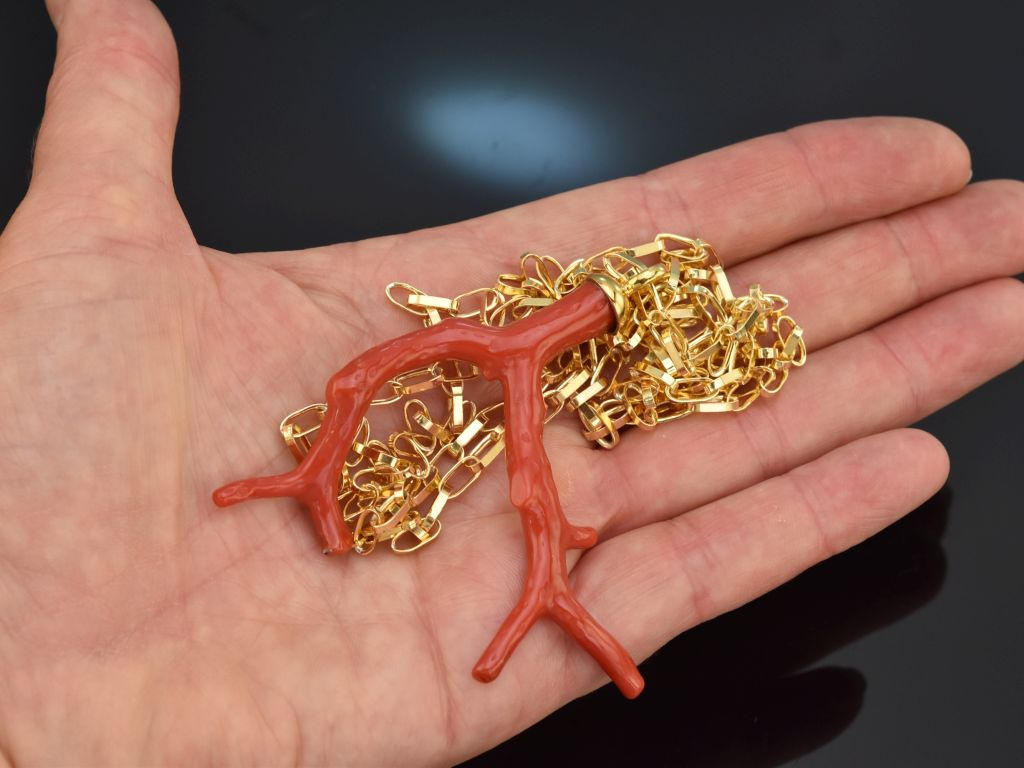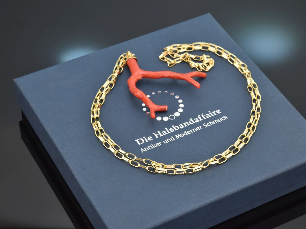 Der dicke Korallenast Anhänger ist aus echter, natürlich gewachsener und unbehandelter Mittelmeer Koralle und besticht durch sein glänzendes sattes Rot und seine extravagante Form. Er hängt an einer großen vergoldeten Ankerkette die sich durch einen einfachen Karabinerhaken öffnen läßt.