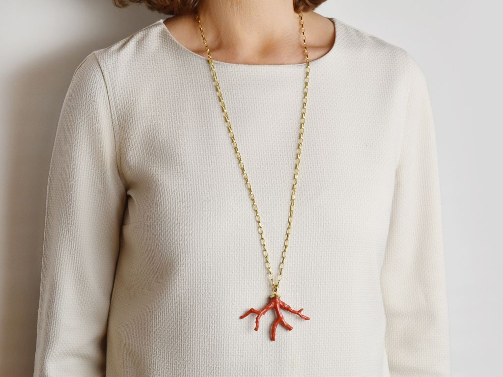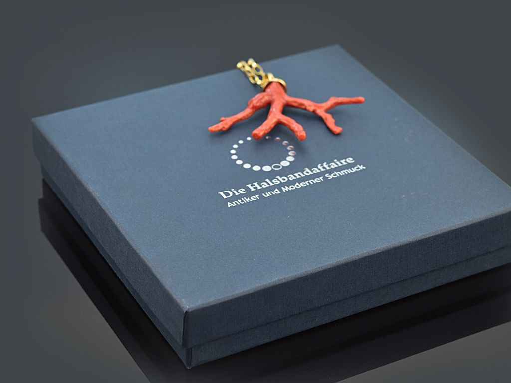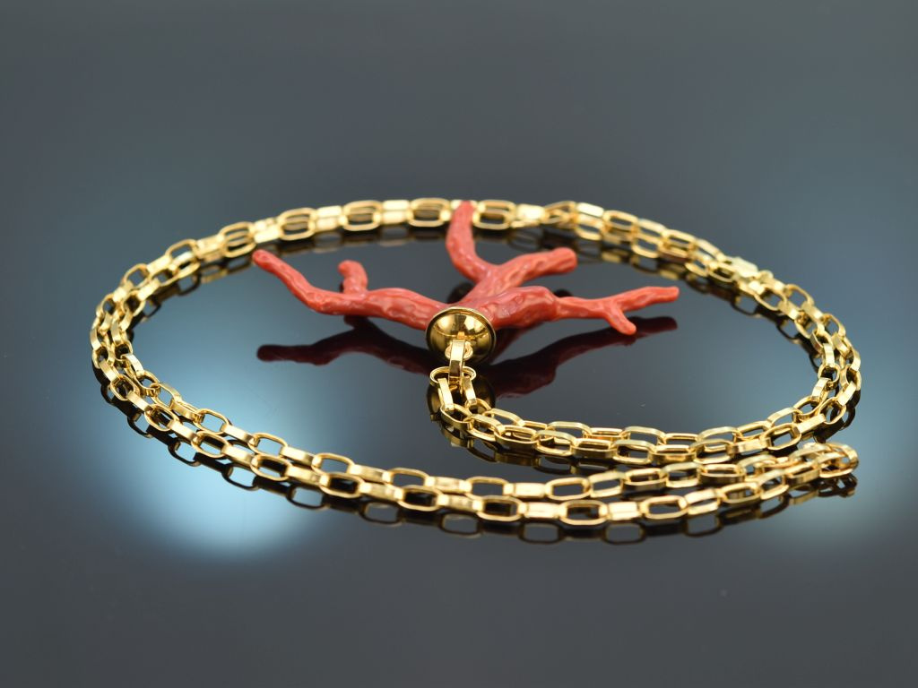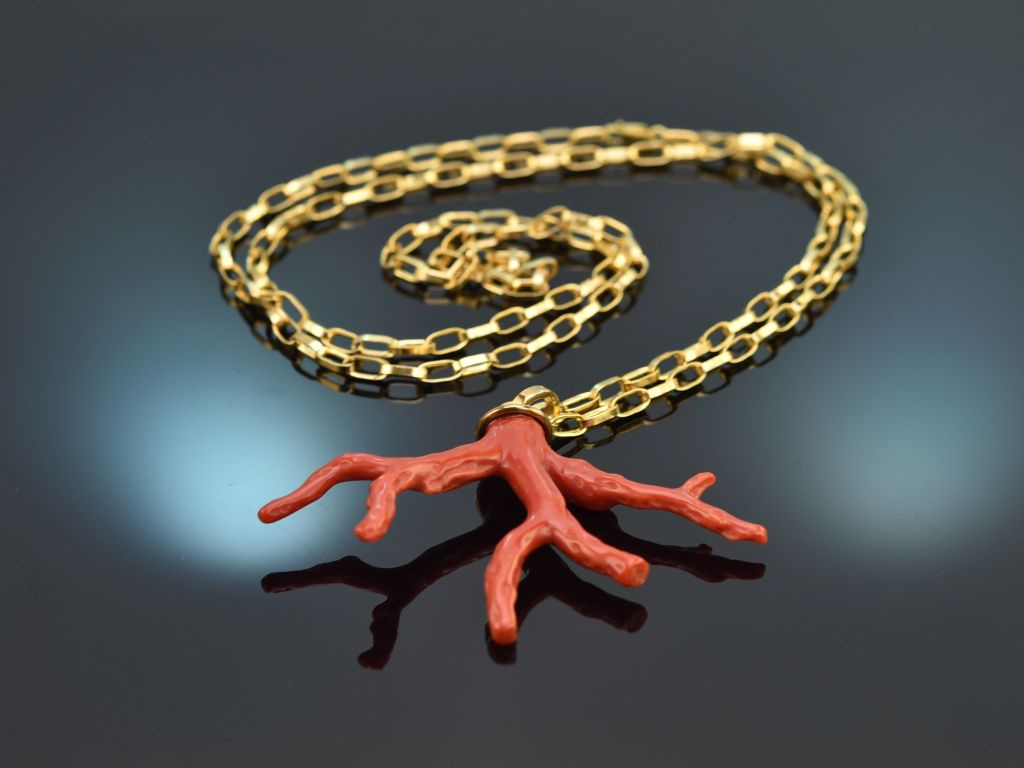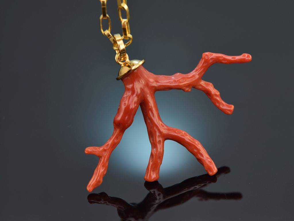 Der schöne große Anhänger besteht aus echter, natürlich gewachsener Mittelmeer Koralle und besticht durch sein sattes, glänzendes Rot sowie seine aparte organische Form. Er sitzt an einer langen vergoldeten Ankerkette, die sich durch einen einfachen Karabinerhaken sicher öffnen und schließen lässt.