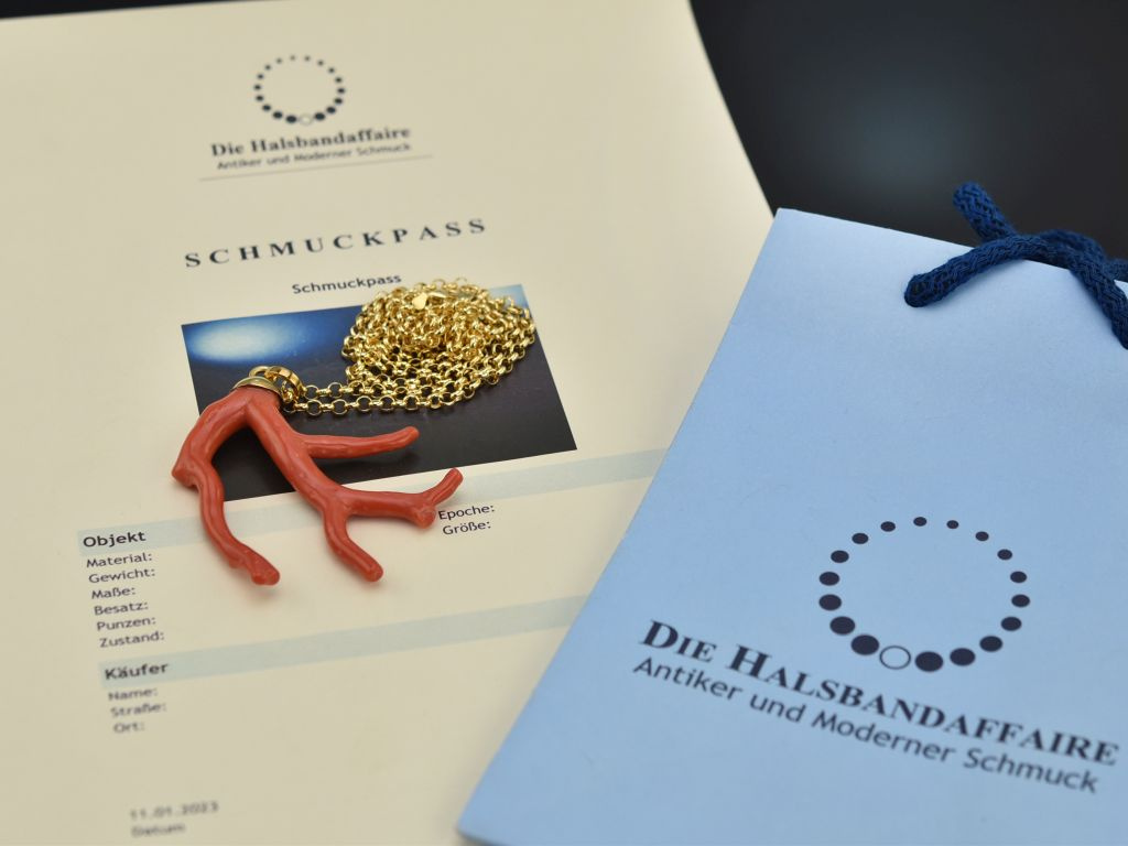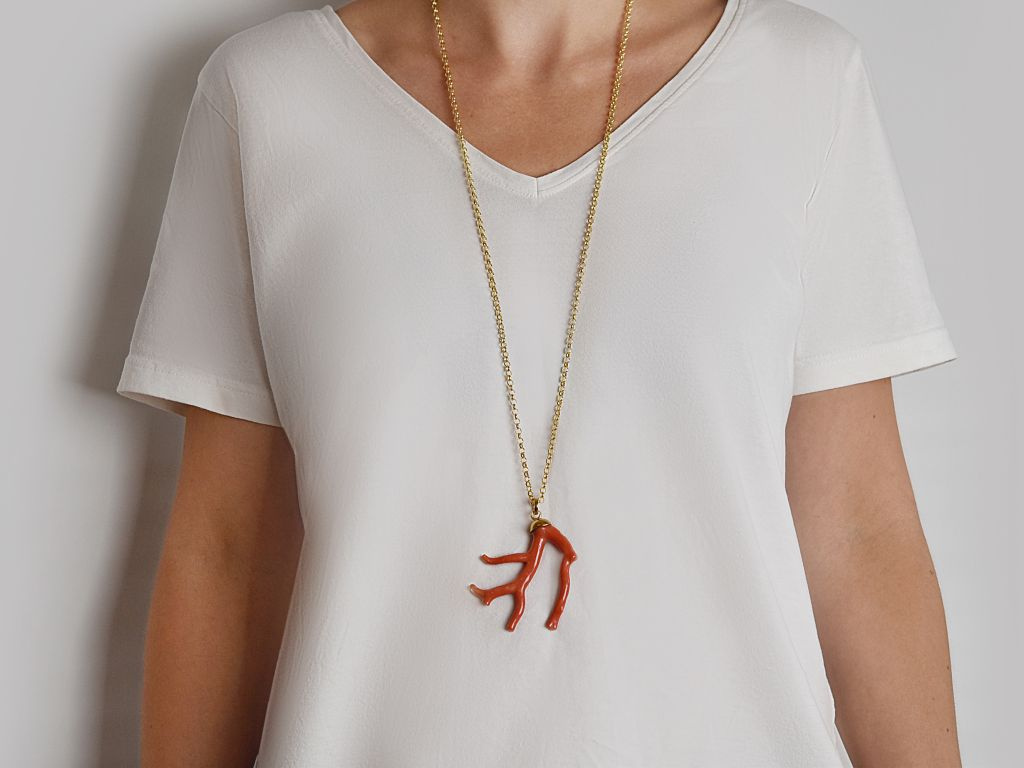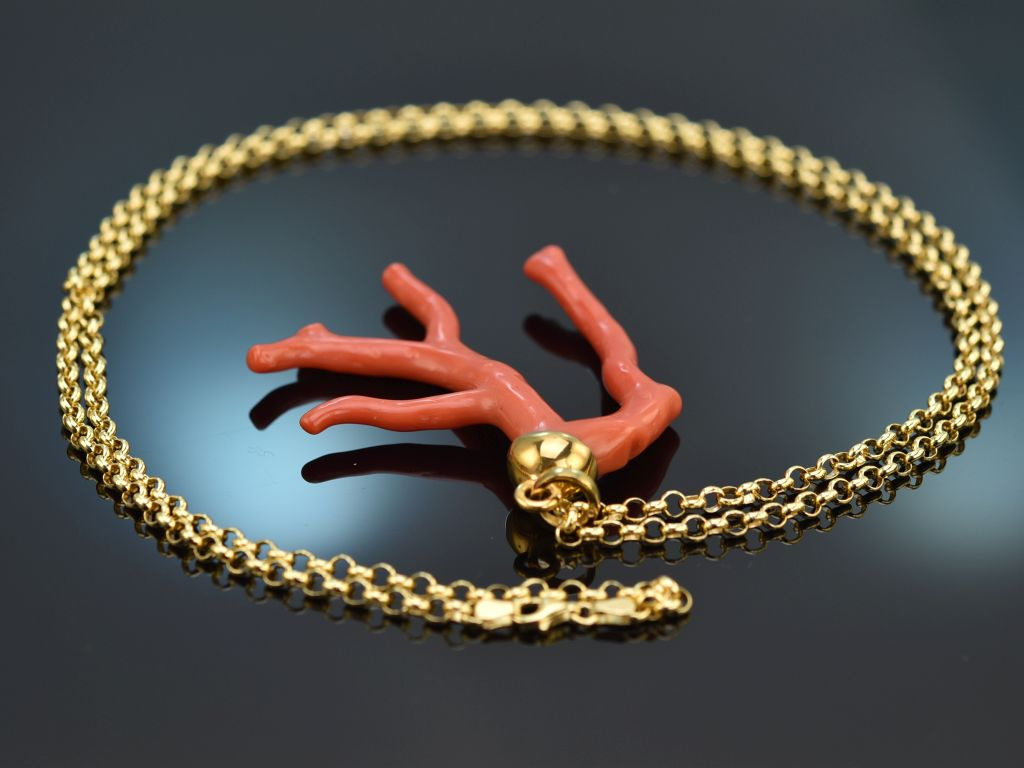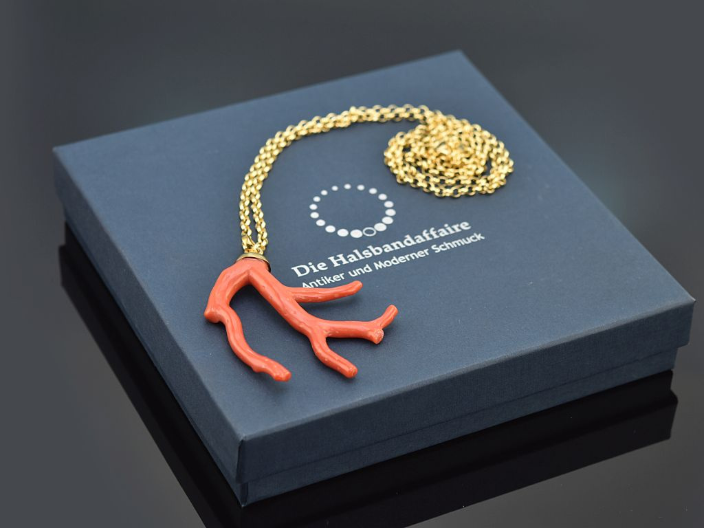 Der dicke Korallenast Anhänger ist aus echter, natürlich gewachsener und unbehandelter Mittelmeer Koralle und besticht durch sein glänzendes sattes Rot und seine extravagante Form. Er hängt an einer großen vergoldeten Erbskette die sich durch einen einfachen Karabinerhaken öffnen lässt.