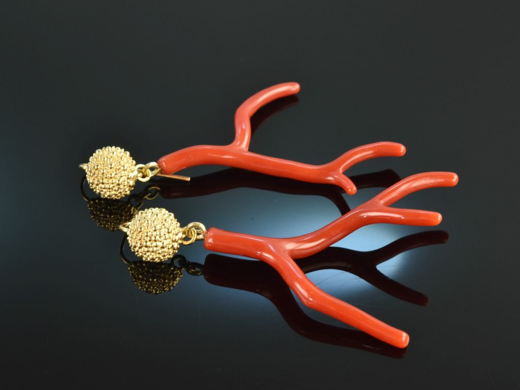 Schicke Ohrringe aus vergoldeten Sterlingsilber 925 (gestempelt und garantiert) mit großen echten Astkorallen aus dem Mittelmeer. Die natürlich gewachsenen Mittelmeerkorallen sind poliert und haben eine wunderschöne rote Farbe. Sie sind ein absolutes Highlight unter den Sommeraccessoires. - Der Volksmund sagt, Koralle schütze vor bösen Blicken! Die attraktiven Ohrhänger wurden in unserem Atelier entworfen und hergestellt.