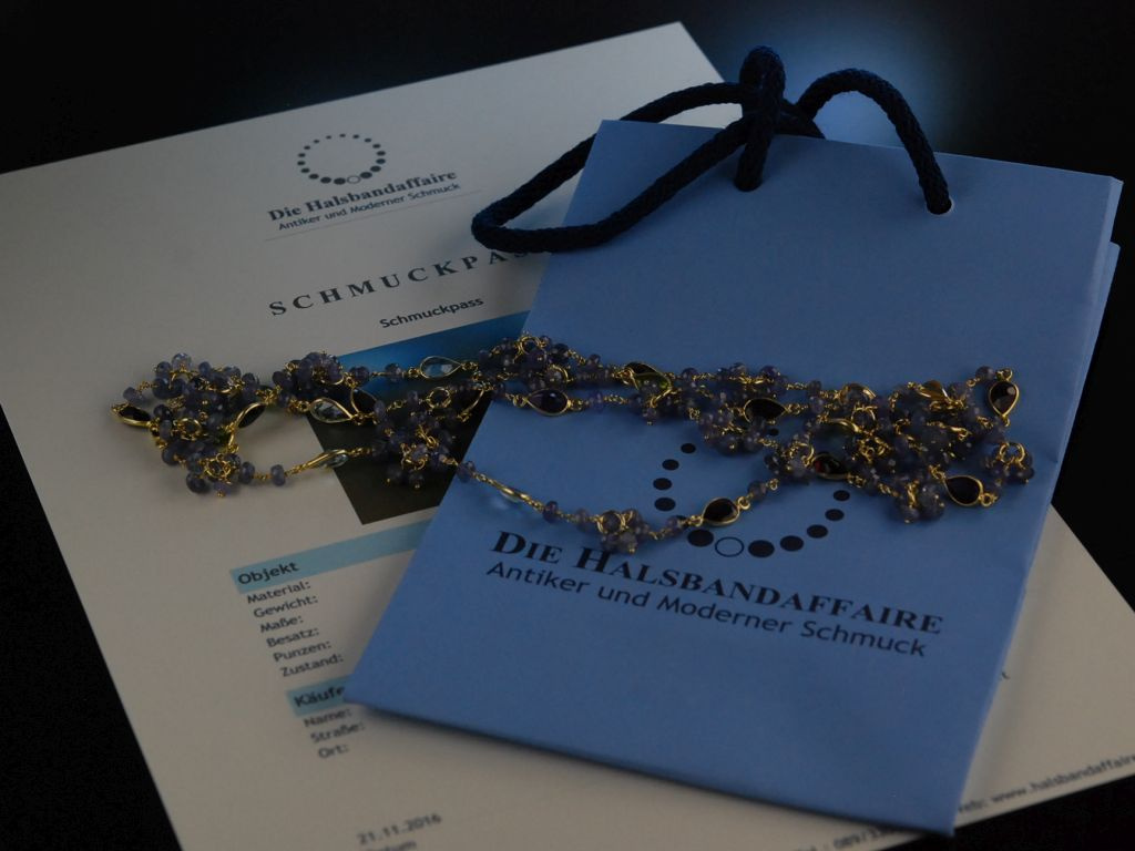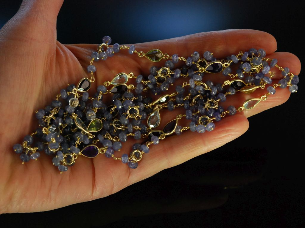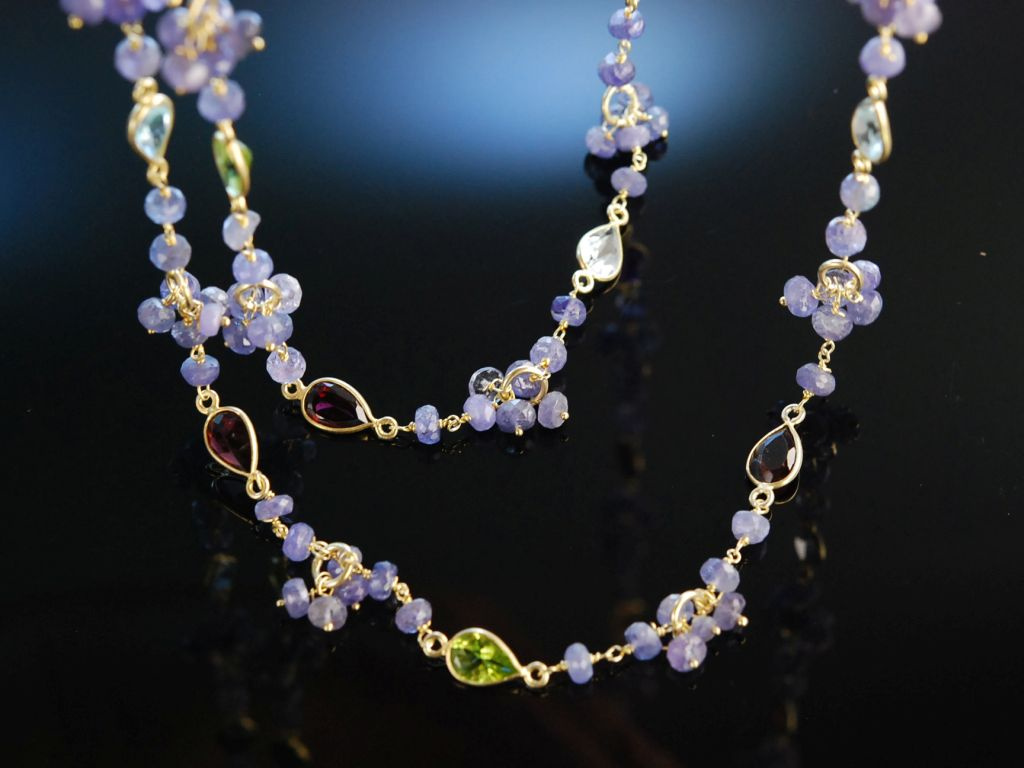 Wundervolle lange Farbsteinkette / Sautoir aus vergoldetem Sterlingsilber 925 (geprüft und garantiert) aus kettenartig verbundenen, blauen Saphiren in facettierter Linsenform. Zwischen die Saphire sind facettierte, tropfenförmige Topase, Amethyste, Lemon Citrine, Granate und Peridots in Zargenfassung gesetzt. Besonders schöne Akzente setzten größere Ösen mit jeweils vier beweglich eingehangenen Saphiren. Die endlose Kette kann sehr schön frei zu allen Stilen kombiniert werden und sowohl einfach lang oder doppelt getragen werden. Das zarte Saphirblau wirkt mit den bunten Farbakzenten der gefassten Edelsteine besonders attraktiv.