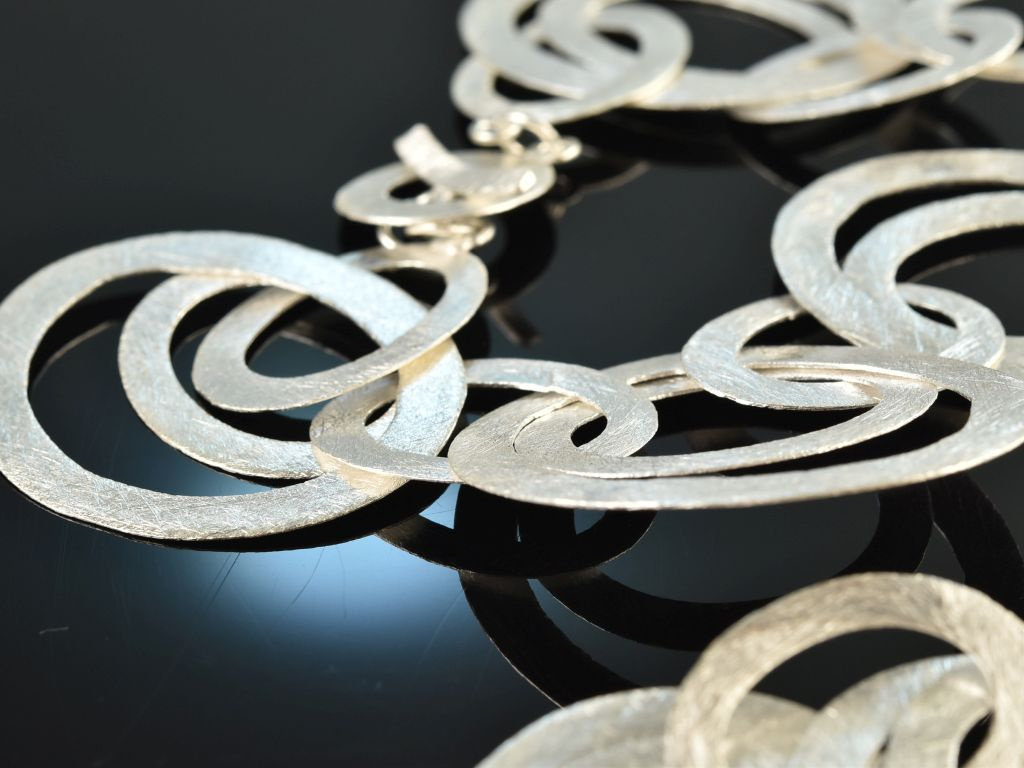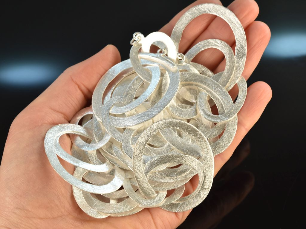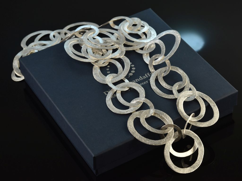 Die lange Kette aus großen gebürsteten Ringgliedern ist ein richtiger Eyecatcher: Die ovalen Glieder in drei verschiedenen Größen bilden ein rhythmische Dynamik.