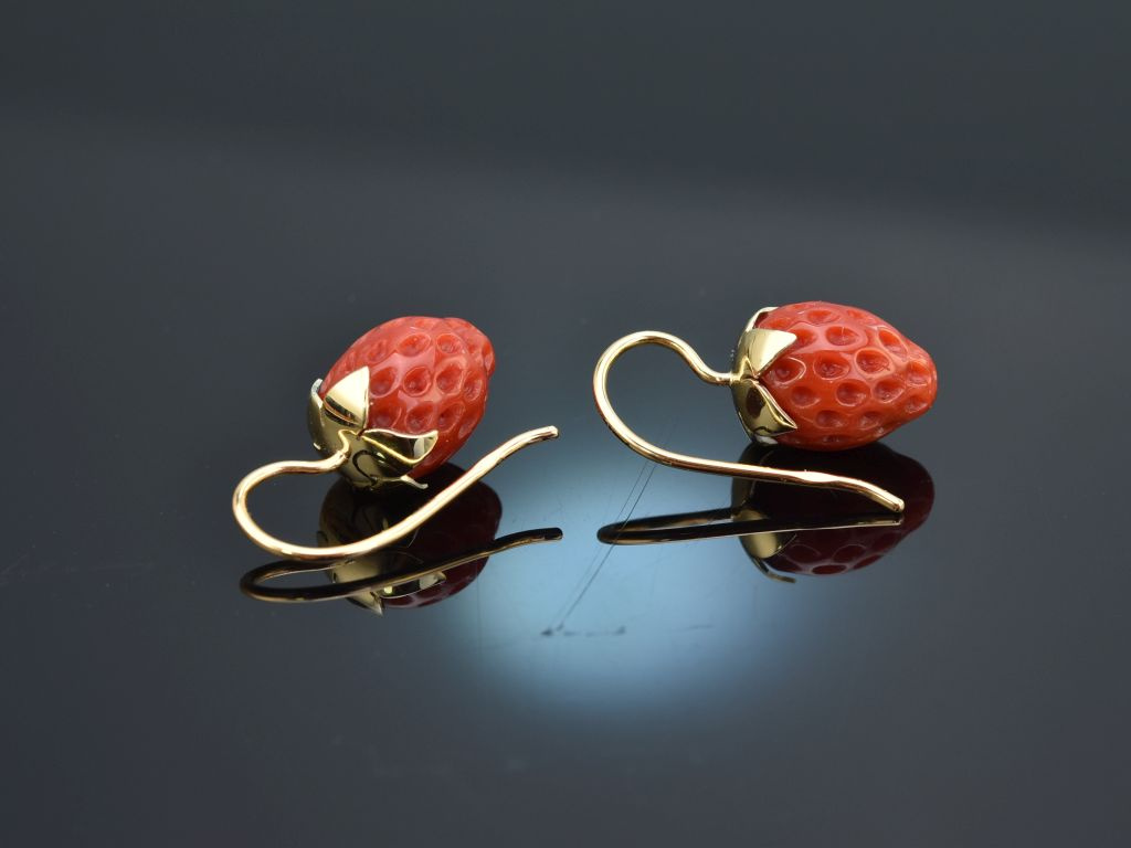 Die hübschen Ohrringe sind mit echten, natürlich gewachsenen Mittelmeerkorallen von schöner roter Farbe besetzt. Die hochwertig von Hand gearbeiteten Korallen in Erdbeerform sind an gelbgoldenen Hakenbrisuren mit Blattwerkdekoration befestigt und baumeln charmant und sicher am Ohr.