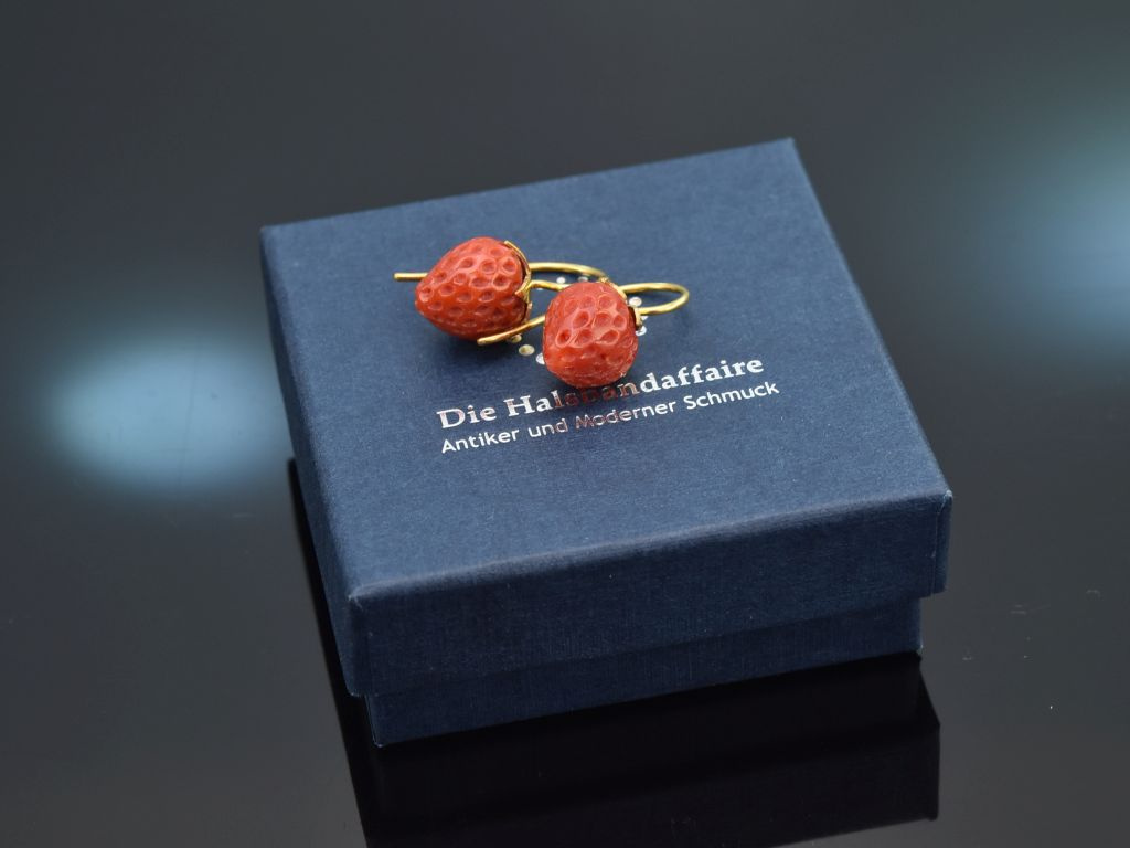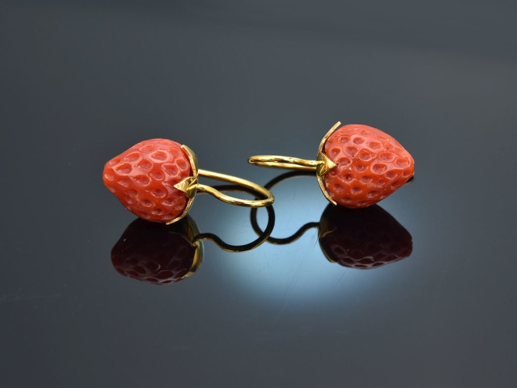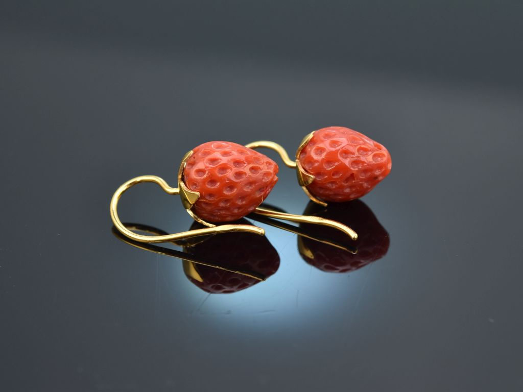 Die Ohrringe sind mit echten, natürlich gewachsenen Mittelmeerkorallen von satter roter Farbe besetzt. Die hochwertig von Hand geschnittenen Korallen in Erdbeerform werden wunderbar ergänzt durch Hakenbrisuren mit typischen Blattwerk-Dekorationen. Sie baumeln charmant und sicher am Ohr.
