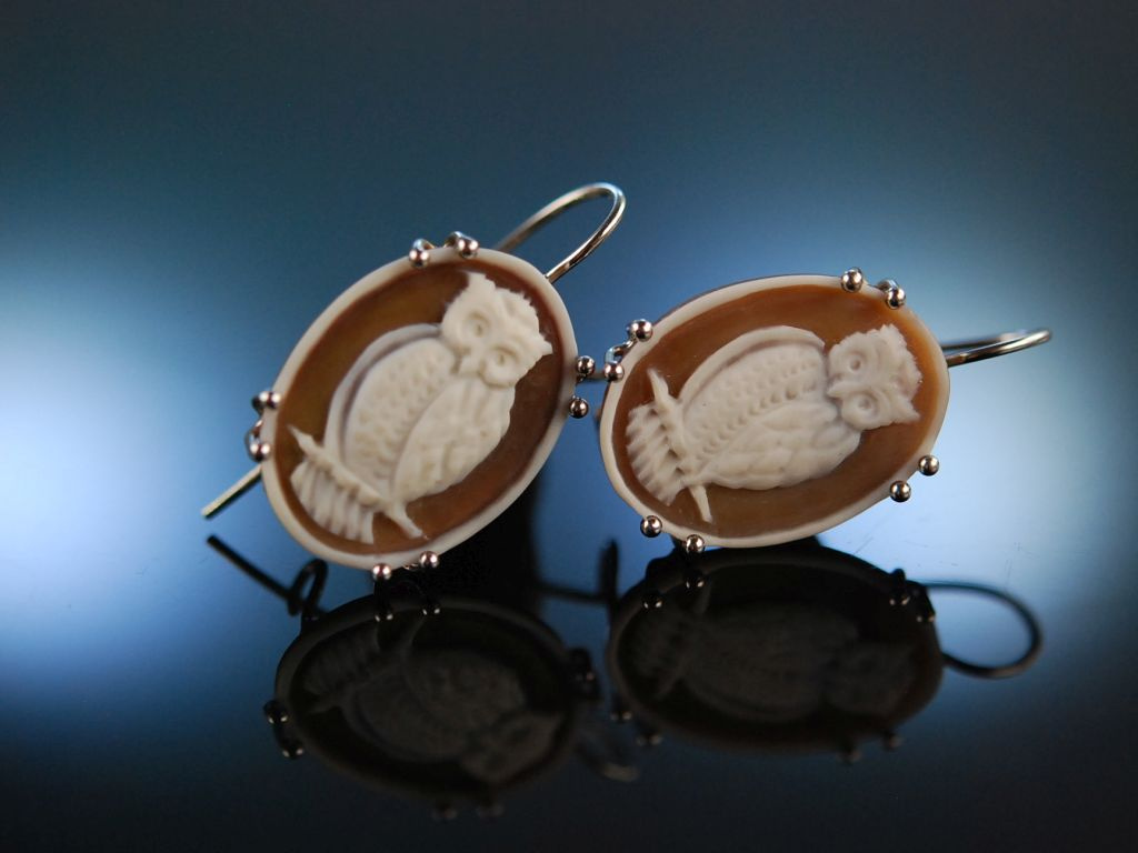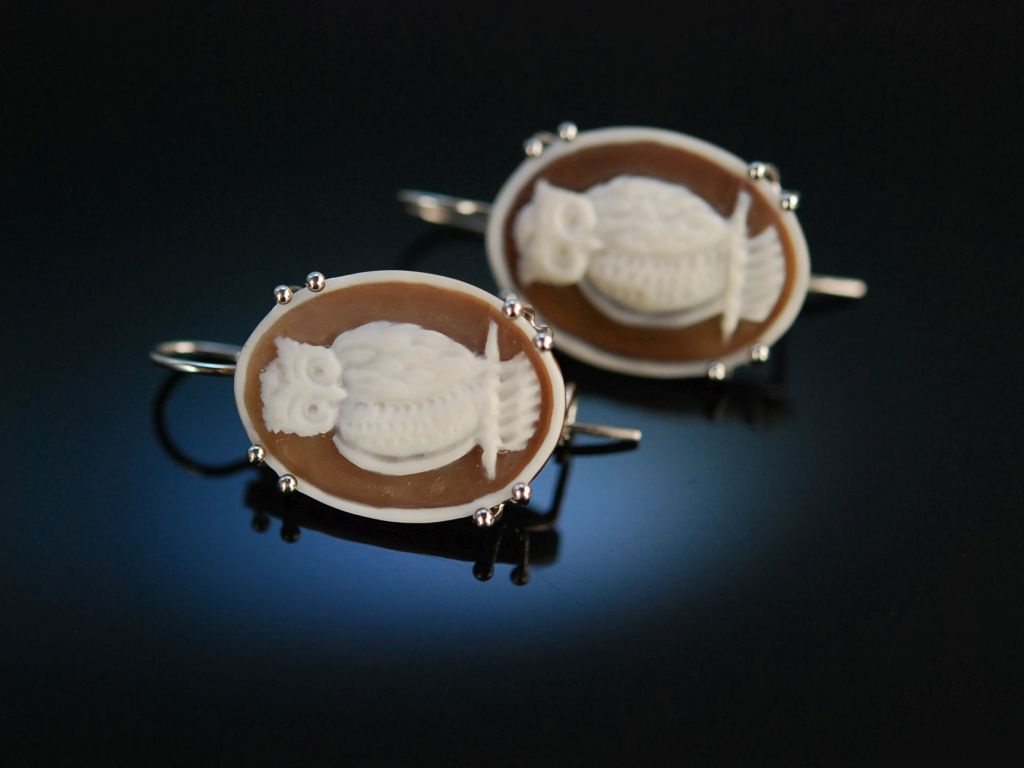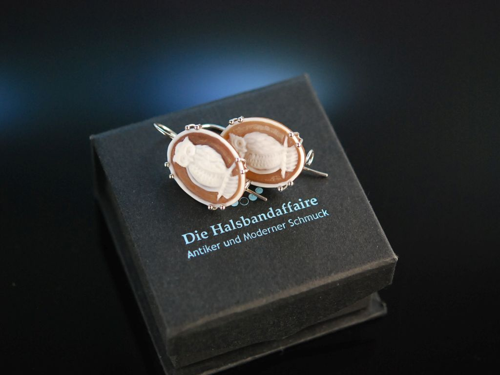 Hinreißende Ohrhänger aus Sterlingsilber 925 (gestempelt und garantiert) besetzt mit hochovalen Muschelkameen. Die schönen Kameen in feinem braunen Farbton mit entzückenden Eulendarstellungen werden jeweils von acht filigranen Silberkrappen gehalten. Die Ohrhänger sitzen durch die geschwungenen Brisuren mit zusätzlichen Sicherungshaken elegant und sicher am Ohr. Der außergewöhnliche Ohrschmuck lässt sich sowohl klassisch als auch leger kombinieren und passt sehr gut zu Tracht und Dirndl.