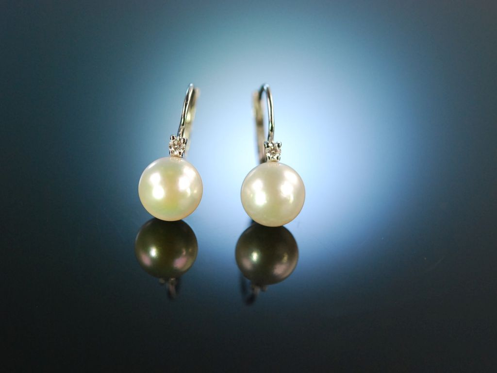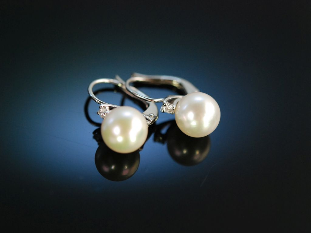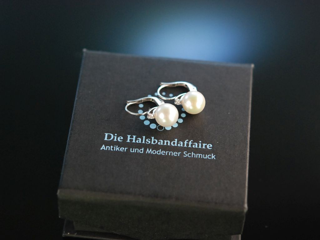 Klassisch elegantes Paar Perlenohrringe aus Weißgold 750 / 18 Kt (gestempelt und garantiert) mit je einer hübschen, runden Akoja Zuchtperle mit feinem weißen Lüster. Gekrönt werden die Perlen von zwei funkelnden Diamanten in Brillantschliff von zus. ca. 0,10 Carat. Die Diamanten liegen im ausgezeichneten oberen Farb- und Reinheitsbereich: Sie sind von feinem Weiß (G-H) und sehr schöner Qualität (SI1). Durch ihre rückseitigen Bügelbrisuren sitzen die Ohrringe frei schwingend und dennoch sicher am Ohr. Die zeitlosen Ohrhänger dürfen in keinem Schmuckkästchen fehlen und sind sowohl zur Abendgarderobe als auch wunderbar im Alltag zu tragen.