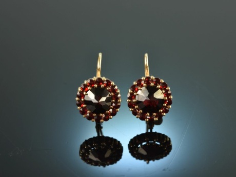 Die hübschen Ohrringe sind mittig mit je einem rund facettierten tiefroten Granaten besetzt, um den vierzehn weitere rund facettierte Granaten rosettenförmig angeordnet sind.