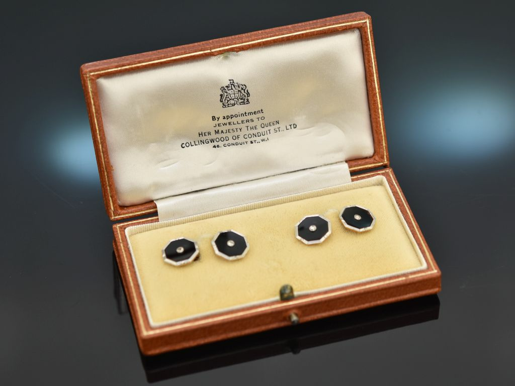Edles Paar englischer Manschettenknöpfe mit Onyx und Diamanten im Original-Etui, gefertigt aus Platin und Gelbgold 750 / 18 Kt (gestempelt und garantiert).