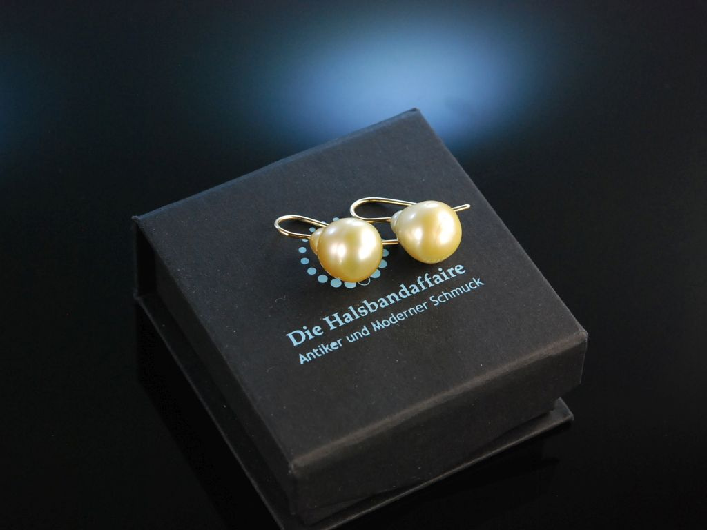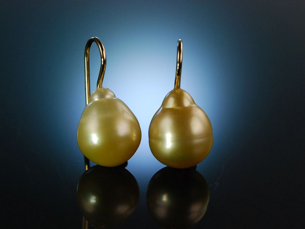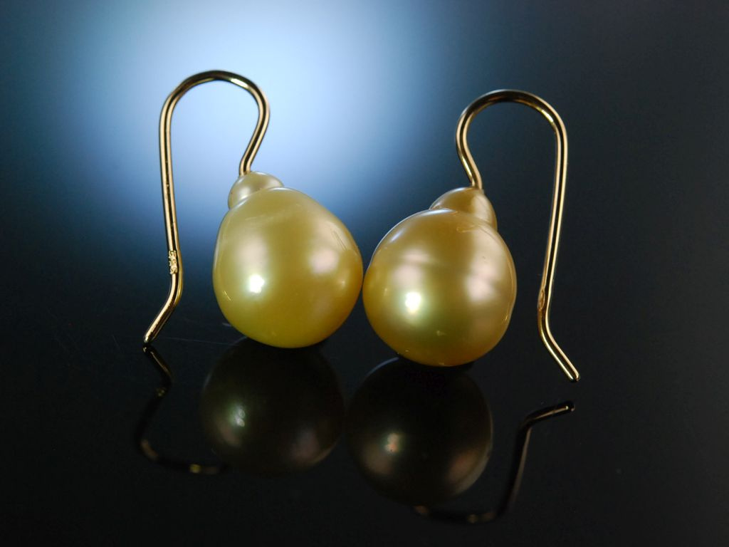 Wunderschönes klassisches Paar Ohrringe aus Gelbgold 585 / 14 Kt (gestempelt und garantiert) mit je einem Südseezuchtperlen Tropfen mit fein schimmerndem goldfarbenen Lüster. Durch die geschwungenen Hakenbrisuren sitzen die Ohrhänger attraktiv und sicher am Ohr. Die exquisiten und zeitlosen Ohrringe können hervorragend zu verschiedenen Stilen kombiniert werden.