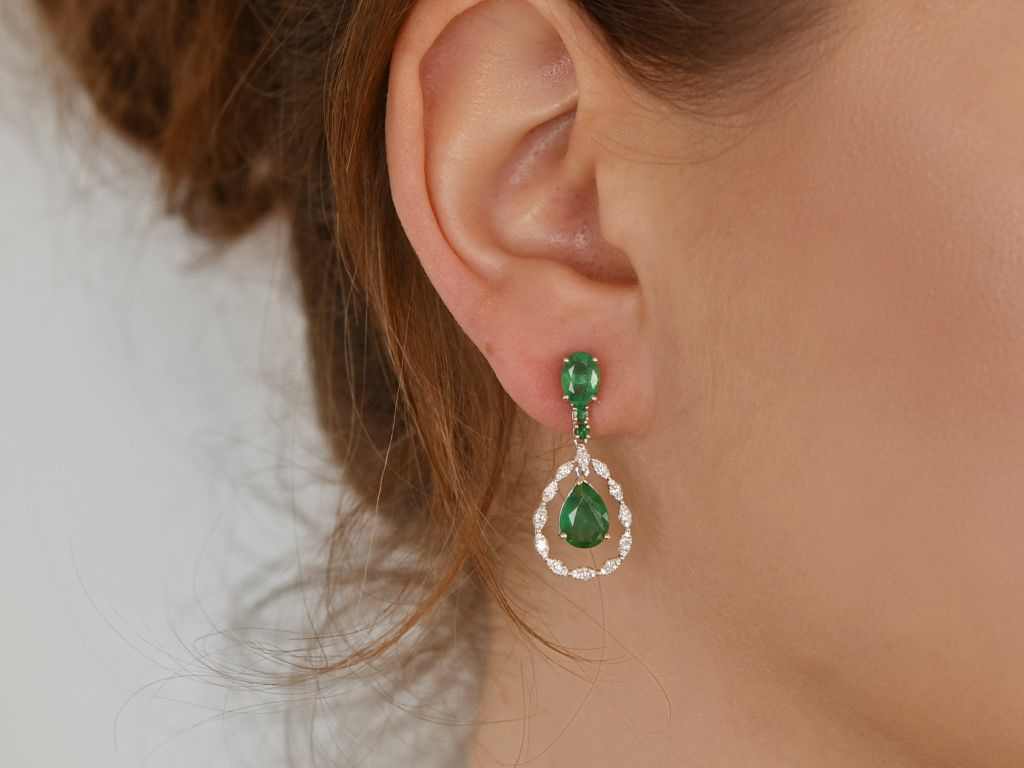 Die eleganten Ohrringe sind mit acht rund, oval und tropfenförmig facettierten Smaragden, sowie 72 funkelnden Diamanten in Brillantschliff besetzt. Die Smaragde sind von feiner Qualität und Farbe und haben ein Gewicht von zus. 4,1 Carat. Die Diamanten liegen im schönen Qualitätsbereich (G-H, VS1-VS2) und haben ein Steingewicht von zus. 0,54 Carat.