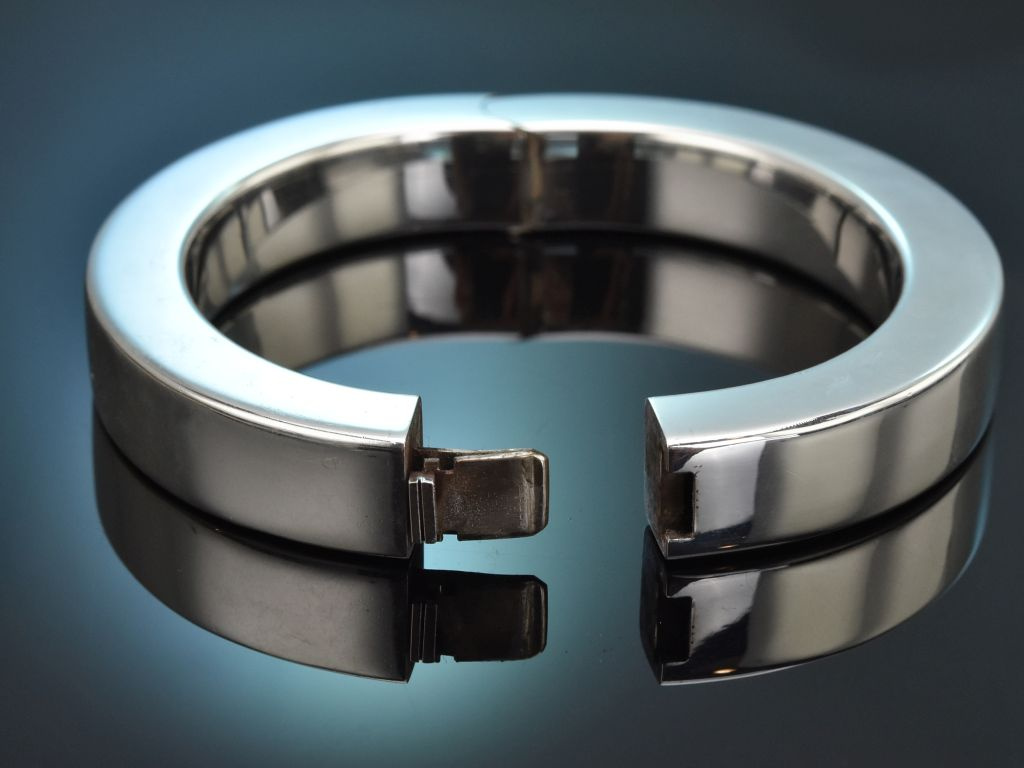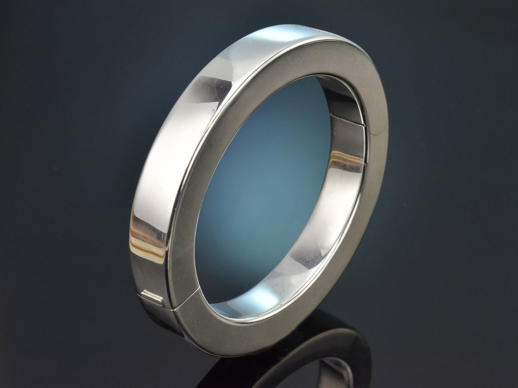 Der leicht ovale Armreif aus Sterlingsilber überzeugt durch sein klares und schlichtes Design, sowie durch seine schön glänzend polierte Oberfläche. Er lässt sich mittels eines versteckten Kastenschlosses öffnen und schließen und sitzt sicher am Handgelenk.
