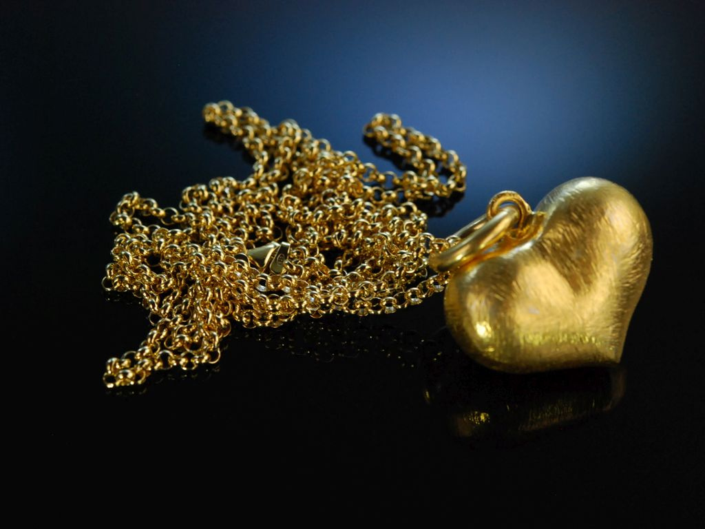 Entzückender und vollplastisch gearbeiteter Herz-Anhänger aus vergoldetem Sterlingsilber 925 (gestempelt und garantiert) an einer langen Kette in Erbsmuster. Auf dem Herzanhänger, der mit einer großen und massiven Öse ausgestattet ist, sitzt ein reizender Froschkönig gestaltet in grün schimmerndem Email. Rückseitig wird die Kette mit einer sicher funktionierenden Karabinerschließe geschlossen. Die wundervolle Anhängerkette ist ein märchenhaftes Accessoire zu vielen verschiedenen Stilen.