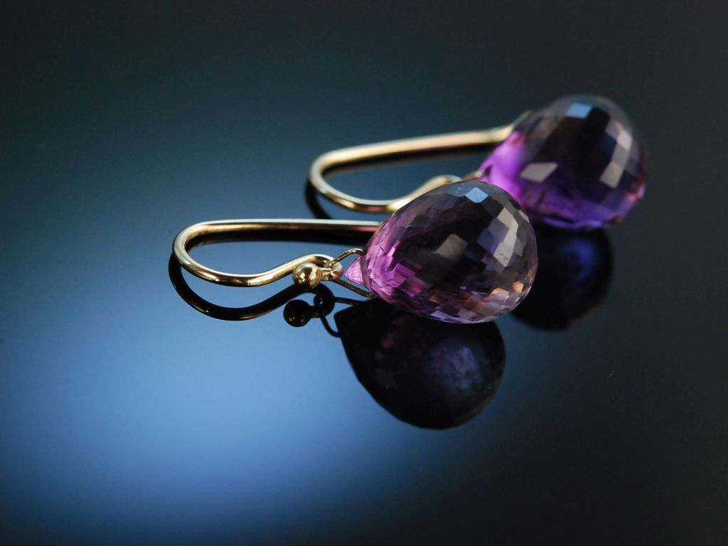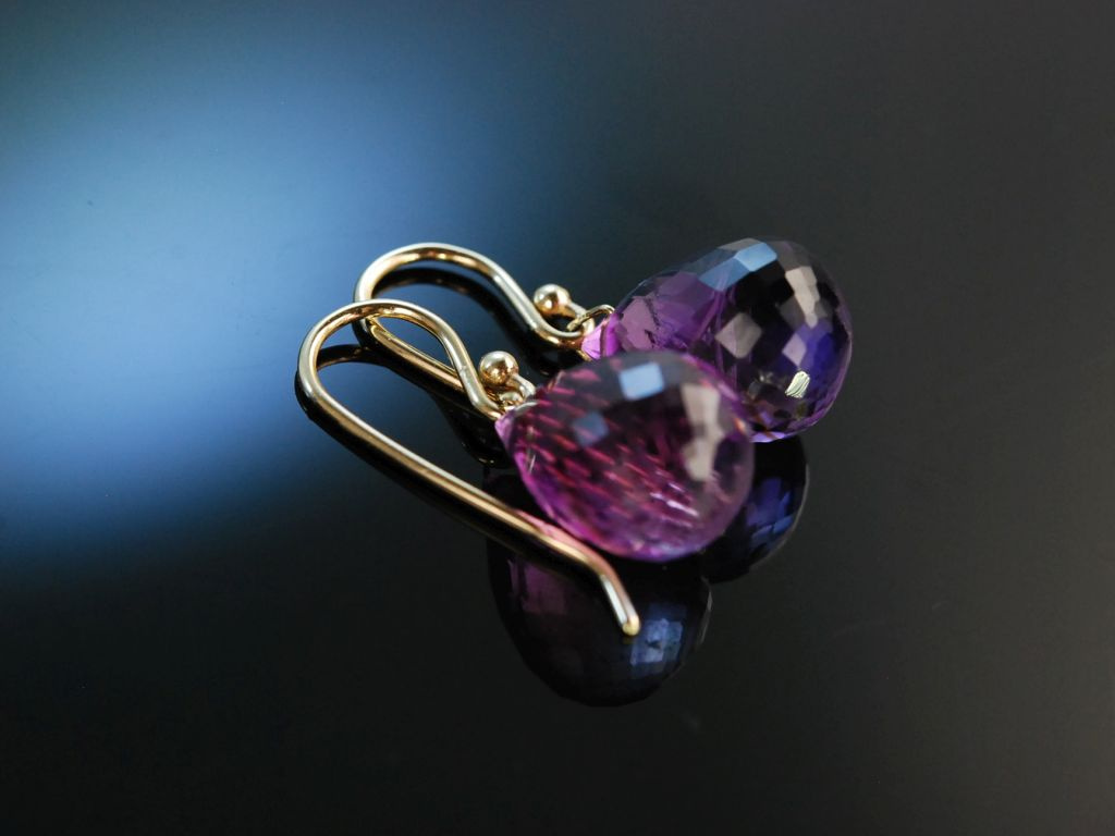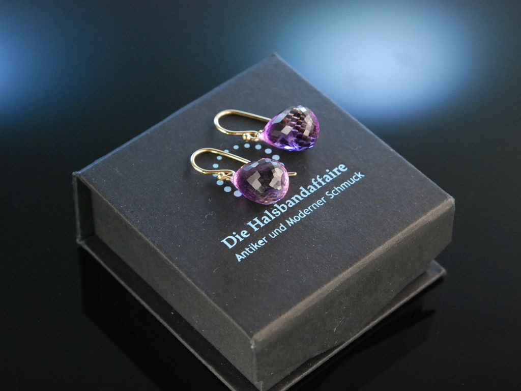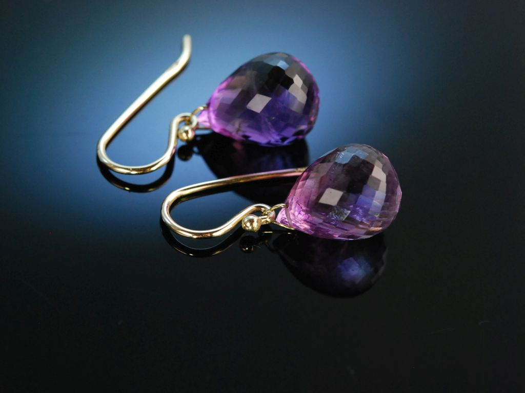 Wunderschönes klassisches Paar Ohrhänger mit je einem Tropfen aus facettiertem Amethyst an einer Hakenbrisur aus Gelbgold 585 / 14 Kt (gestempelt und garantiert). Die Amethyst Pendeloques sind von intensiver violetter Farbe und haben eine wunderbar gleichmäßige Qualität. Durch ihr schlichtes und qualitätvolles Design können die aparten Ohrringe hervorragend zu verschiedenen Stilen kombiniert werden.
