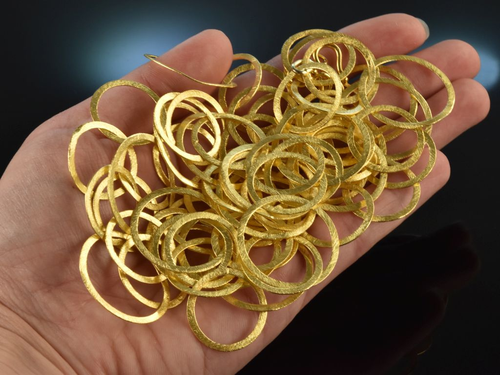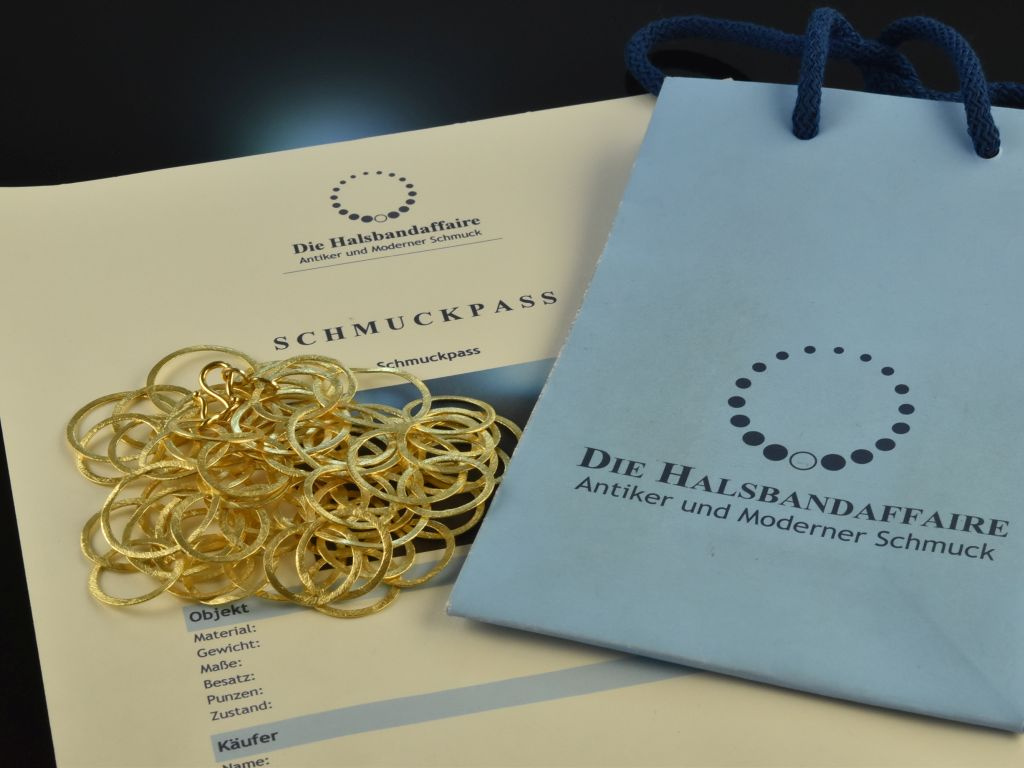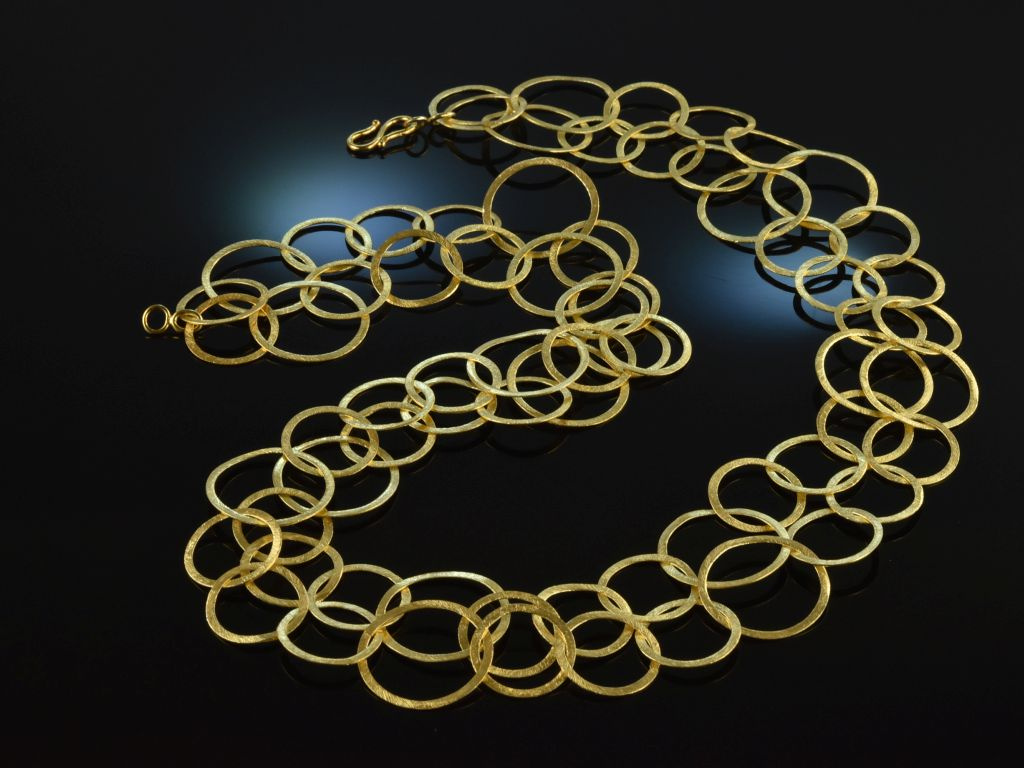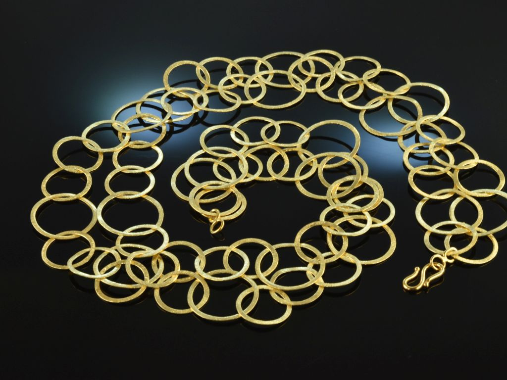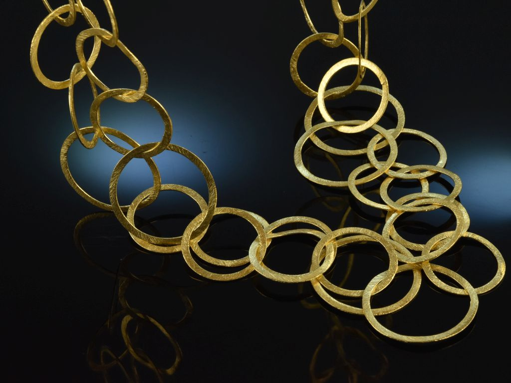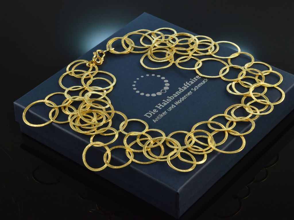 Imposante doppelreihige Kette aus vergoldetem Sterlingsilber 925 (gestempelt und garantiert). Die stylische Kette besteht vollständig aus runden, flach gearbeiteten Gliedern in zwei verschiedenen Größen, die in lebhaftem Rhythmus aneinandergefügt sind und durch den sensationellen Glanz ihrer satinierten Oberfläche bestechen. Geschlossen wird das Schmuckstück rückseitig mit einem einfachen S-Haken. Das imposante Collier ist ein absolutes Statement-Piece sowohl zu abendlichen Looks, als auch zum lässigen Outfit im Casual Chic.