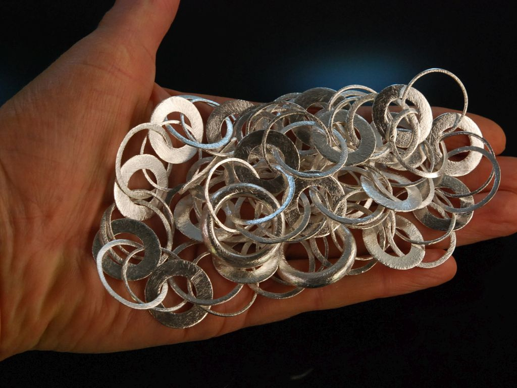 Trendige Statement Kette aus Sterlingsilber 925 (gestempelt und garantiert). Die moderne Kette besteht aus unterschiedlich großen, flach gearbeiteten Ringgliedern, die in ihrer Stärke variieren und von drei rund gewölbten Gliedern akzentuiert werden. Die einzelnen Segmente sind in lebhaftem Rhythmus aneinandergefügt und begeistern durch den sensationellen Glanz ihrer satinierten Oberfläche. Geschlossen wird das Schmuckstück mit einer einfachen Knebelschließe. Das coole Collier lässt sich durch sein schlicht geometrisches Design fast grenzenlos kombinieren und passt durch seinen kühlen Glanz besonders gut zu winterlichen Outfits.