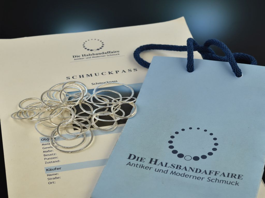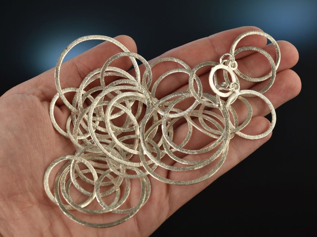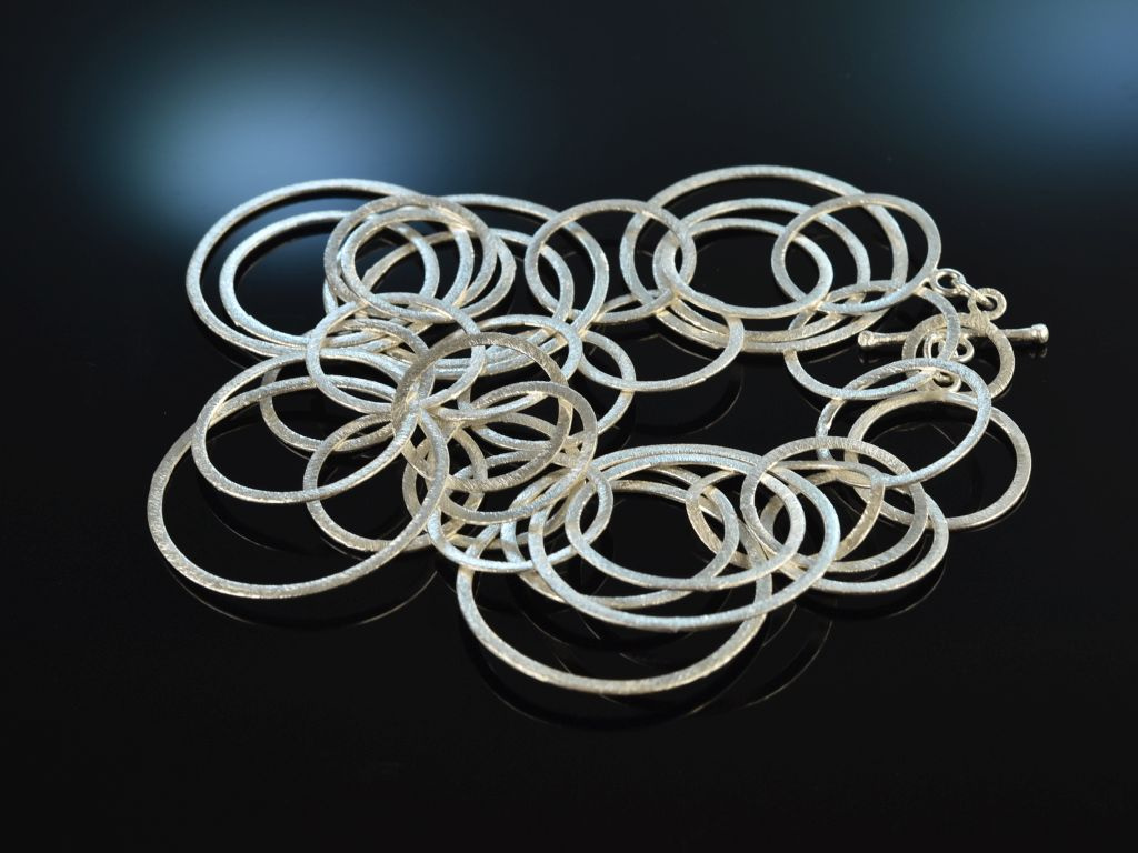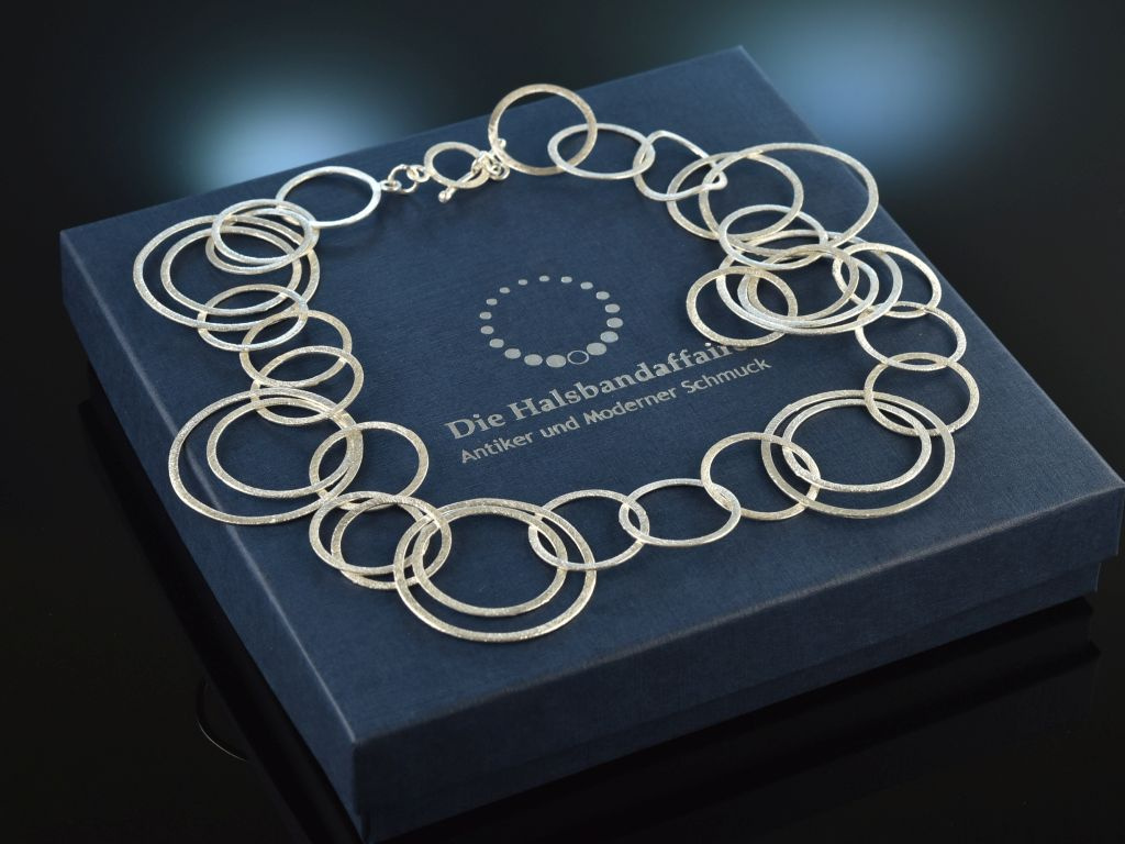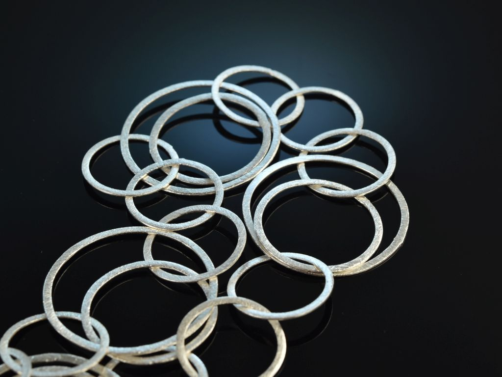 Wundervolle Kette aus satiniertem Sterlingsilber 925 (gestempelt und garantiert). Die sytlische Kette besteht aus unterschiedlich großen Ringgliedern, die attraktiv inneinander verschlungen sind. Geschlossen wird das Schmuckstück rückseitig mit einer minimalistischen Knebelschließe. Das imposante Statement Collier lässt sich durch sein schlicht geometrisches Design fast grenzenlos kombinieren. Es passt zu vielen verschiedenen Outfits von sportlich bis elegant und ist ein wahrer Hingucker.
