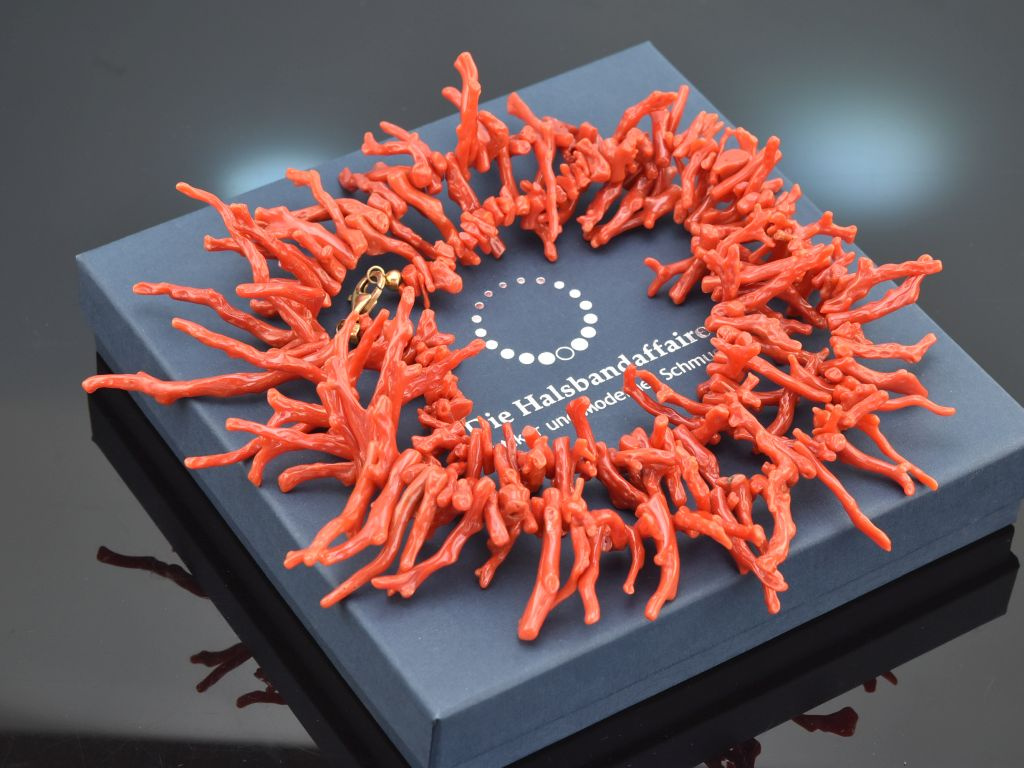 Die Kette besteht aus leuchtend roten Korallenästen in unterschiedlichen Längen, die im Größenverlauf angeordnet sind. Es handelt sich um echte, natürlich gewachsene, sowie unbehandelte Mittelmeer Koralle aus Torre del Greco von besonders schöner Qualität. Geschlossen wird die Kette mit einem schlichten Karabinerhaken aus vergoldetem Sterlingsilber.