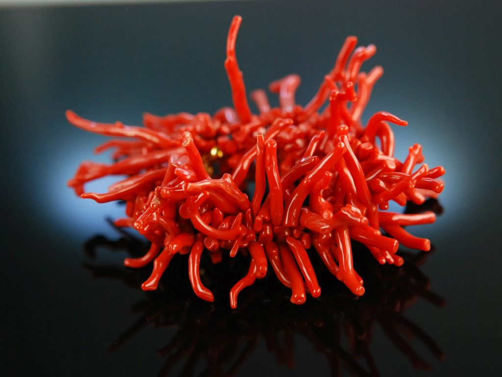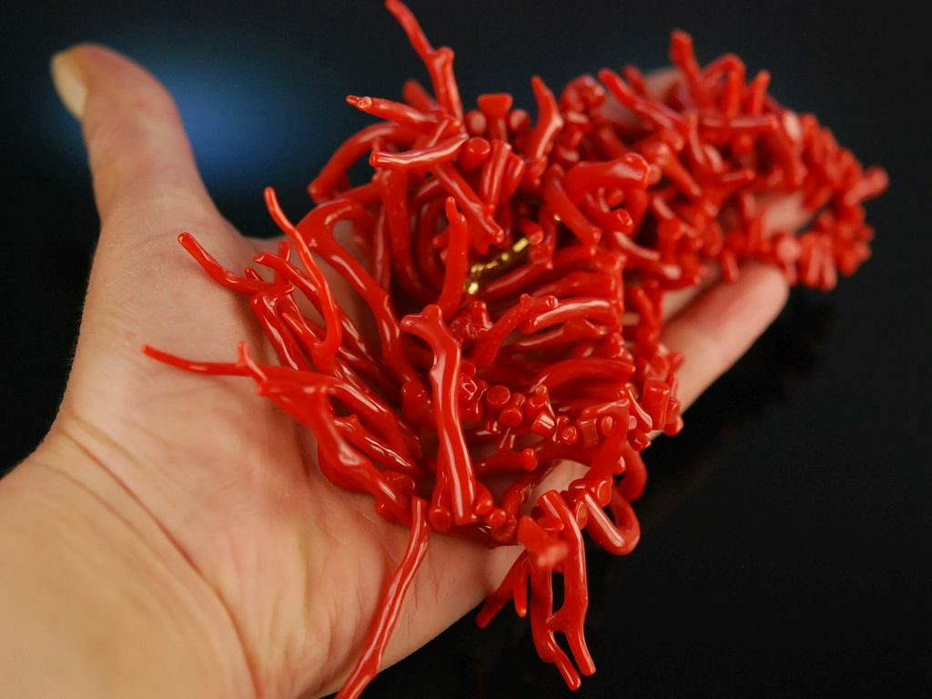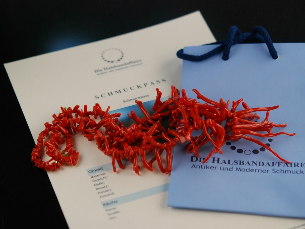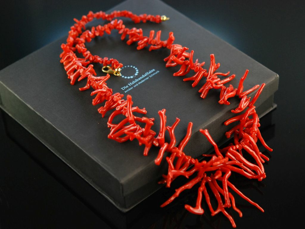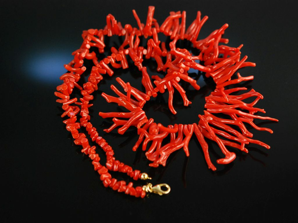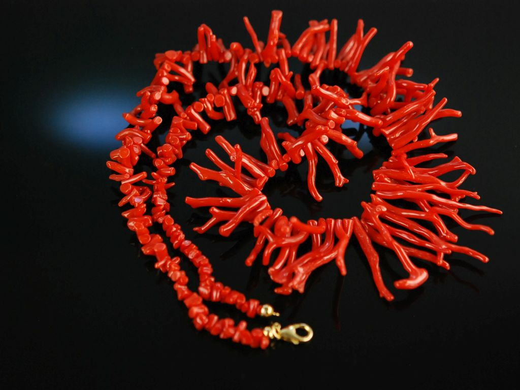 Atemberaubendes Astkorallen Collier aus feinster roter Mittelmeerkoralle, in Größenverlauf gearbeitet mit einer Karabinerschließe aus vergoldetem Sterlingsilber (gestempelt und garantiert). Die wundervolle Edelkoralle stammt aus Torre del Greco und ist von fantastischer Qualität. Kombinieren sie dieses außergewöhnliche Collier als frischen Akzent zu eleganten Tageslooks oder edel am Abend.