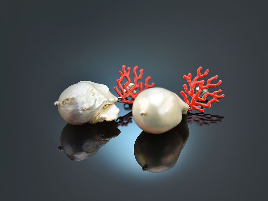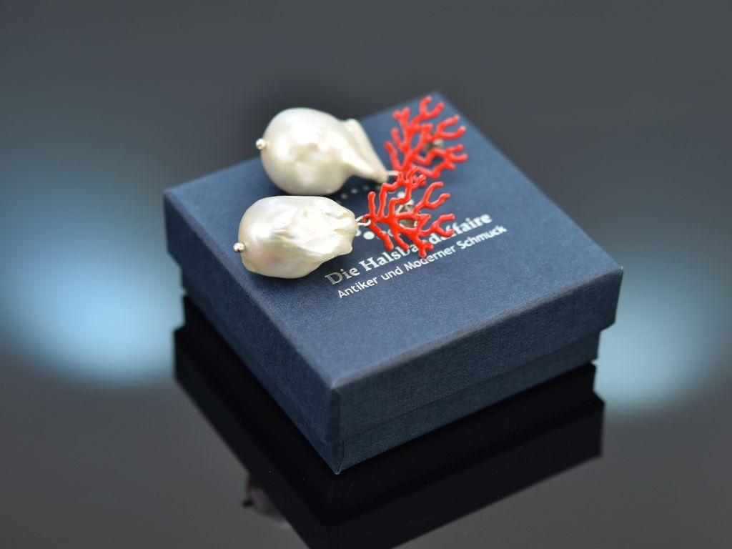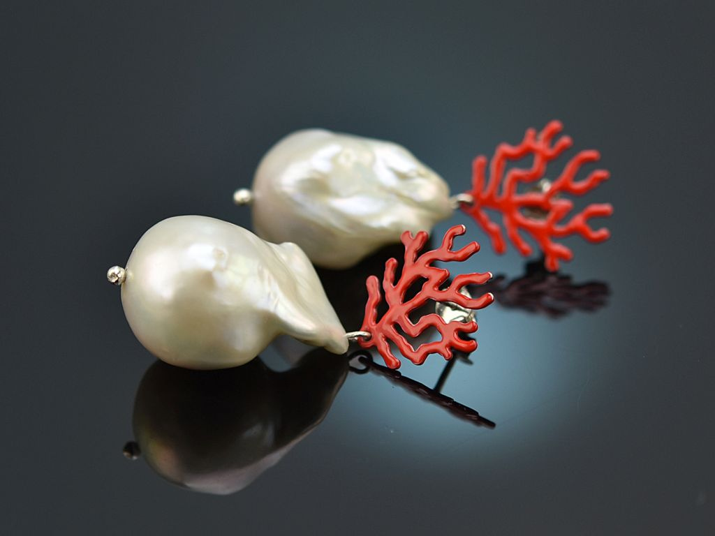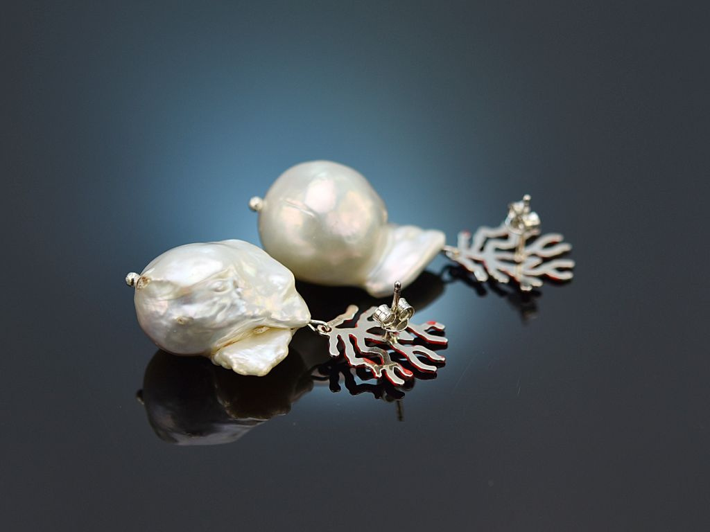 Die großen barocken Süsswasserzuchtperlen hängen frei schwingend an rot emaillierten Brisuren aus Silber. Die originellen Brisuren stellen die Umrisse eines Korallenbäumchens dar.