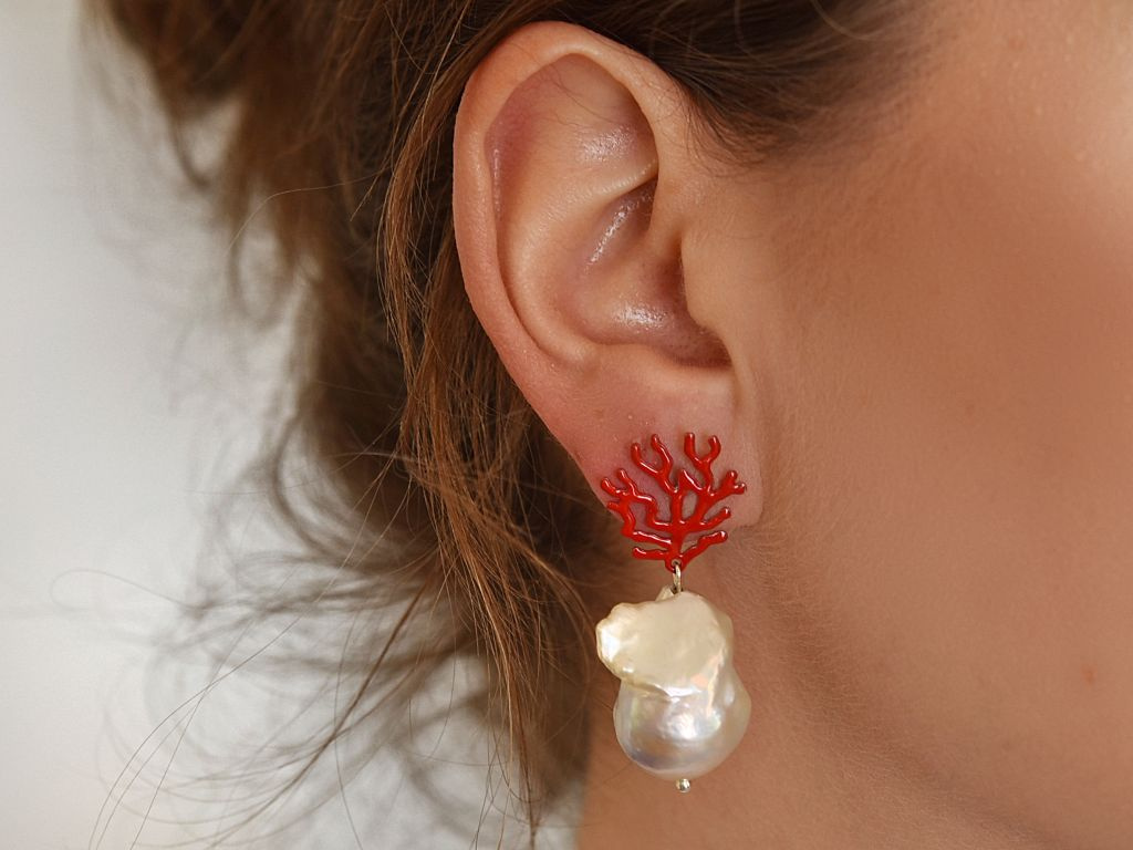 Schicke Statement Ohrringe mit barocken Zuchtperlen und rot emailliertem Sterlingsilber 925 (gestempelt und garantiert).