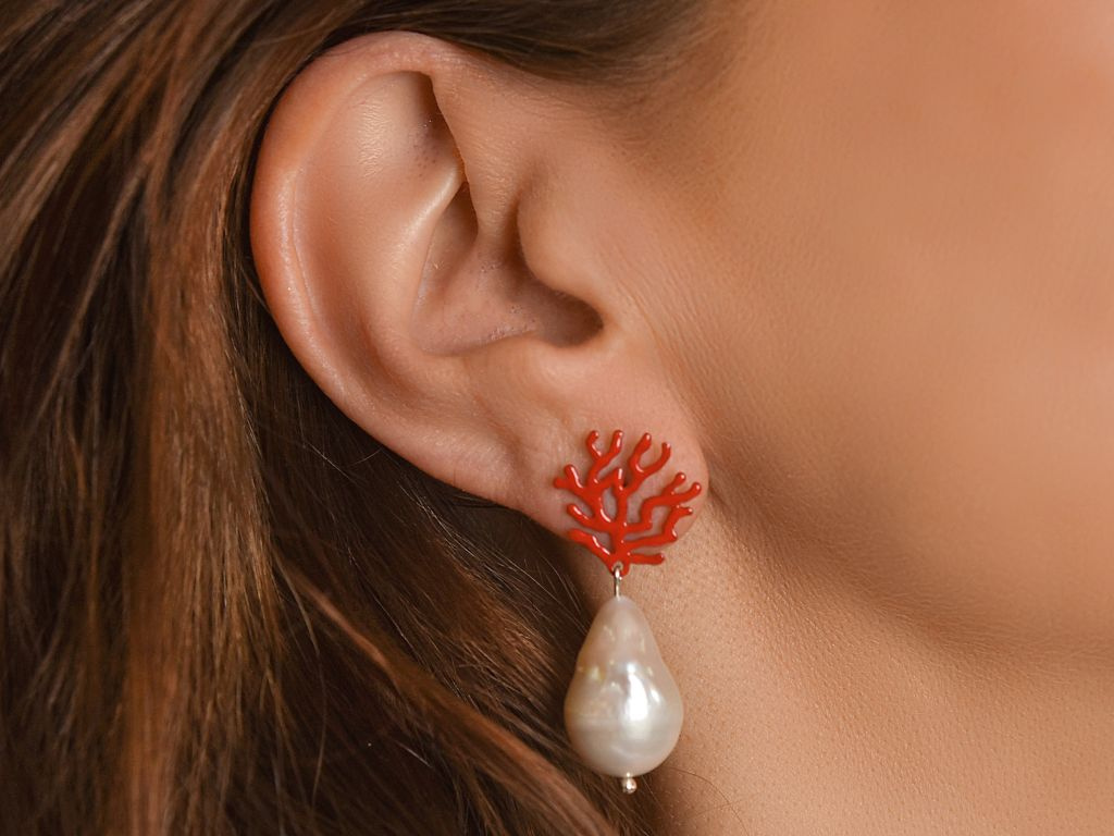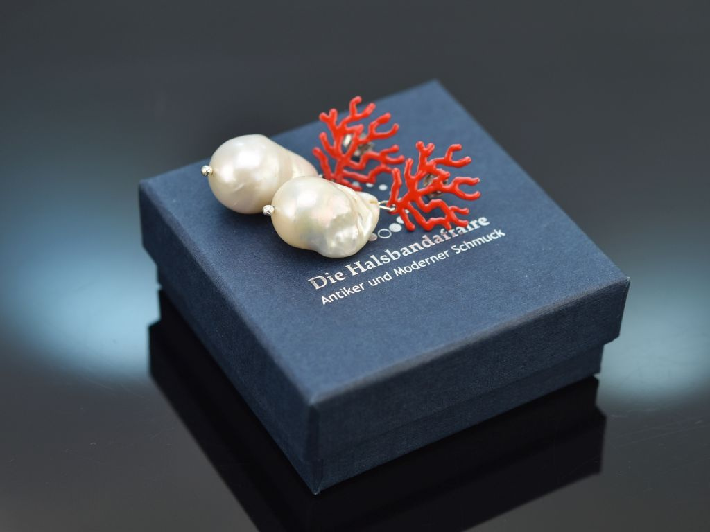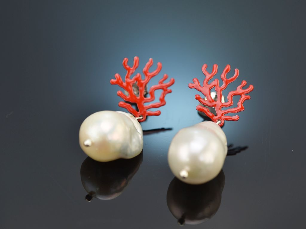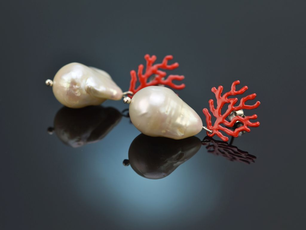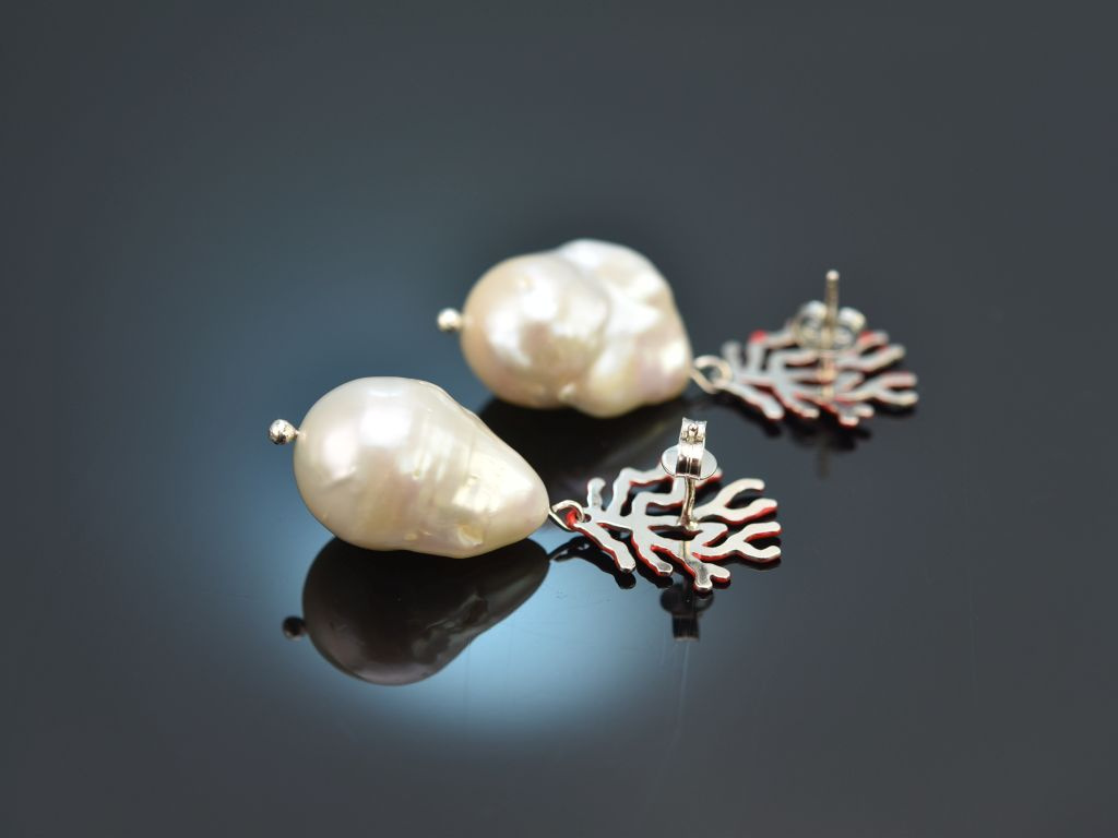 Die frei schwingenden Ohrringe mit großen barocken Süßwasser Zuchtperlen und rot emailliertem Silber stellen die Umrisse eines Korallenbäumchens dar. Durch rückseitige Stecker mit Butterfly-Verschlüssen ist der zauberhafte Ohrschmuck angenehm und sicher zu tragen.