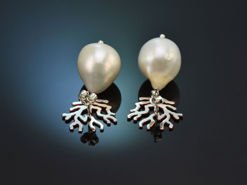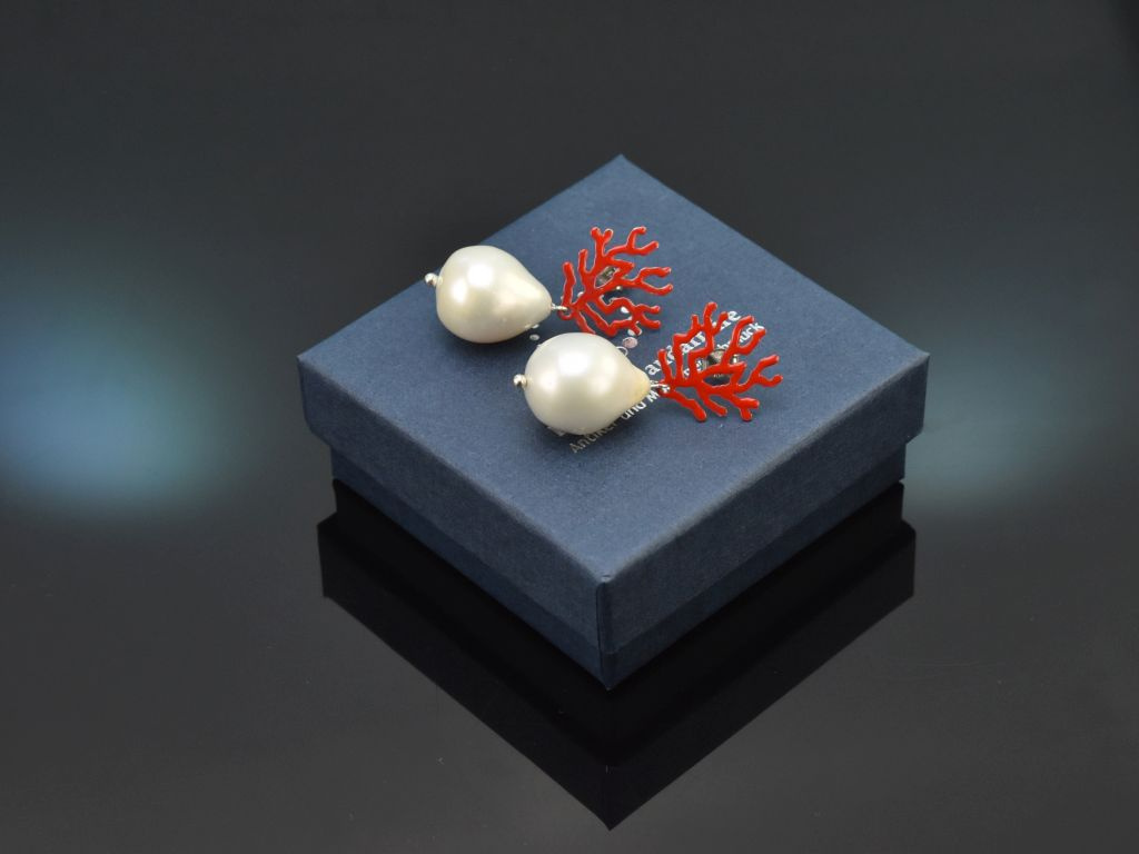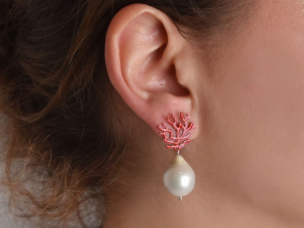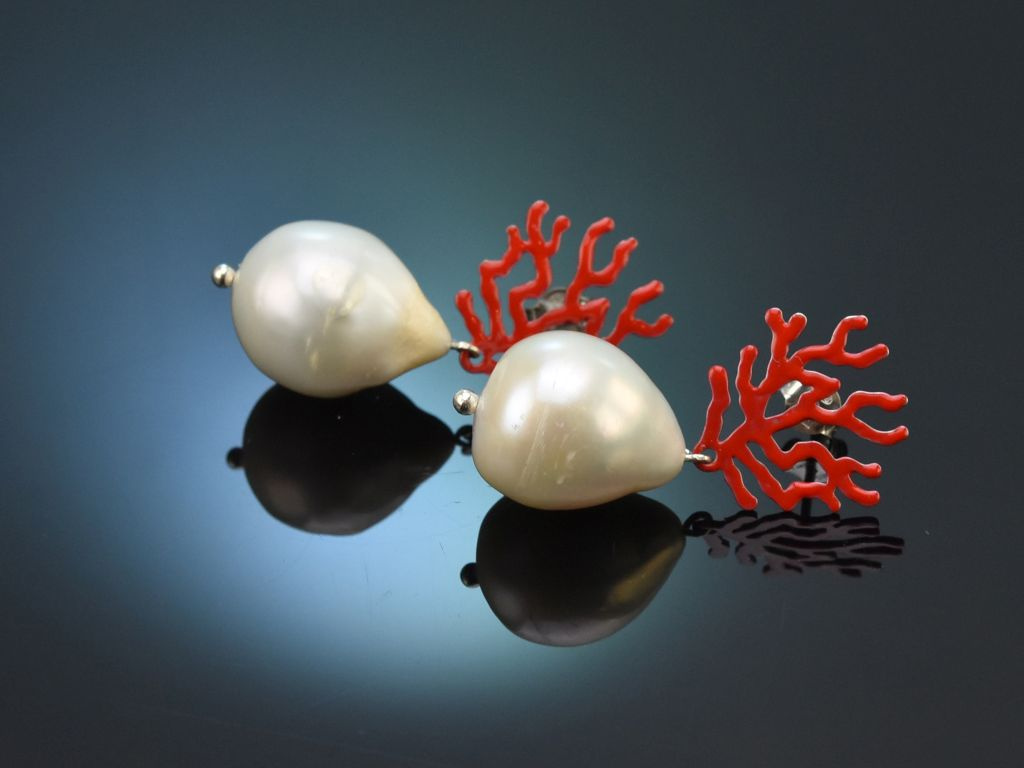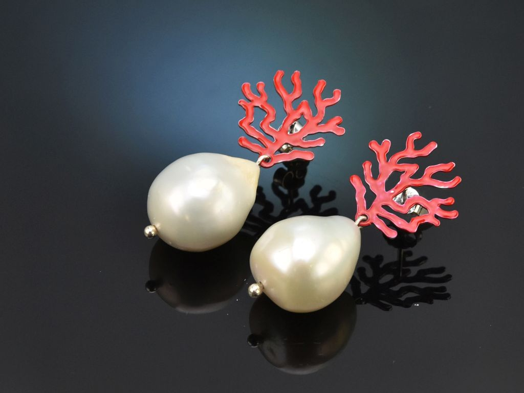 Die weißen barocken Süßwasserzuchtperlen in Tropfenform sitzen frei schwingend an rot emaillierten Brisuren aus Silber, die die Umrisse eines Korallenbäumchens darstellen.