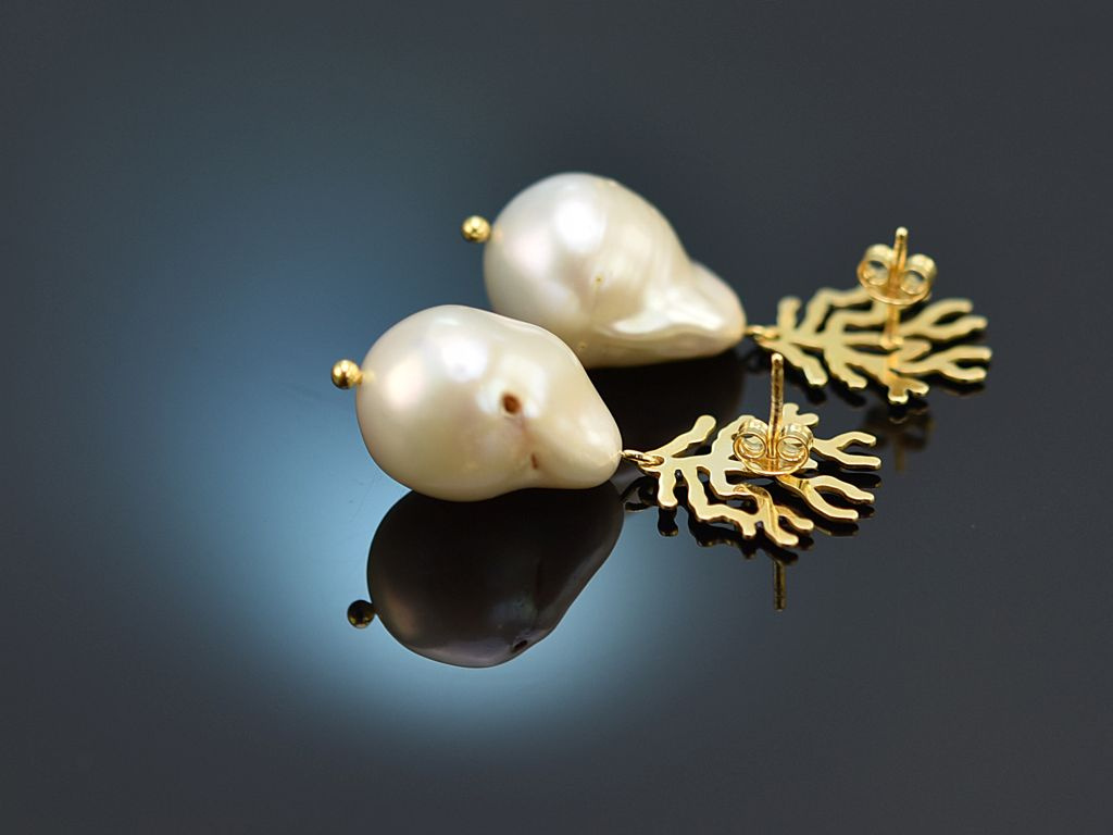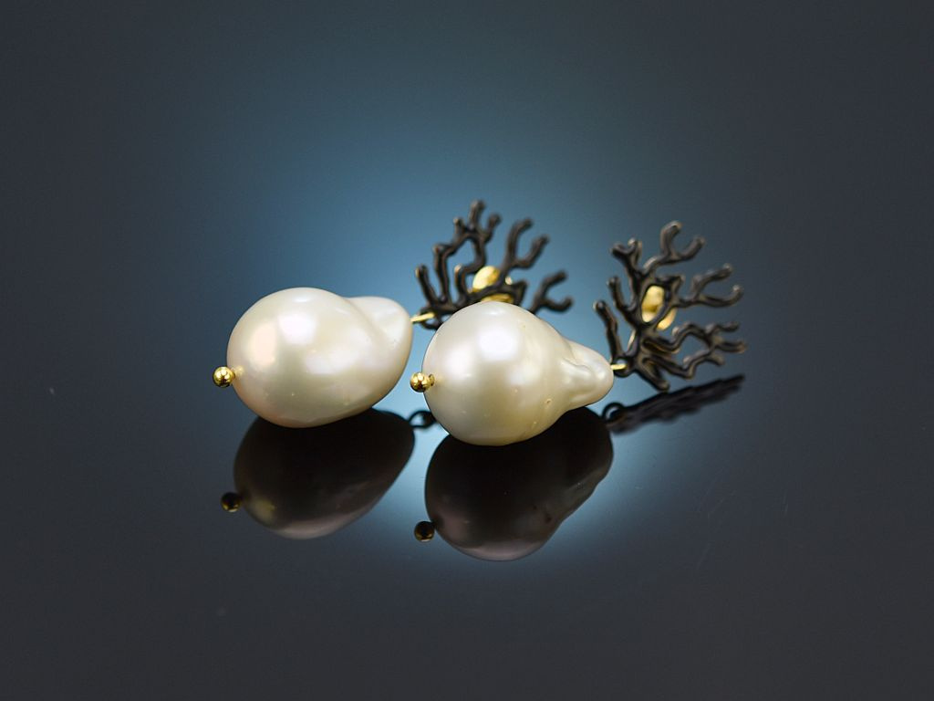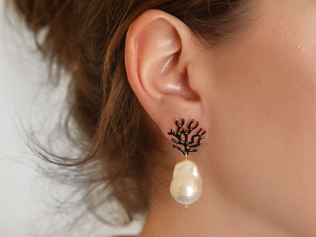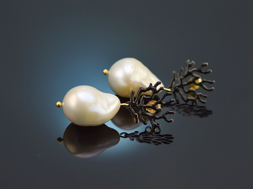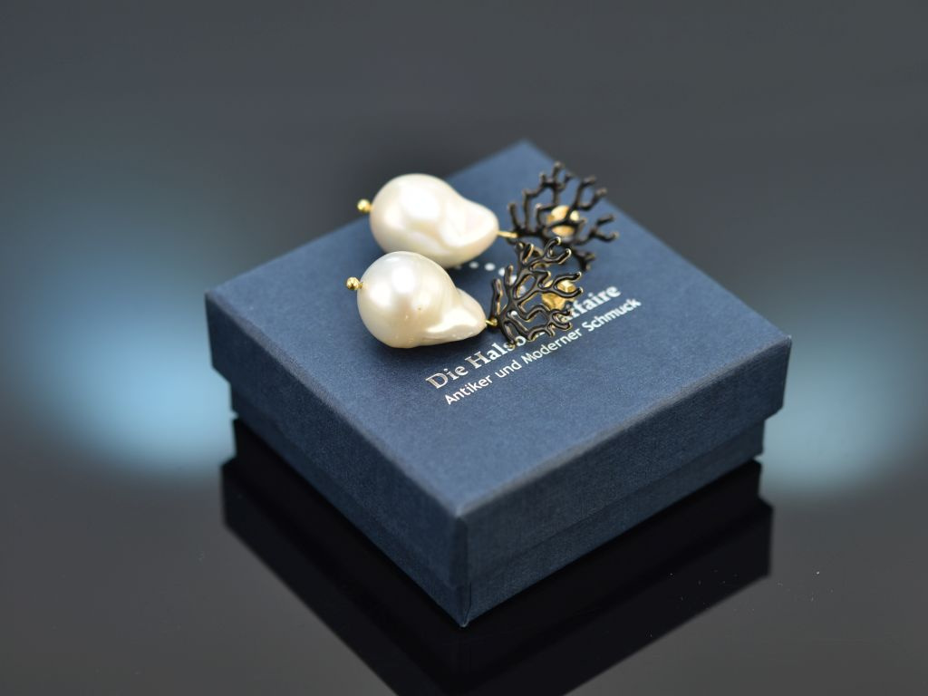 Die frei schwingenden Ohrringe mit großen barocken Süßwasser Zuchtperlen und schwarz emailliertem Silber stellen die Umrisse eines Korallenbäumchens dar. Durch rückseitige Stecker mit Butterfly-Verschlüssen ist der zauberhafte Ohrschmuck angenehm und sicher zu tragen.