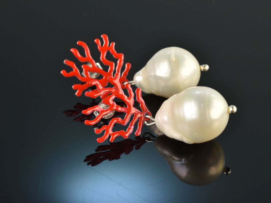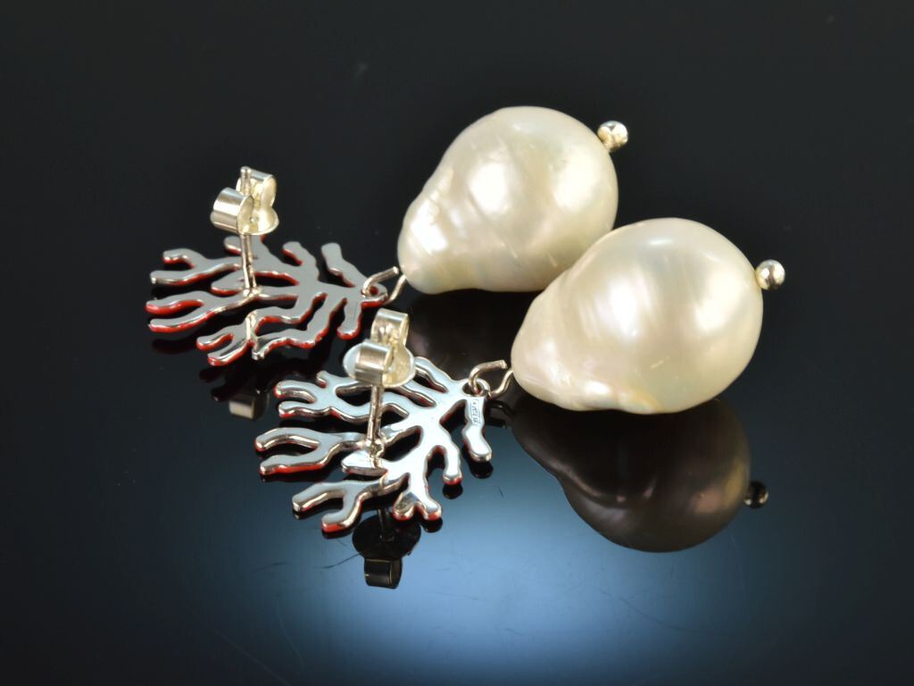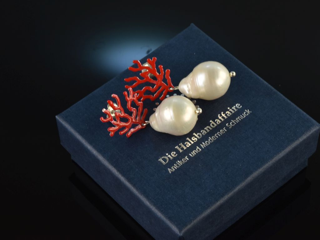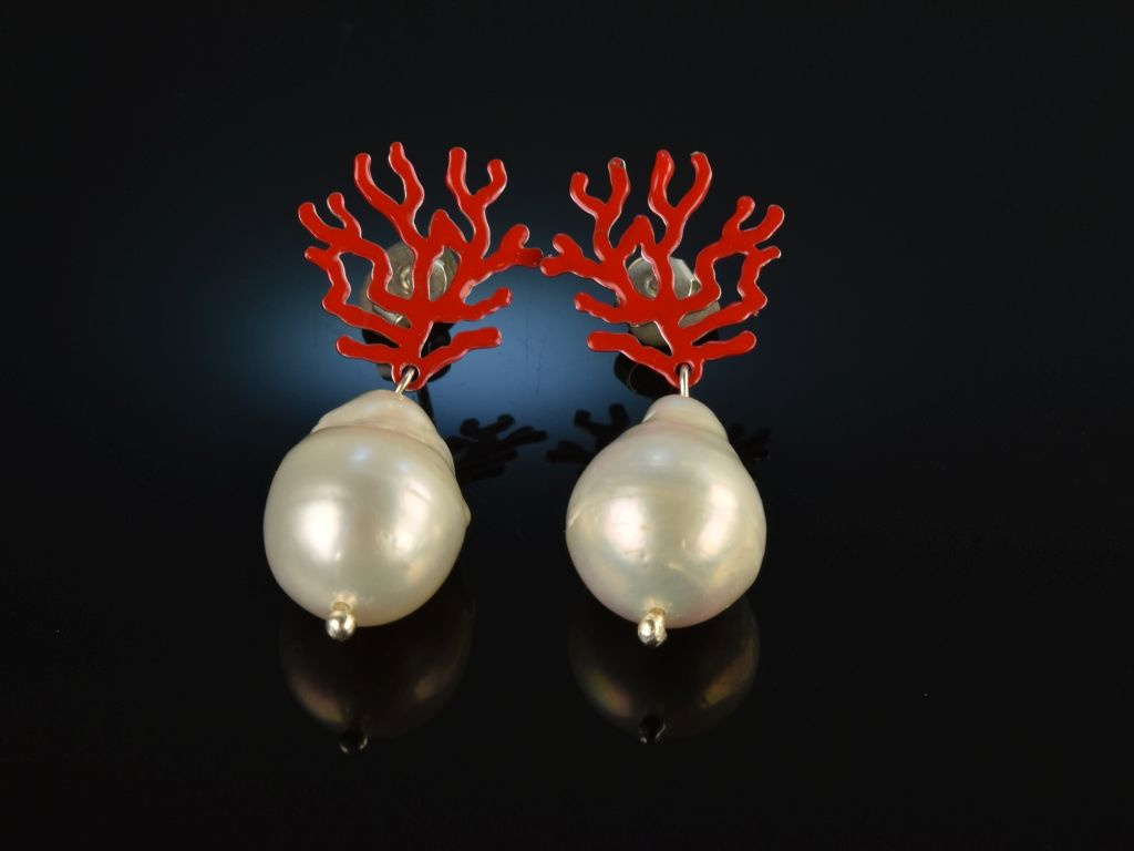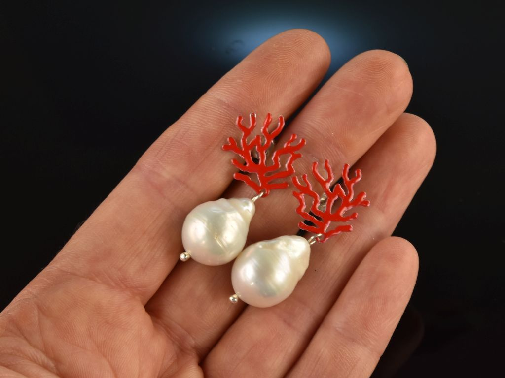 Die Ohrringe aus emailliertem Silber stellen die Umrisse eines Korallenbäumchens dar, woran je eine große barocke Perle frei hängt. Durch rückseitige Stecker mit Butterfly-Verschlüssen ist der zauberhafte Ohrschmuck angenehm und sicher zu tragen. Die Ohrringe bestechen durch die klassischen Perlen in Kombination mit dem korallenroten Geäst.