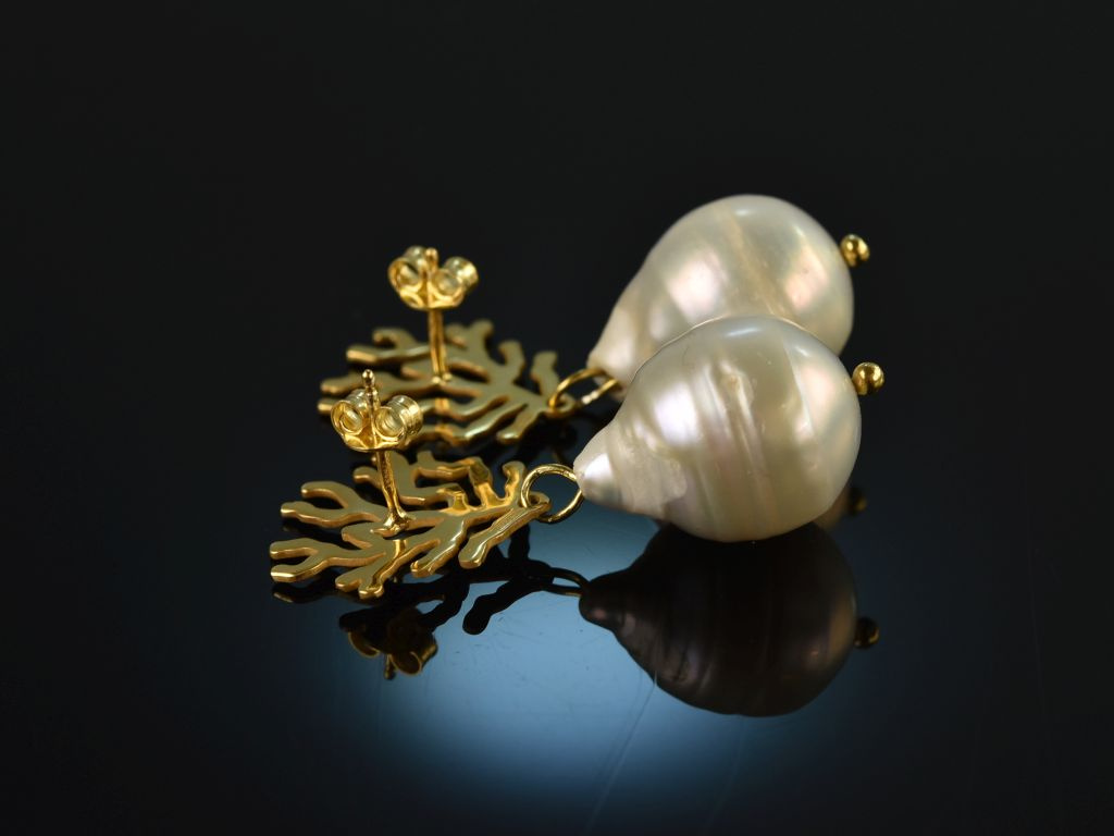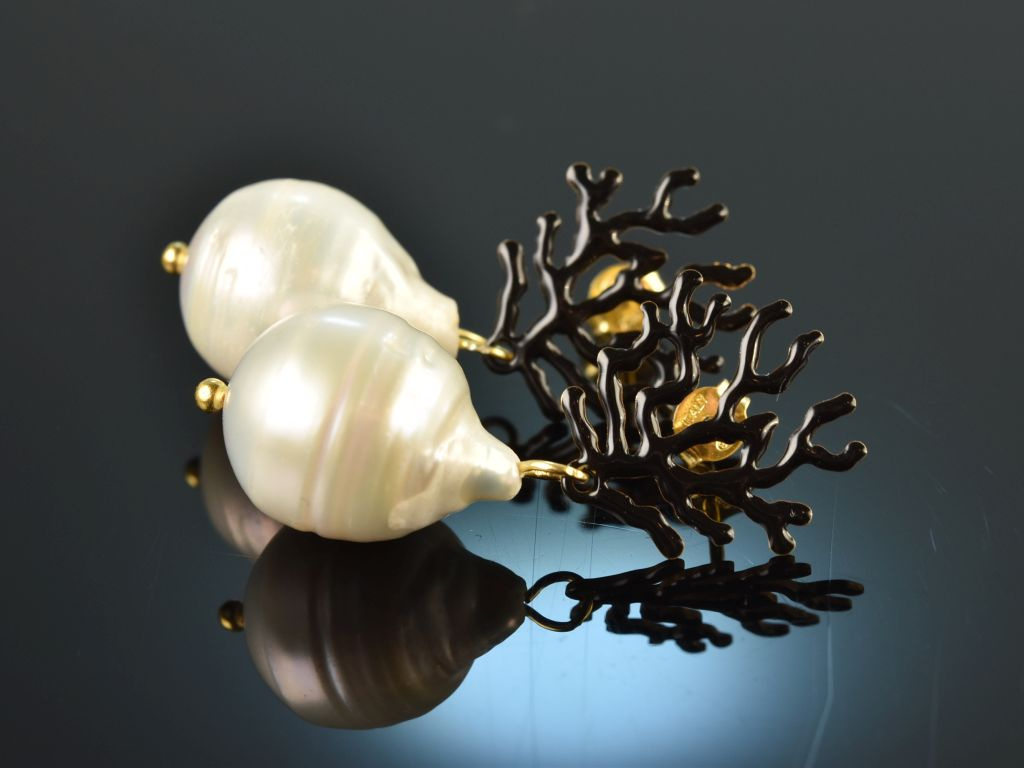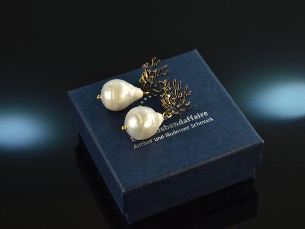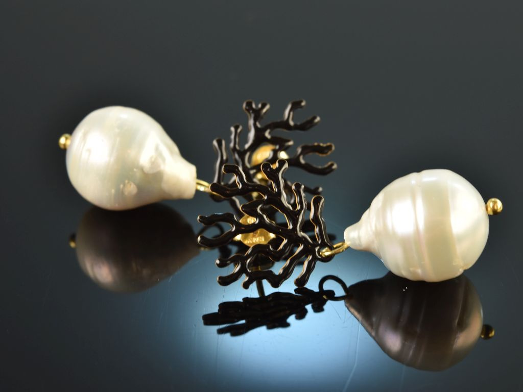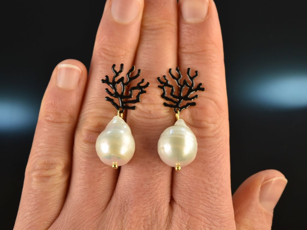 Die frei schwingenden Ohrringe mit Perle und schwarz emailliertem Silber stellen die Umrisse eines Korallenbäumchens dar. Durch rückseitige Stecker mit Butterfly-Verschlüssen ist der zauberhafte Ohrschmuck angenehm und sicher zu tragen.