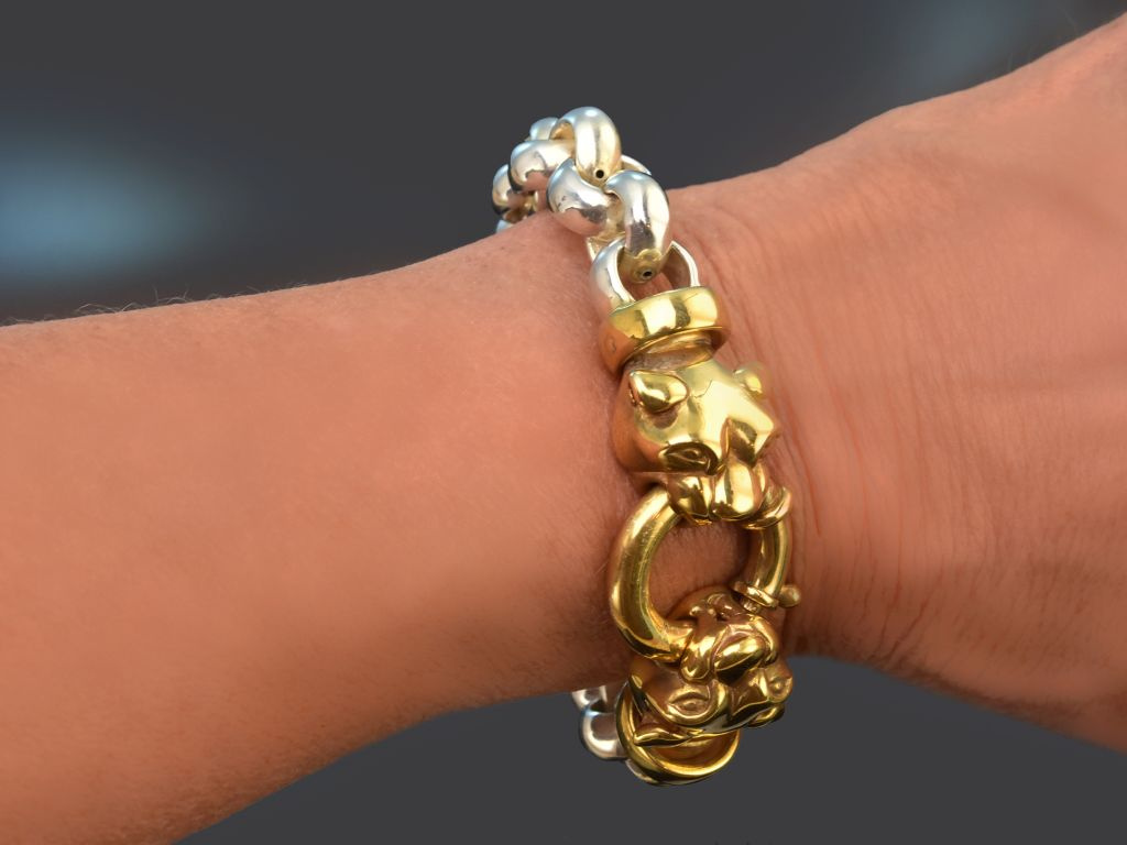 Das dekorative Armband trägt im Zentrum zwei plastisch gearbeitete, vergoldete Pantherköpfe. Diese sind beweglich an einem dicken Federring befestigt, der zugleich als Schließe fungiert. Die Glieder dieses außergewöhnlichen Armbands sind im Erbsmuster angeordnet und aus hochglänzend poliertem Sterlingsilber.