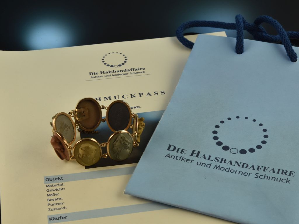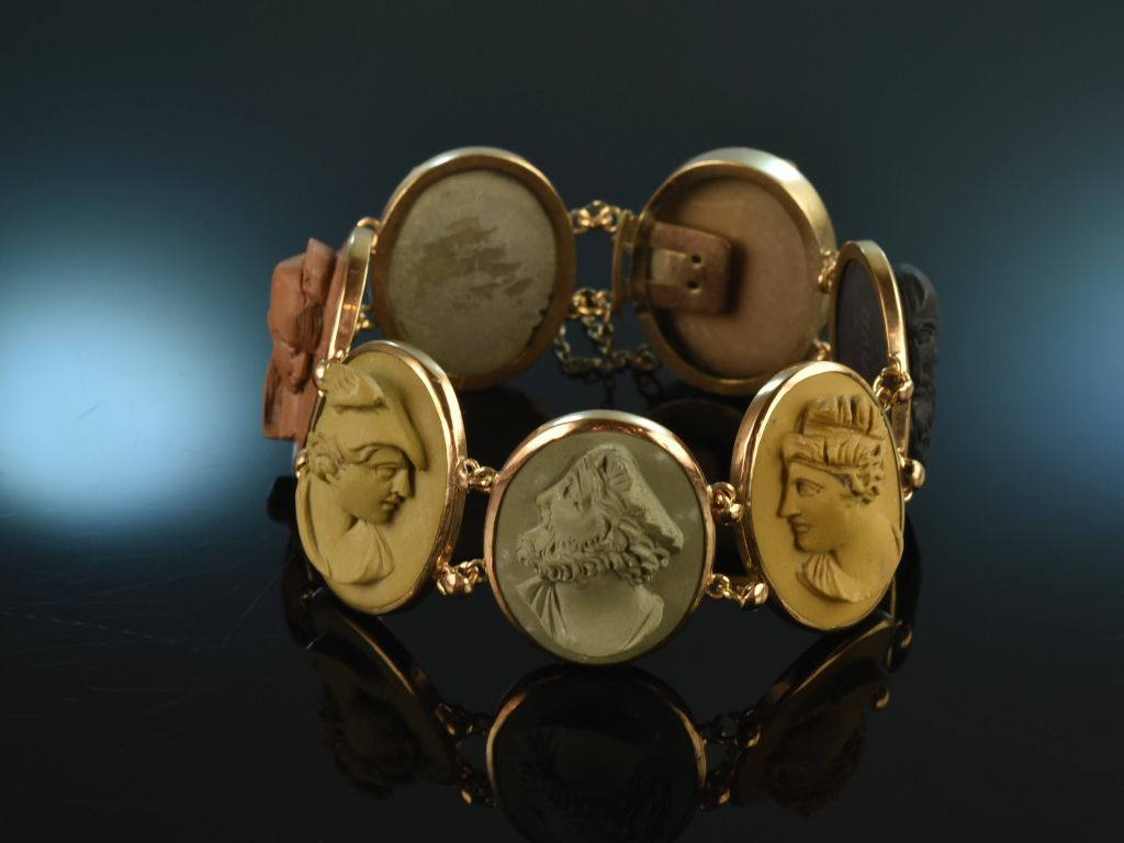 Prachtvolles antikes Armband, bestehend aus ovalen Gliedern aus eingefassten Lava-Kameen. Die insgesamt sieben Kameen tragen die Abbilder olympischer Gottheiten wie beispielsweise das des Ares, Gott des Krieges, des Hermes, Schutzgott der Reisenden und Kaufleute, des Zeitgottes Chronos oder des Apollon, dem Gott der Weissagung und der Künste. Die Lava Kameen sind von unterschiedlicher Farbigkeit und bestechen durch ihre sanften Erdtöne von Oliv über Ocker bis hin zu intensivem Schwarz. Geschlossen wird das Schmuckstück mit einer einfachen Steckschließe mit zusätzlichem Sicherungskettchen.