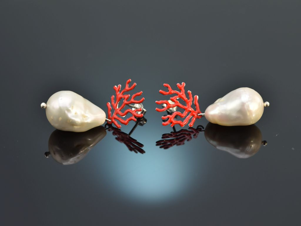 An rot emaillierten Brisuren aus Silber, welche die Umrisse eines Korallenbäumchens darstellen, sitzen zwei große, frei schwingende Süßwasser Zuchtperlen mit schönem weißen Lüster.