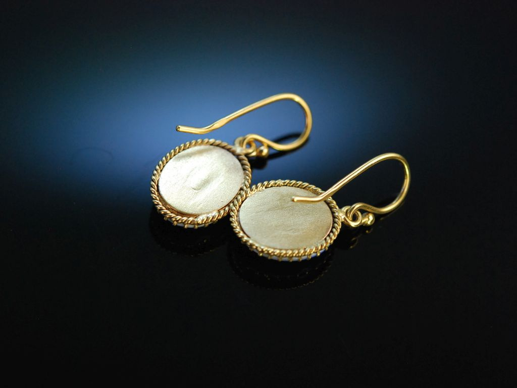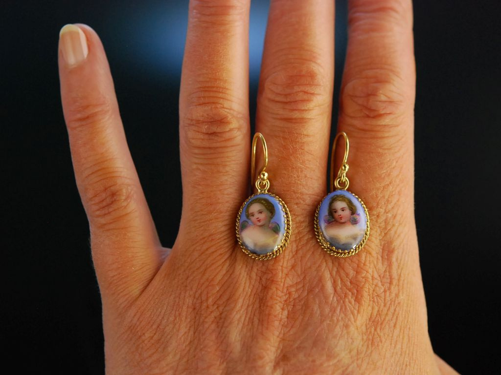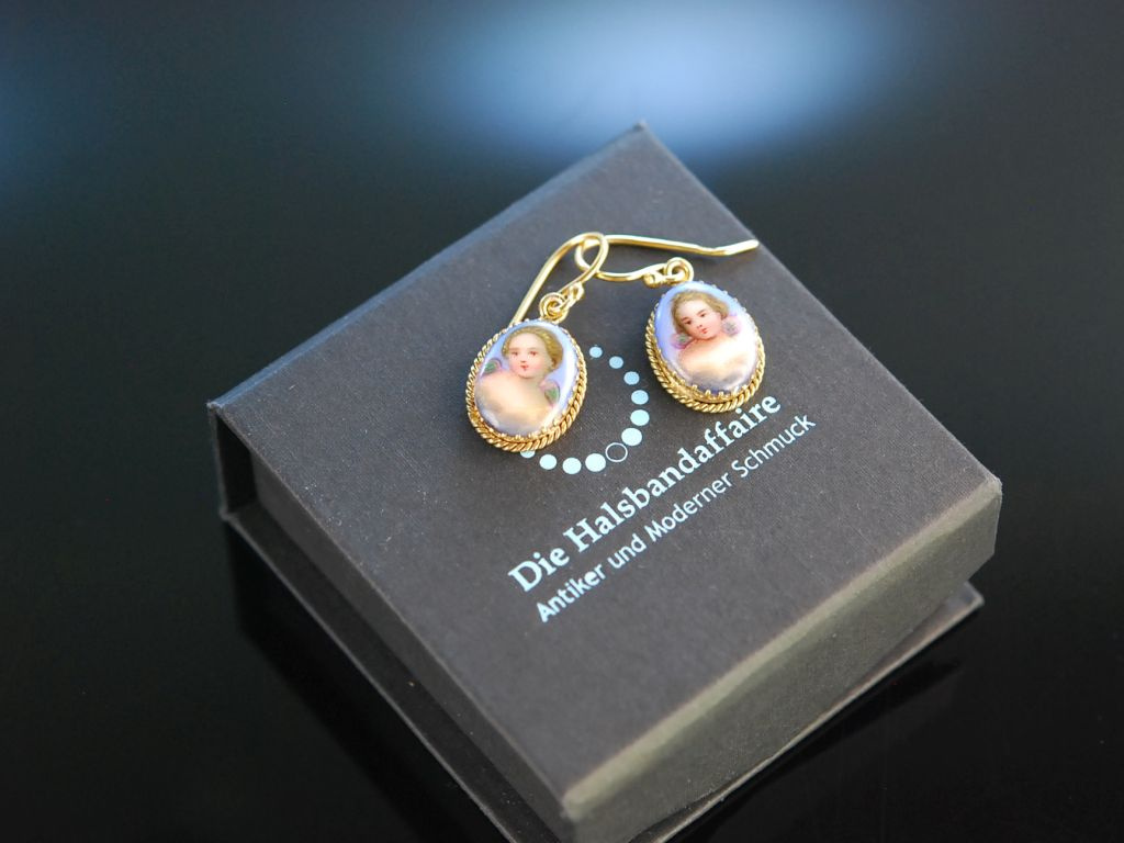 Bezauberndes Paar Ohrhänger mit feiner antiker Miniaturmalerei auf Porzellan. An schön geschwungenen Hakenbrisuren aus vergoldetem Sterlingsilber 925 (gestempelt und garantiert) hängt jeweils frei beweglich eine hochovale Porzellanplakette mit der qualitätvollen und charmanten Darstellung eines Puttos mit welligem Haar und kleinen bunten Flügeln auf einem Wolkensockel vor blauem Grund. Die feine Miniaturmalerei ist exquisit und sehr schön erhalten und sitzt in einer zarten Rahmung mit Kordeldekor aus vergoldetem Metall. Die wundervollen Porzellanminiaturen mit Fassungen entstanden in England um 1900. Die historischen Ohrringe können sehr gut zu verschiedenen Stilen kombiniert werden und bestechen durch ihre liebenswerte Darstellung der zwei kleinen, in Physiognomie und Frisur individuell gestalteten Putti.