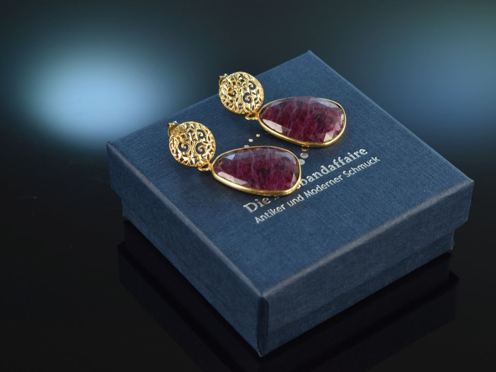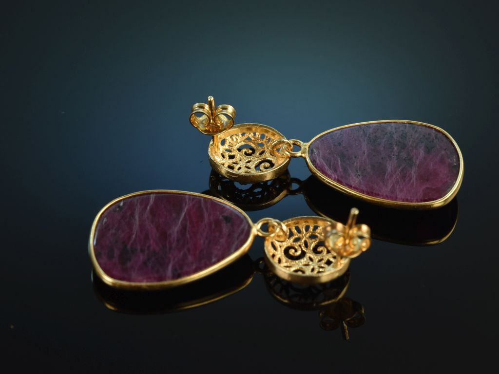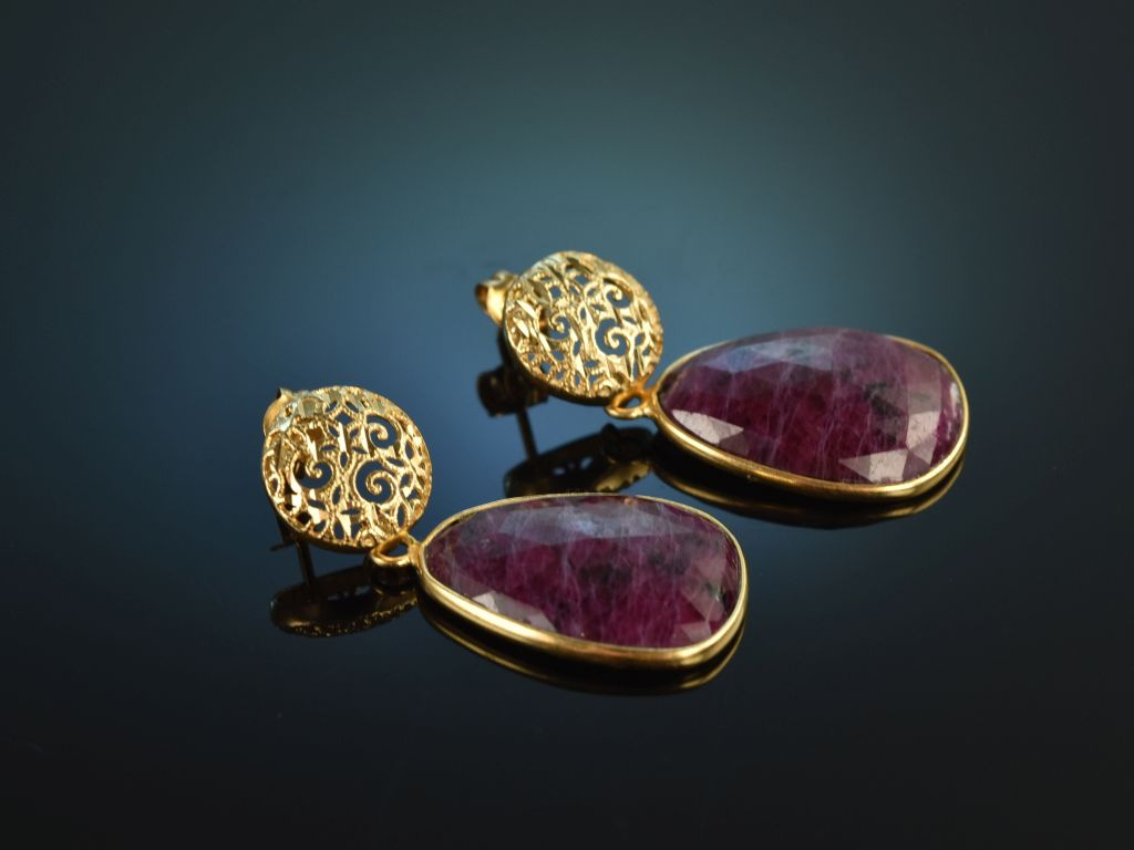 Ein Paar Ohrhänger aus eigener Werkstatt, gearbeitet aus tropfenförmig gefassten Rubinen, an runden ornamental durchbrochenen Butterfly-Brisuren aus vergoldeten Sterlingsilber 925 (gestempelt und garantiert). Die unbehandelten Farbsteine haben ein tiefes lila beziehungsweise weinrot, sind opak und erinnern an Trauben und Wein. Sie passen wunderbar in den Herbst hinein und fügen sich ausgezeichnet seiner Farbpalette.