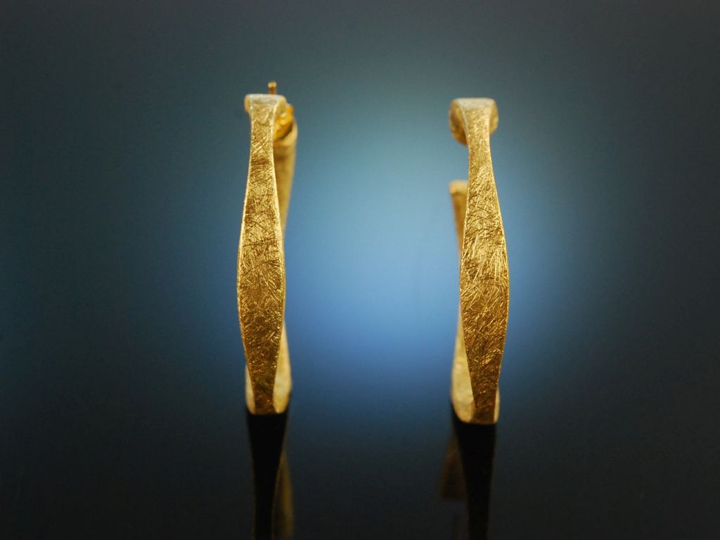 Coole Ohrringe in moderner Creolenform aus vergoldetem Sterlingsilber 925 (gestempelt und garantiert). Die schönen Creolen bestechen durch ihre lebendig geschwungene Form und die satinierte Oberfläche, wodurch sie wunderbar im Licht schimmern. Durch ihre rückseitigen Stecker mit Butterflybrisuren sitzen sie sicher und angenehm am Ohr. Die minimalistischen Ohrringe passen zu zahlreichen Gelegenheiten und sind stets ein stylisches Statement Piece zu vielen verschiedenen Looks.