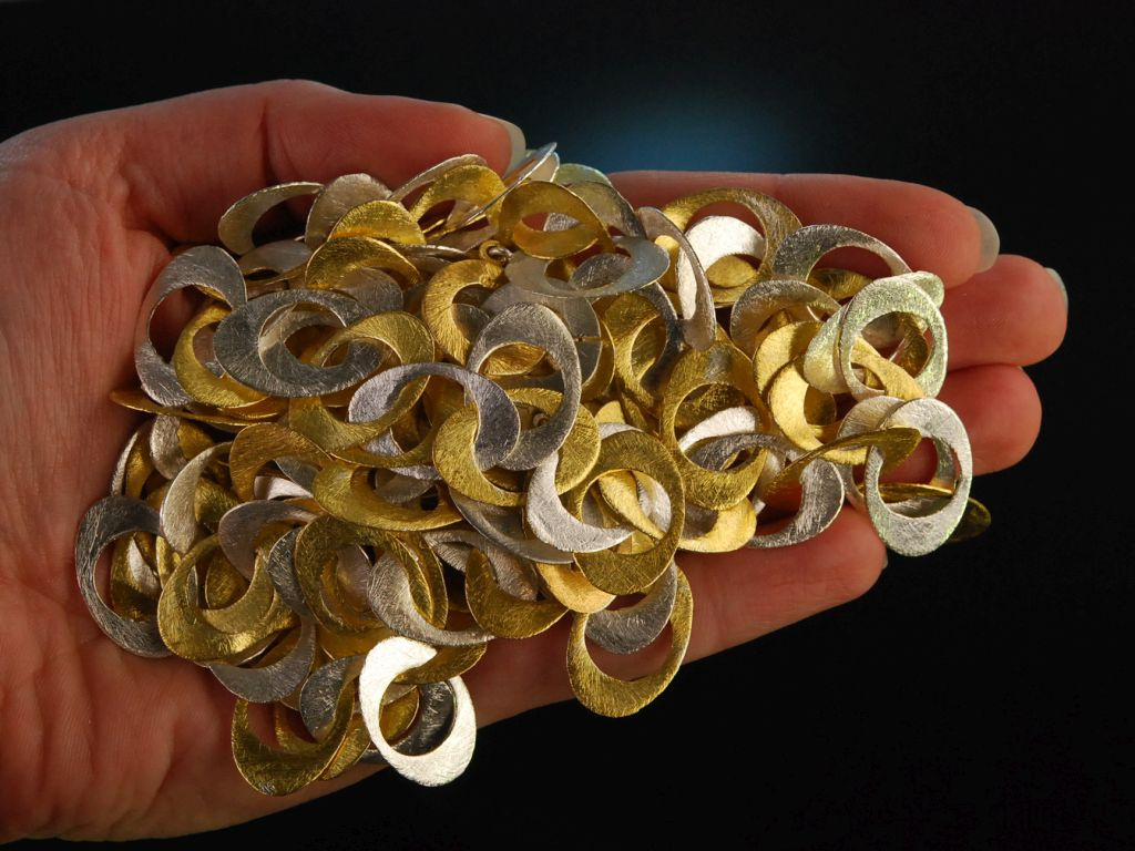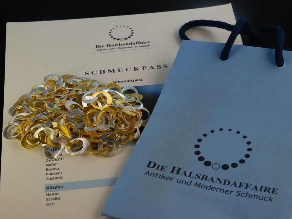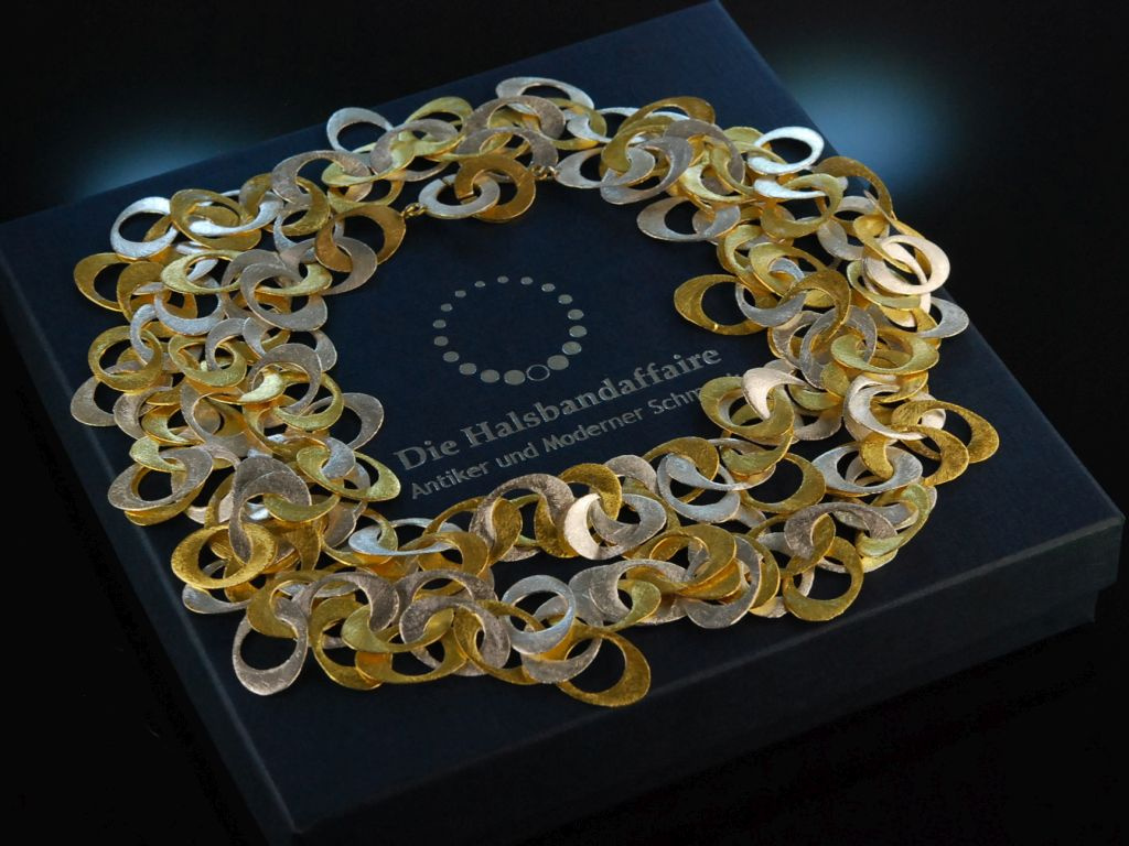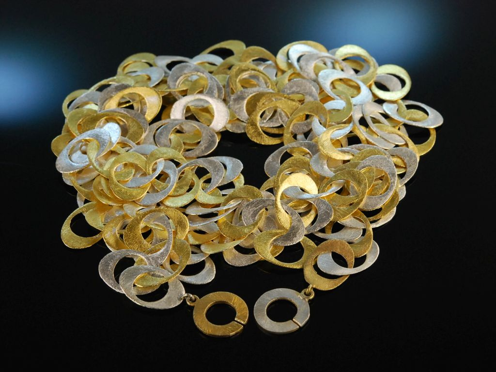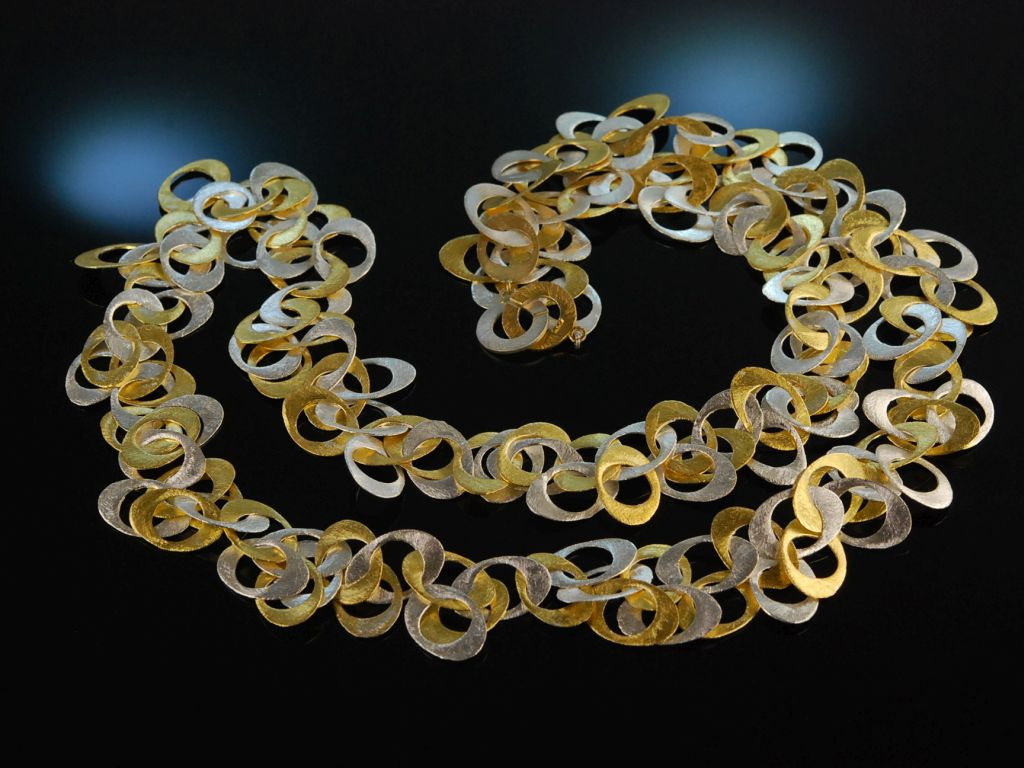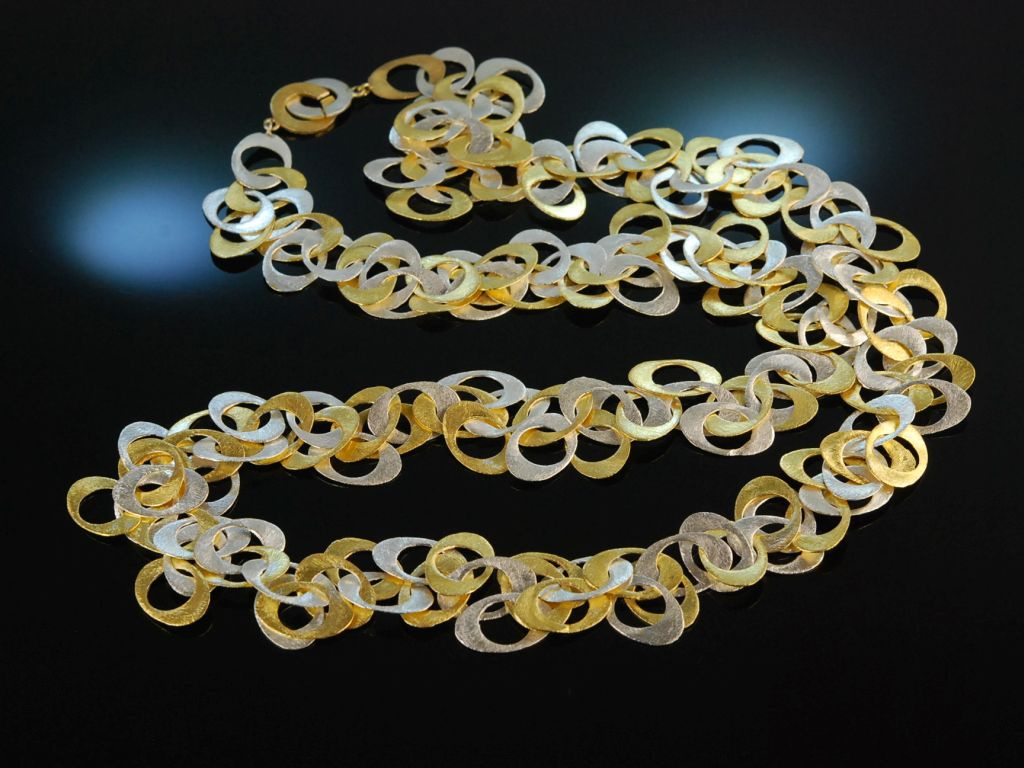 Extravagante lange Kette aus teilvergoldetem Sterlingsilber 925 (gestempelt und garantiert). Die sytlische Kette besteht vollständig aus elyptischen, flach gearbeiteten Gliedern, die in lebhaftem Rhythmus ineinandergefügt sind und durch den sensationellen Lichtschimmer ihrer satinierten Oberfläche bestechen. Geschlossen wird das Schmuckstück rückseitig mit einer einfachen Knebelschließe. Das imposante Sautoir ist ein absolutes Statementschmuckstück sowohl zu abendlichen Looks als auch zum lässigen Outfit im Casual Chic. Es lässt sich durch die Kombination aus kühlem Silber und warmer Vergoldung auch hervorragend zu anderen Schmuckstücken in Bicolor-Optik kombinieren.