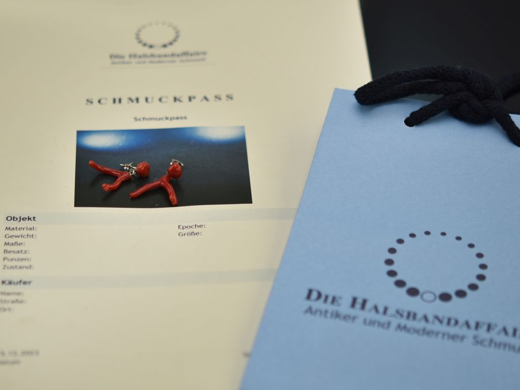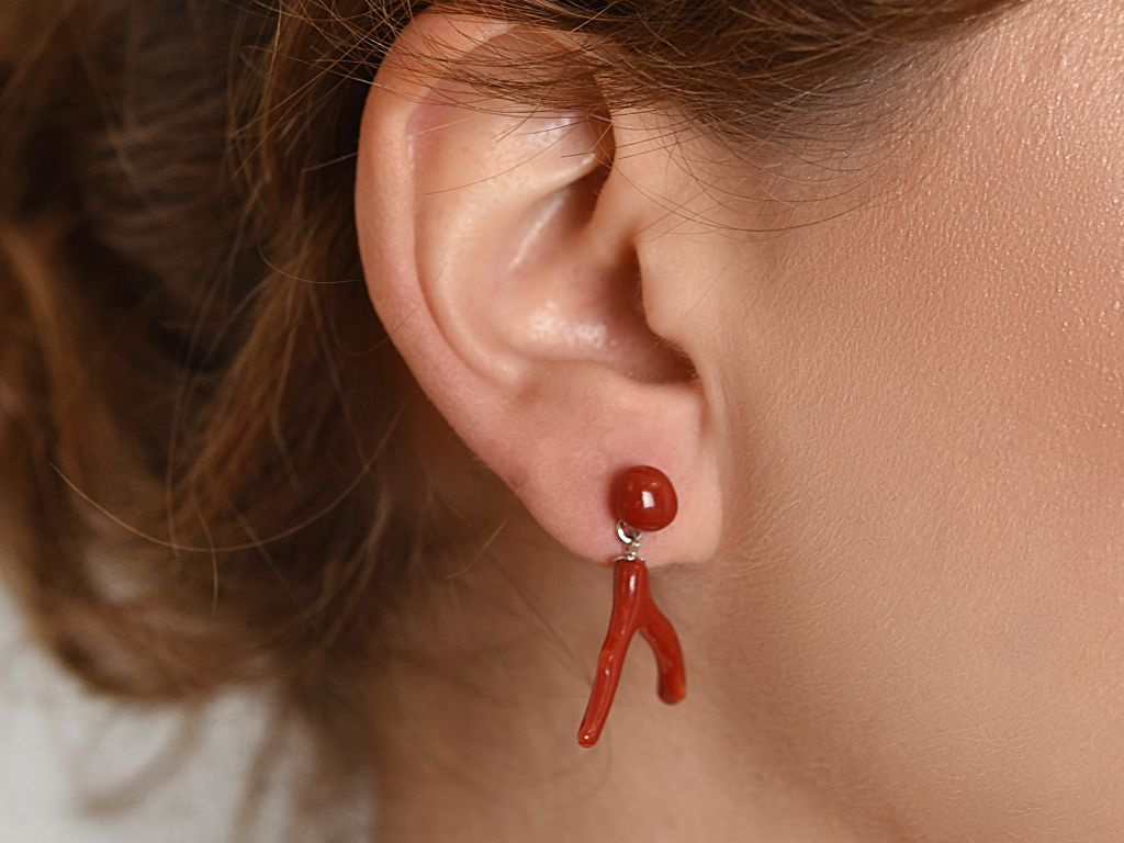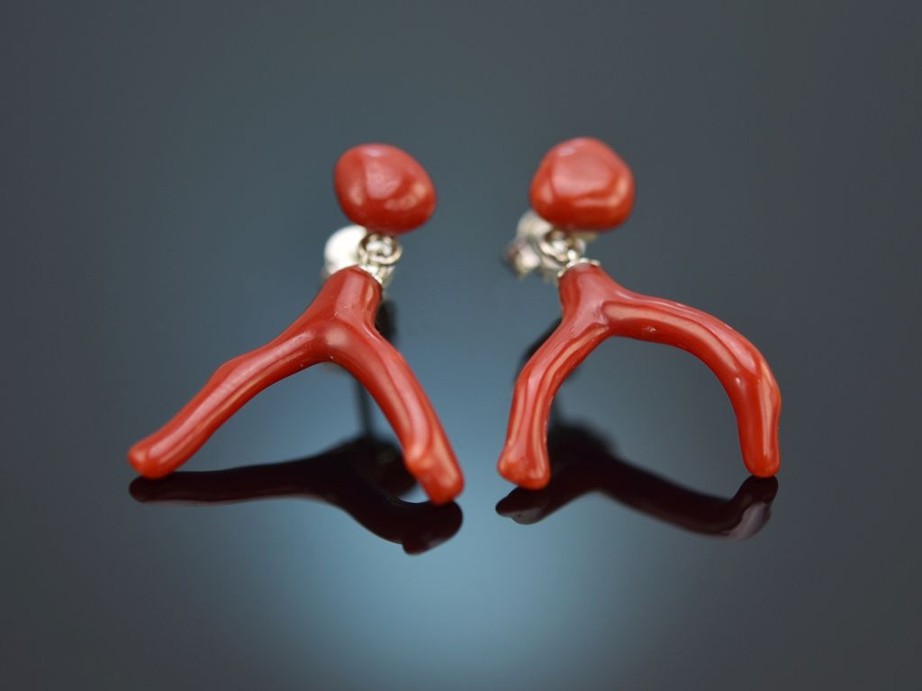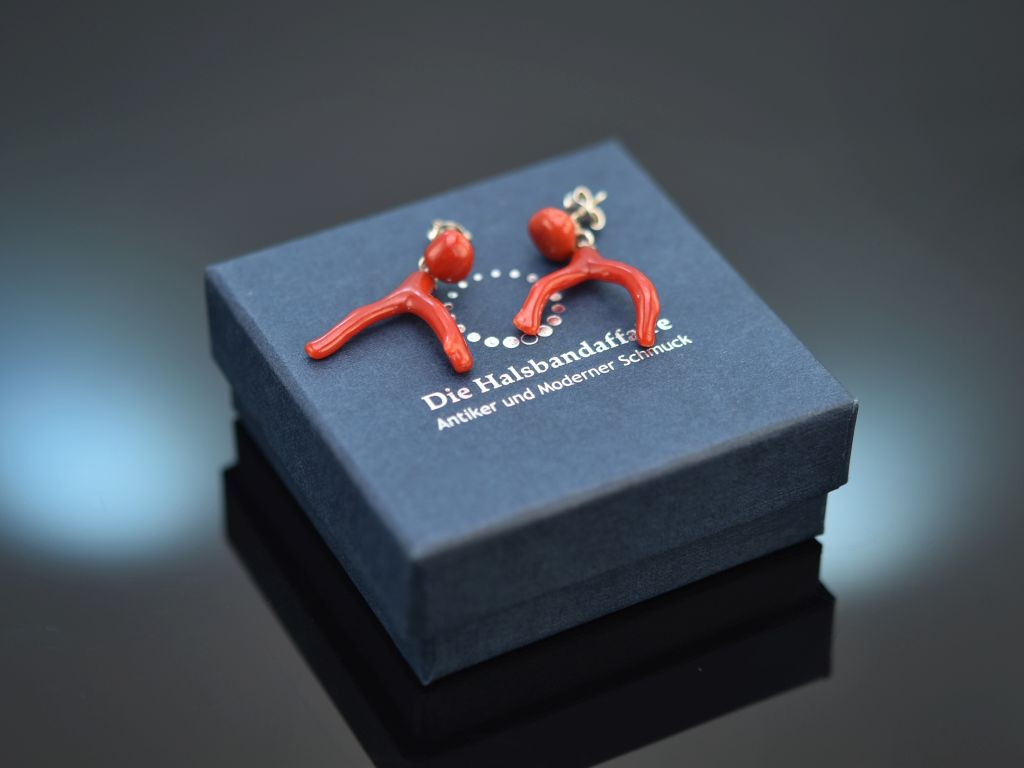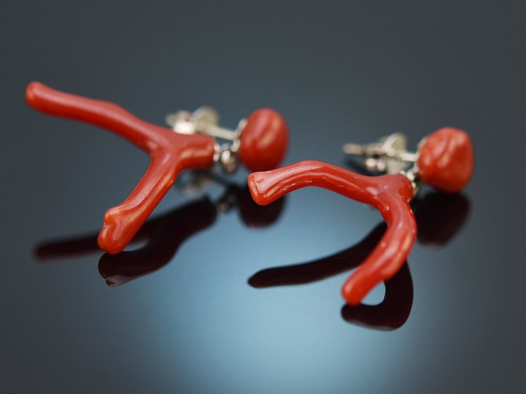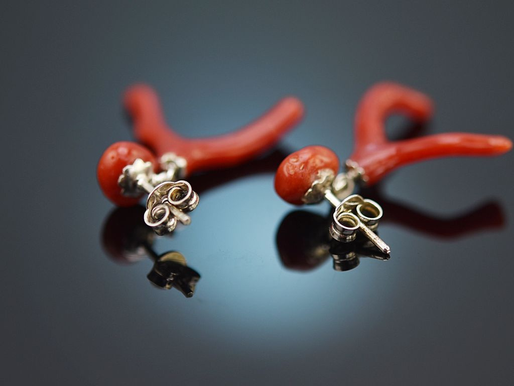 Die hübschen Ohrstecker sind jeweils mit einem Korallenbouton besetzt, an dem frei schwingend jeweils ein Korallenast baumelt. Die natürlich gewachsenen, unbehandelten italienischen Korallen bestechen durch ihre wundervolle, gleichmäßig tiefrote Farbe und den schönen Glanz.