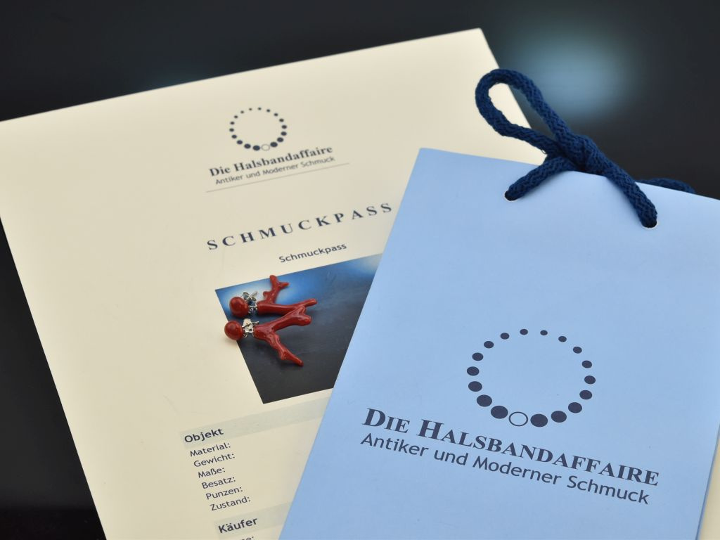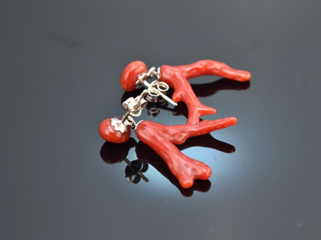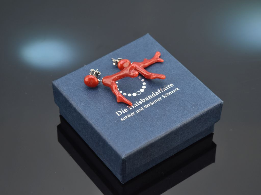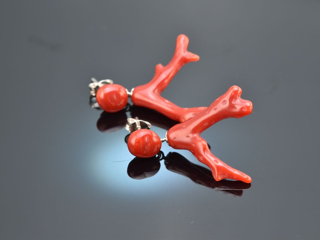 Die Ohrstecker sind jeweils mit einem Korallenbouton besetzt, an denen frei schwingend je ein Korallenast hängt. Die natürlich gewachsenen italienischen Korallen bestechen durch ihre wundervolle, gleichmäßige tiefrote Farbe und die ausgesprochen schöne Oberflächenqualität.
