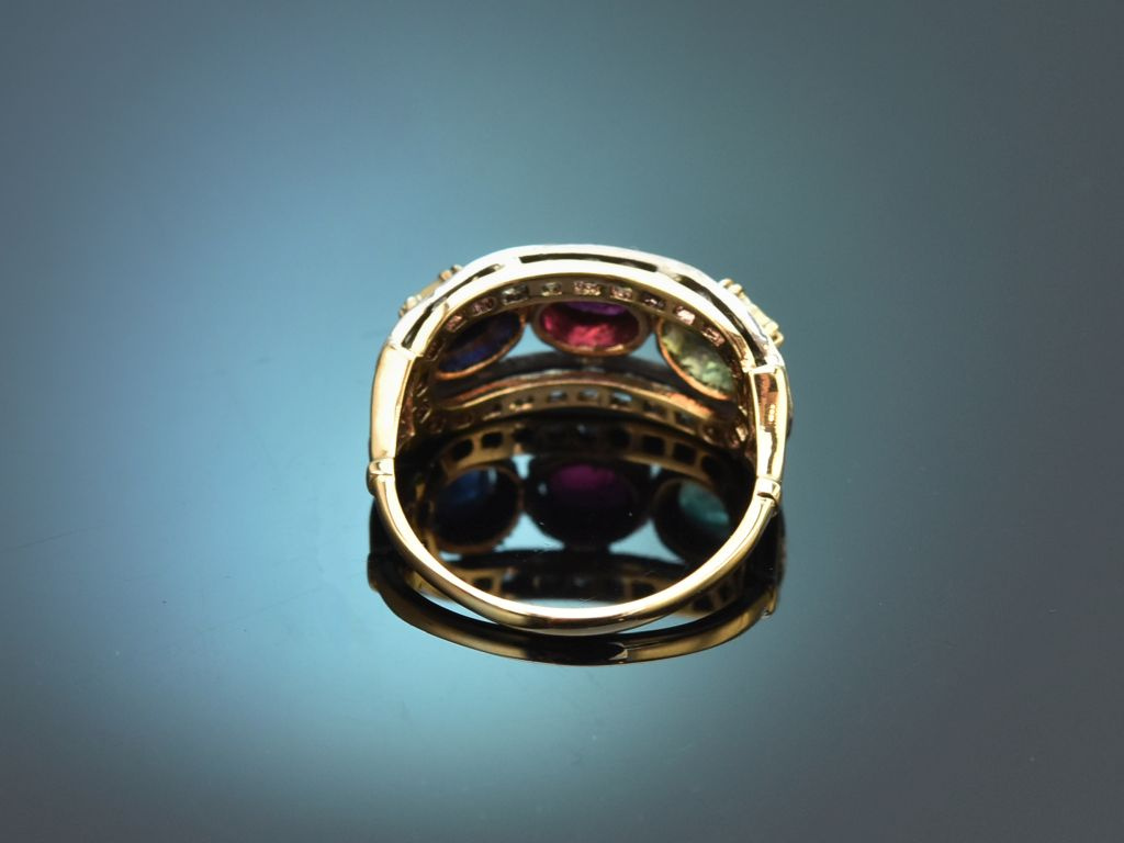 Der quergelagerte Ringkopf des schönen Ringes ist mit drei edlen Farbsteinen besetzt: ein blauer Ceylon Saphir von ca. 0,18 Carat, ein leuchtend roter Rubin von ca. 0,22 Carat und ein wohl kolumbianischer Smaragd von ca. 0,15 Carat. Die schönen, oval facettierten Edelsteine sitzen in goldenen Stotzenfassungen, die nach unten hin offen sind (sog. À-Jour Fassung), sodass genug Licht an die Steine kommt und ihre intensive Farbigkeit besonders schön hervorgehoben wird.