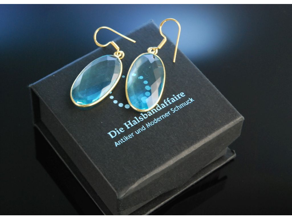 Trendige und schlichte Ohrhänger aus hartvergoldetem Sterlingsilber 925 (gestempelt und garantiert) besetzt mit jeweils einem frei beweglichen großen funkelnden Blauachat in ovaler Form in Schachbrettschliff. Die Ohrringe sitzen durch die Hakenbrisuren attraktiv am Ohr. Die Achate strahlen in frischem Blau und sehen mit dem Goldglanz der Brisuren besonders charmant aus.