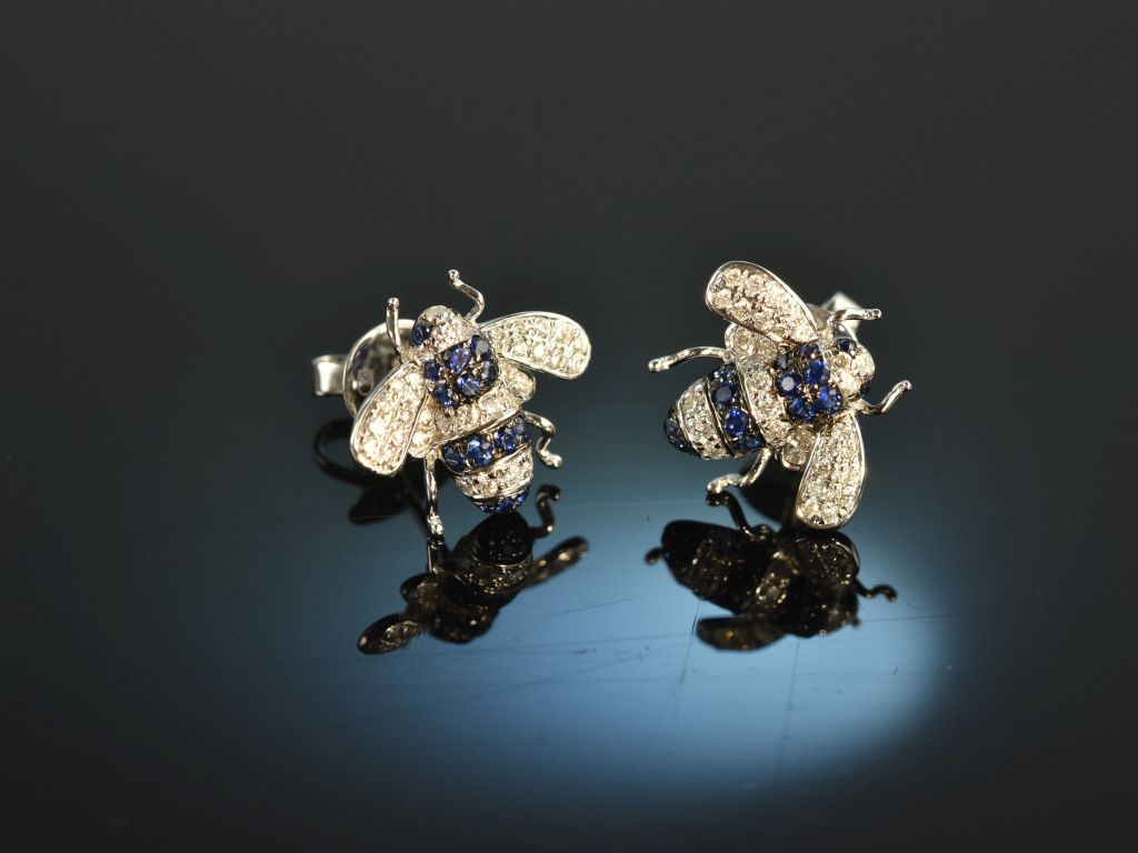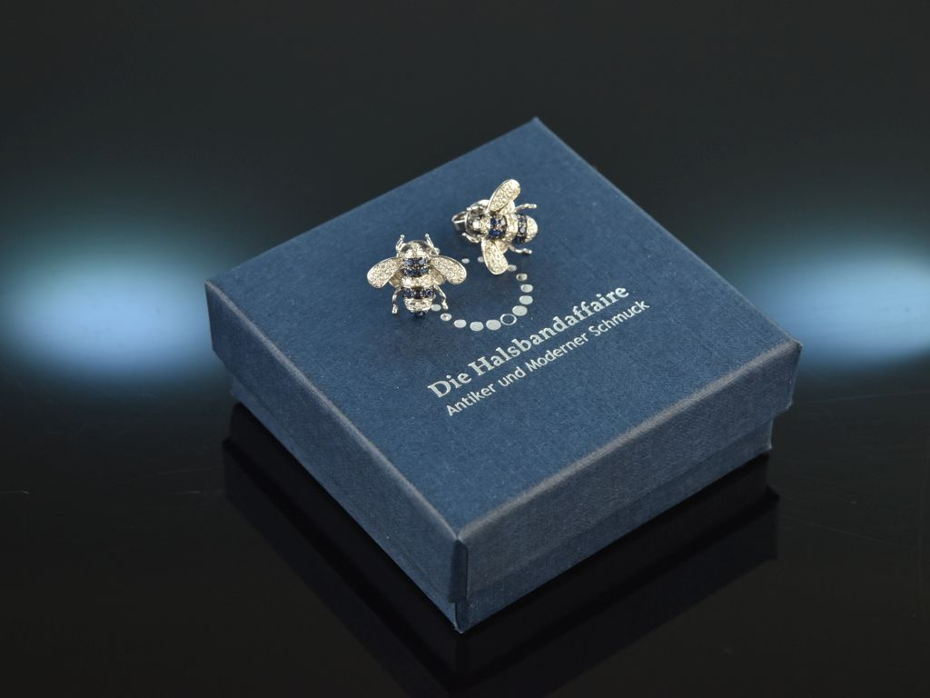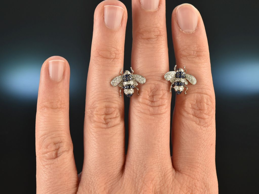Die süßen kleinen Insekten sind vollständig mit 70 funkelnden Diamanten in Brillantschliff von zus. 0,36 Carat ausgefasst. Die Diamanten befinden sich im schönen mittleren Qualitätsbereich (G-H, SI1-SI2). Die charakteristischen Streifen der Tiere werden von 42 Saphiren von zus. 0,40 Carat dargestellt. Auch die kleinen Augen funkeln Saphirblau.