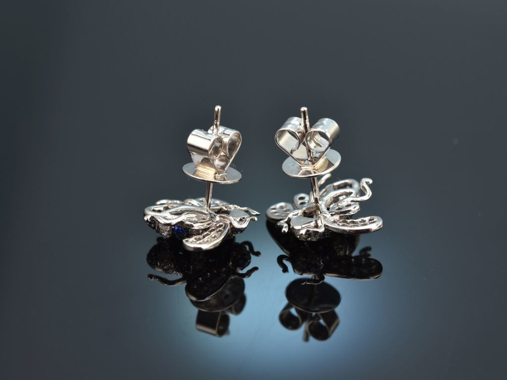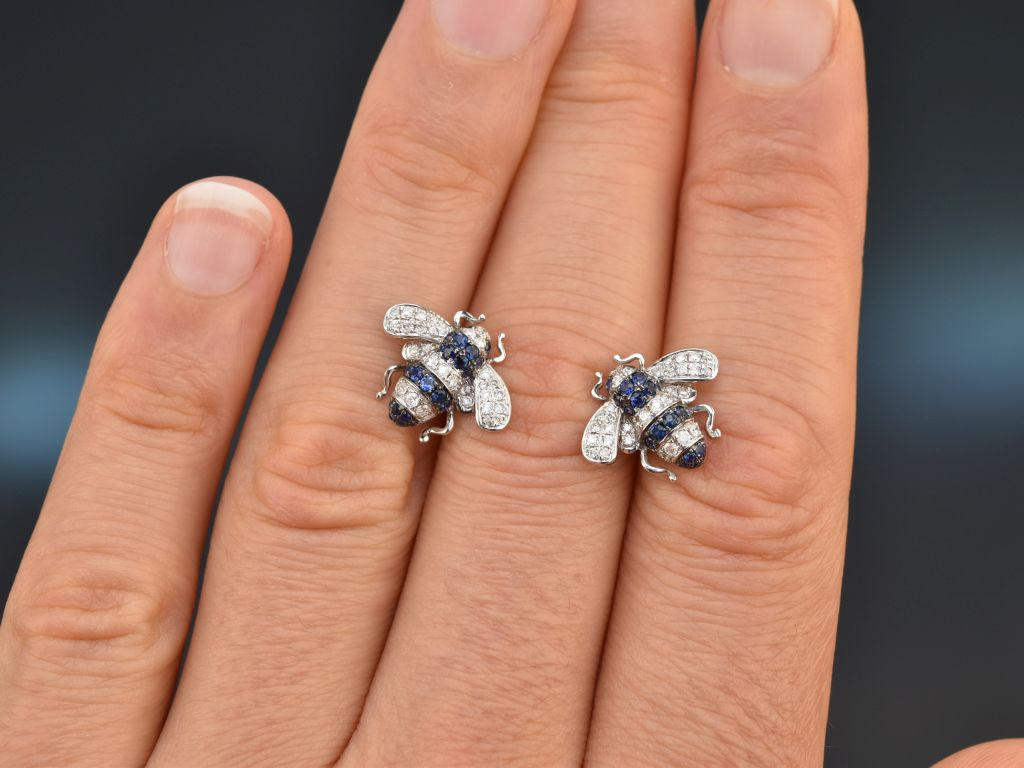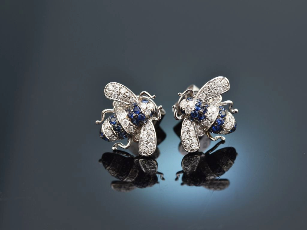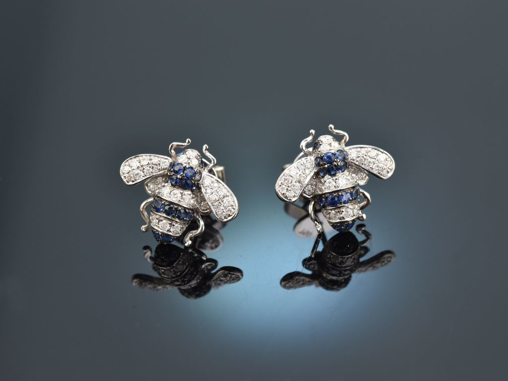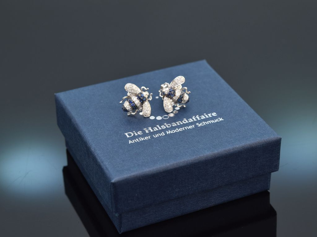 Charmante Bienen Ohrstecker mit Saphiren und Brillanten, gearbeitet aus Weißgold 750 / 18 Kt (gestempelt und garantiert).