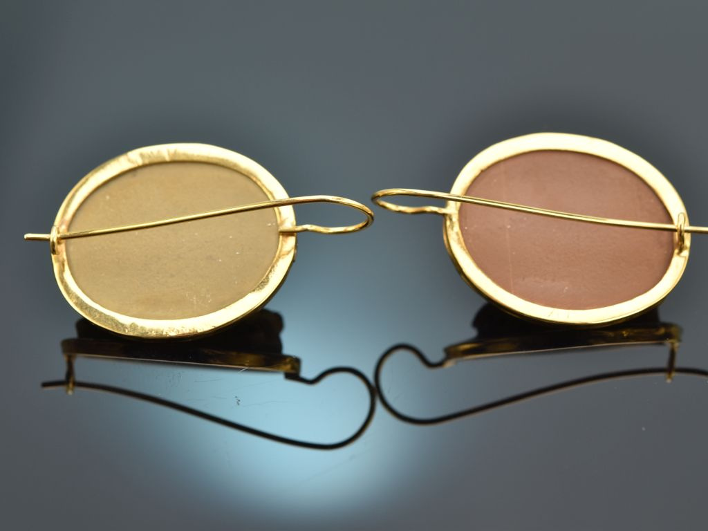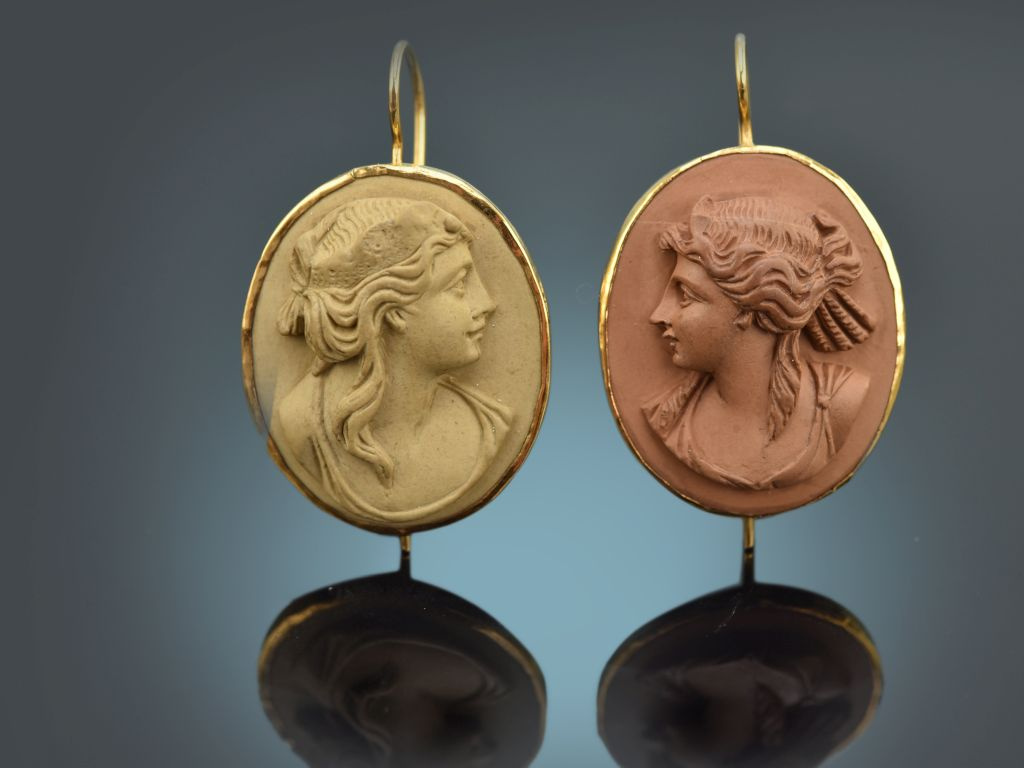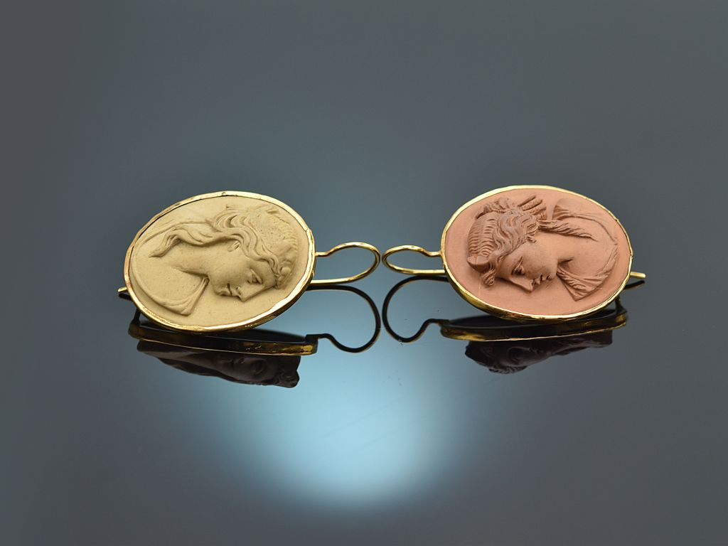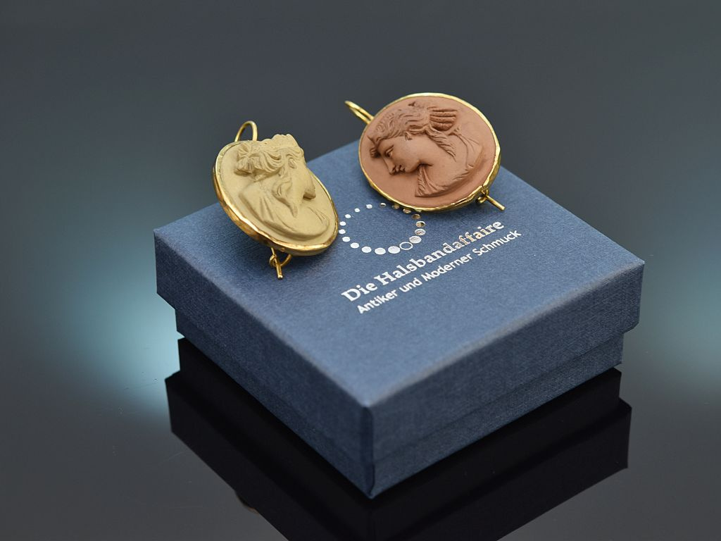 Die ovalen Ohrhänger sind mit je einer exquisit geschnittenen Lava Kamee mit antikisierendem Damenbildnis im Profil besetzt. Die Lavakameen besitzen unterschiedliche Farbtöne, die hervorragend miteinander harmonieren.