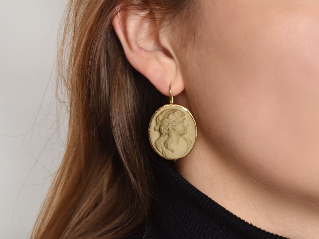 Schöne große historische Lava Kamee Ohrringe, gearbeitet aus vergoldetem Silber (geprüft und garantiert).