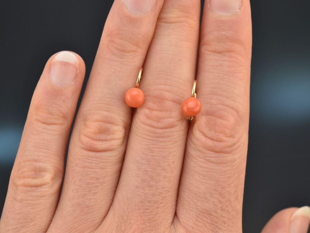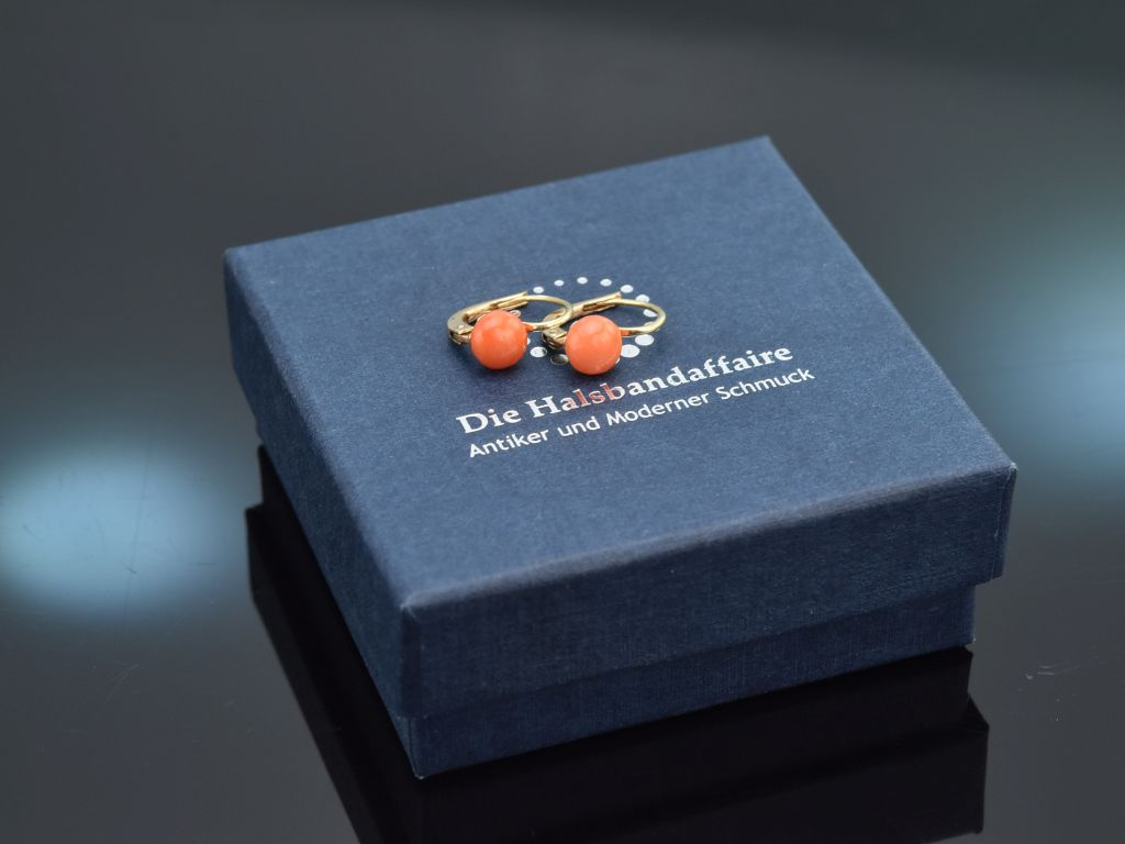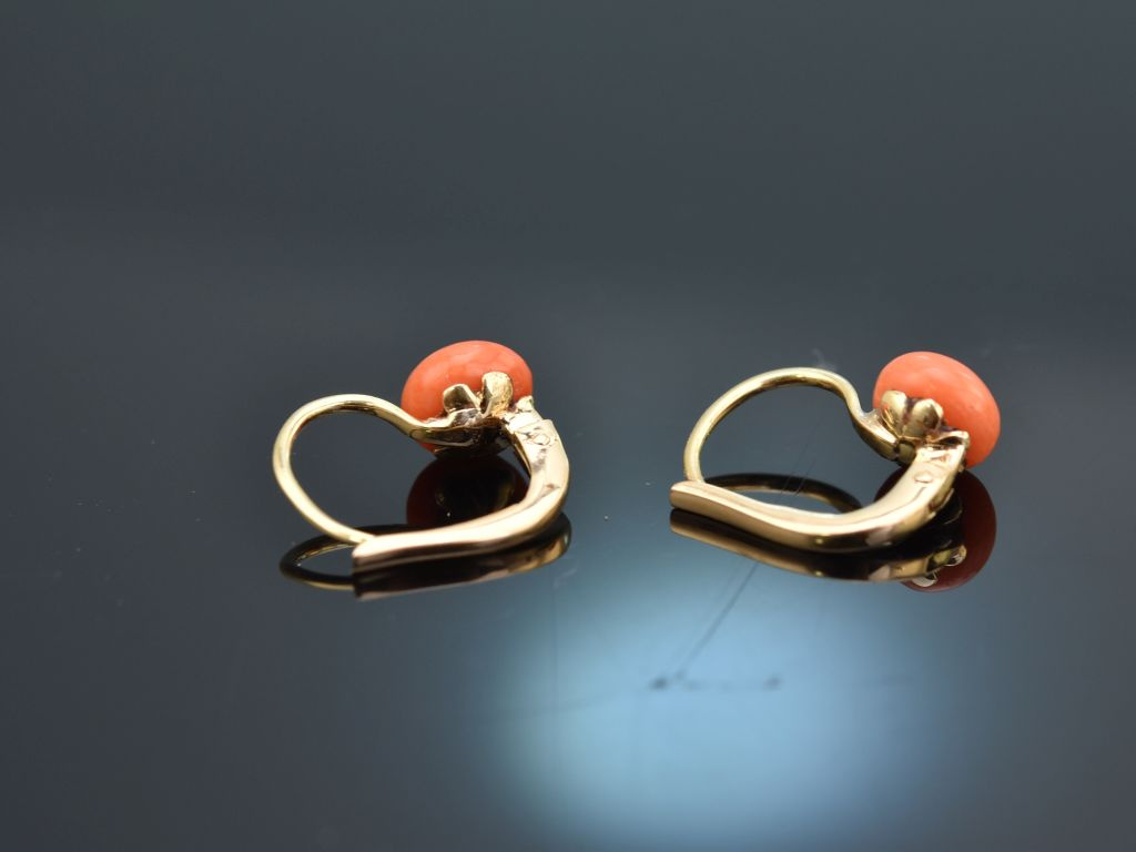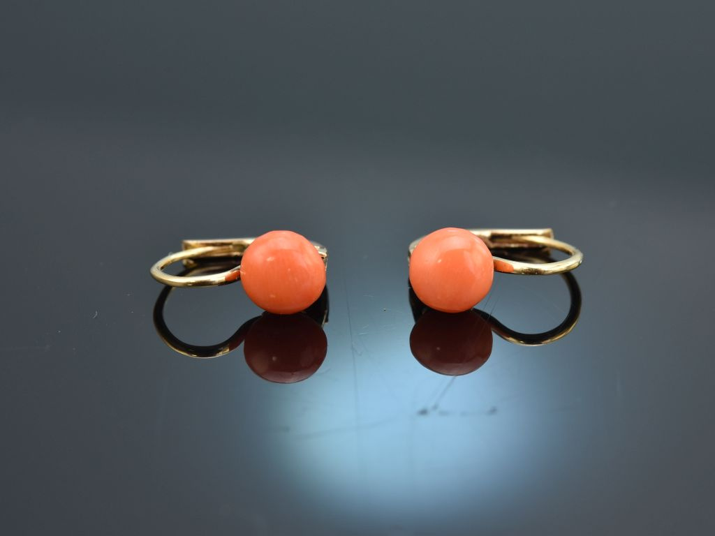 Schlichte Art Deco Ohrringe mit Korallen-Boutons, gearbeitet aus Gelbgold 585 / 14 Kt (geprüft und garantiert).