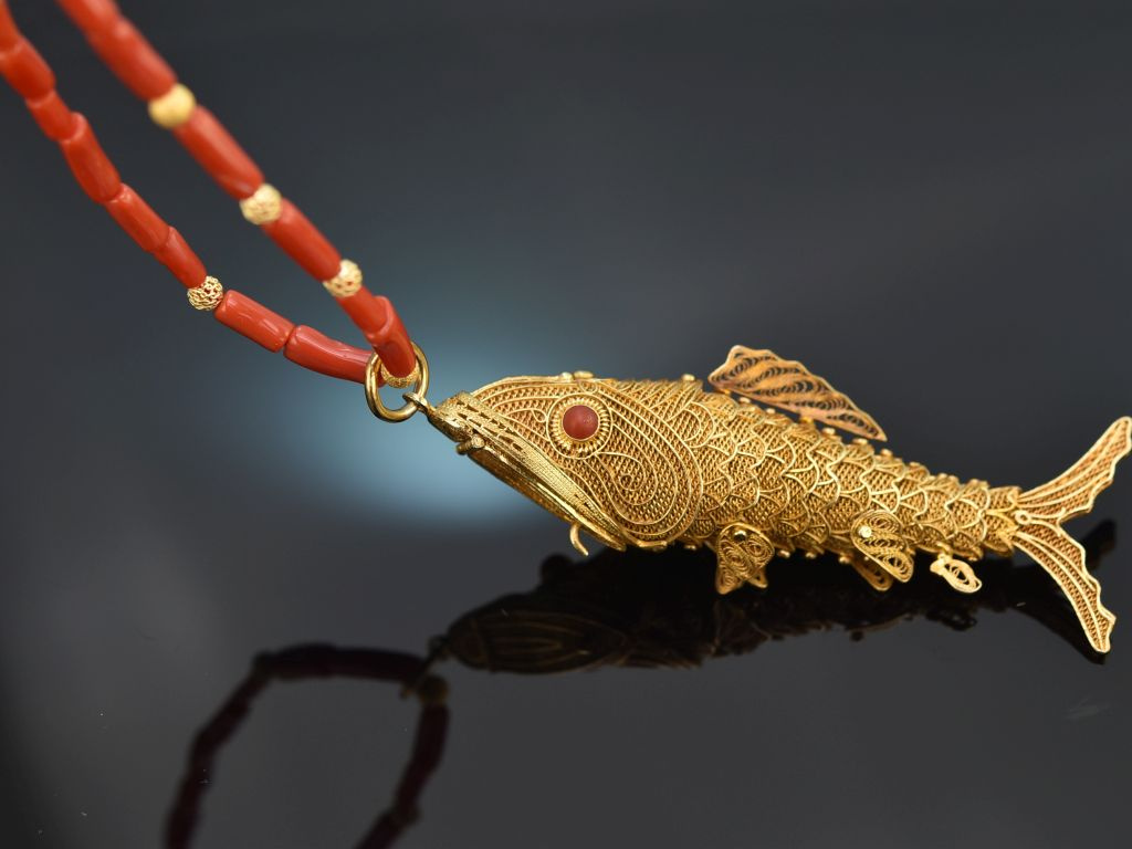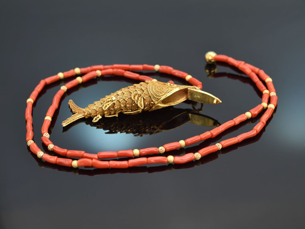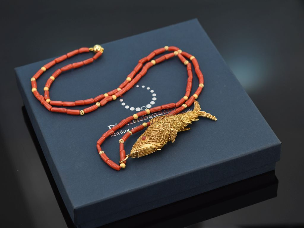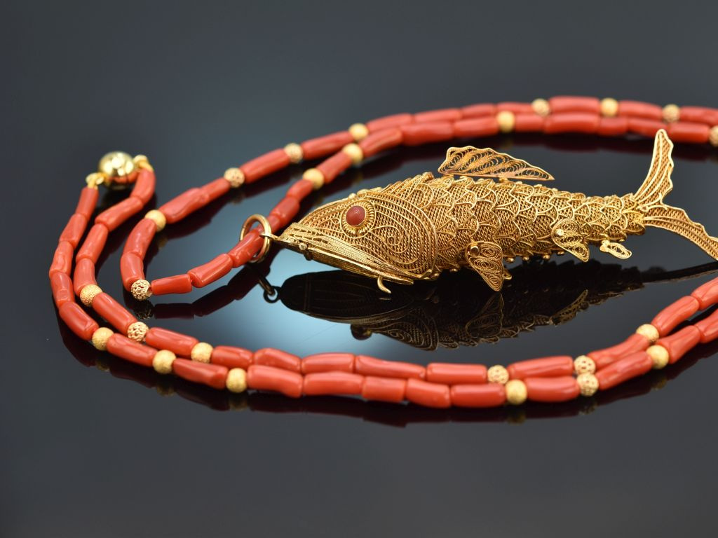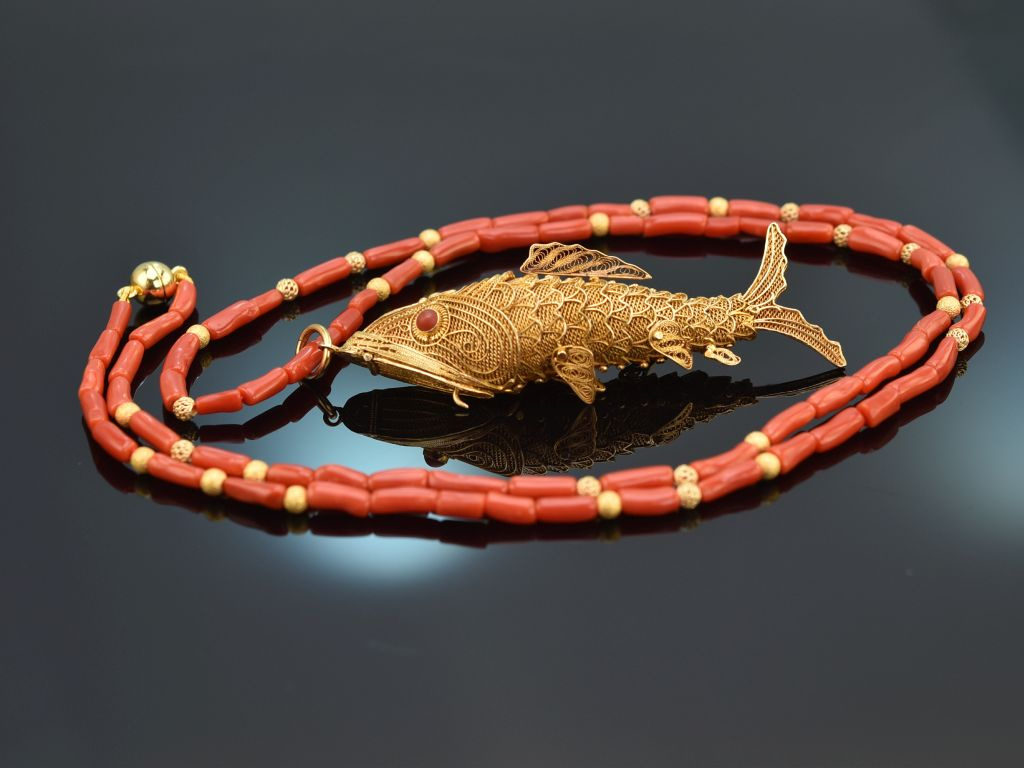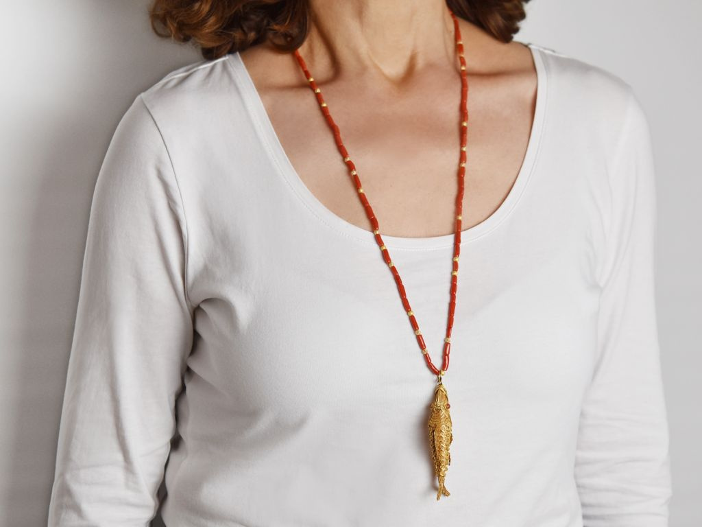 An einer langen Kette aus schönen roten Mittelmeerkorallen in Tönnchenform schwingt eine attraktiver Anhänger in Fischform. Der Fisch besteht aus filigranen beweglichen Teilen und trägt in den Augen je einen Korallencabochon. Fein vergoldete Silberkugeln setzen warme Akzente im Kettenverlauf. Mit einem Magnetkugelschlösschen kann die Kette leicht geöffnet und geschlossen werden.