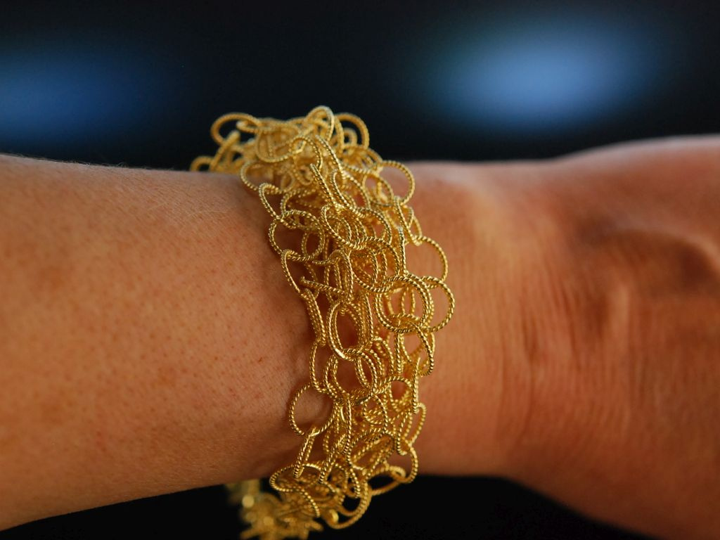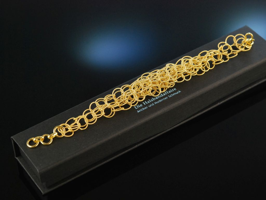 Cooles Armband aus vergoldetem Sterlingsilber 925 (gestempelt und garantiert), gearbeitet aus soliden kleinen Ringgliedern, die sich zur Mitte hin verdichten und durch ihre strukturierte Oberfläche besonders lebhaft wirken. Geschlossen wird das Schmuckstück mit einer sicher funktionierenden Karabinerschließe. Durch einen kurzen Ösenstrang ist die Länge variabel einstellbar. Das moderne Statement Armband lässt sich durch sein klassisches Design frei zu vielen verschiedenen Stilen kombinieren.